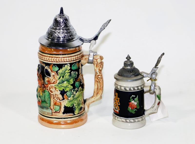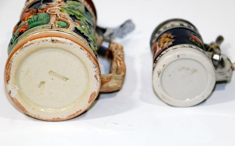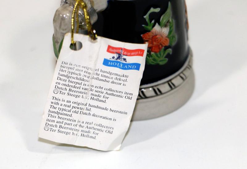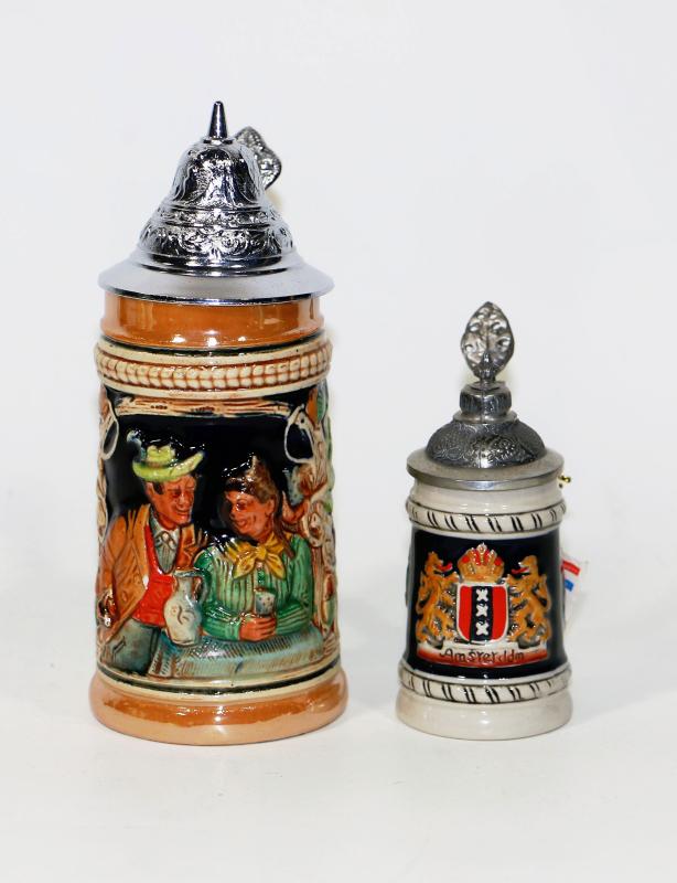 The German stein is 7" tall, the one made in Holland stands 4-1/4" tall, both in beautiful collector's condition.