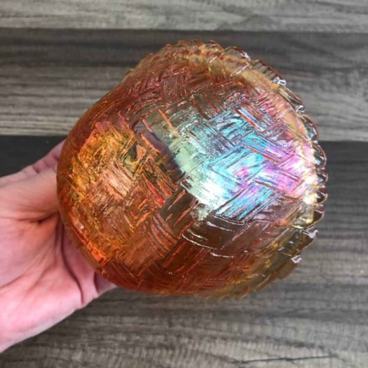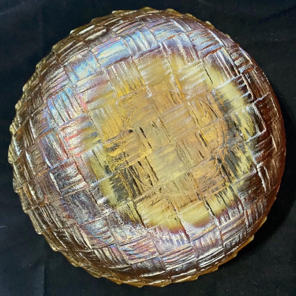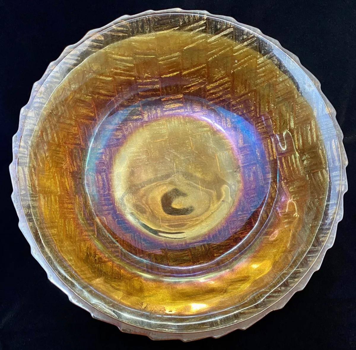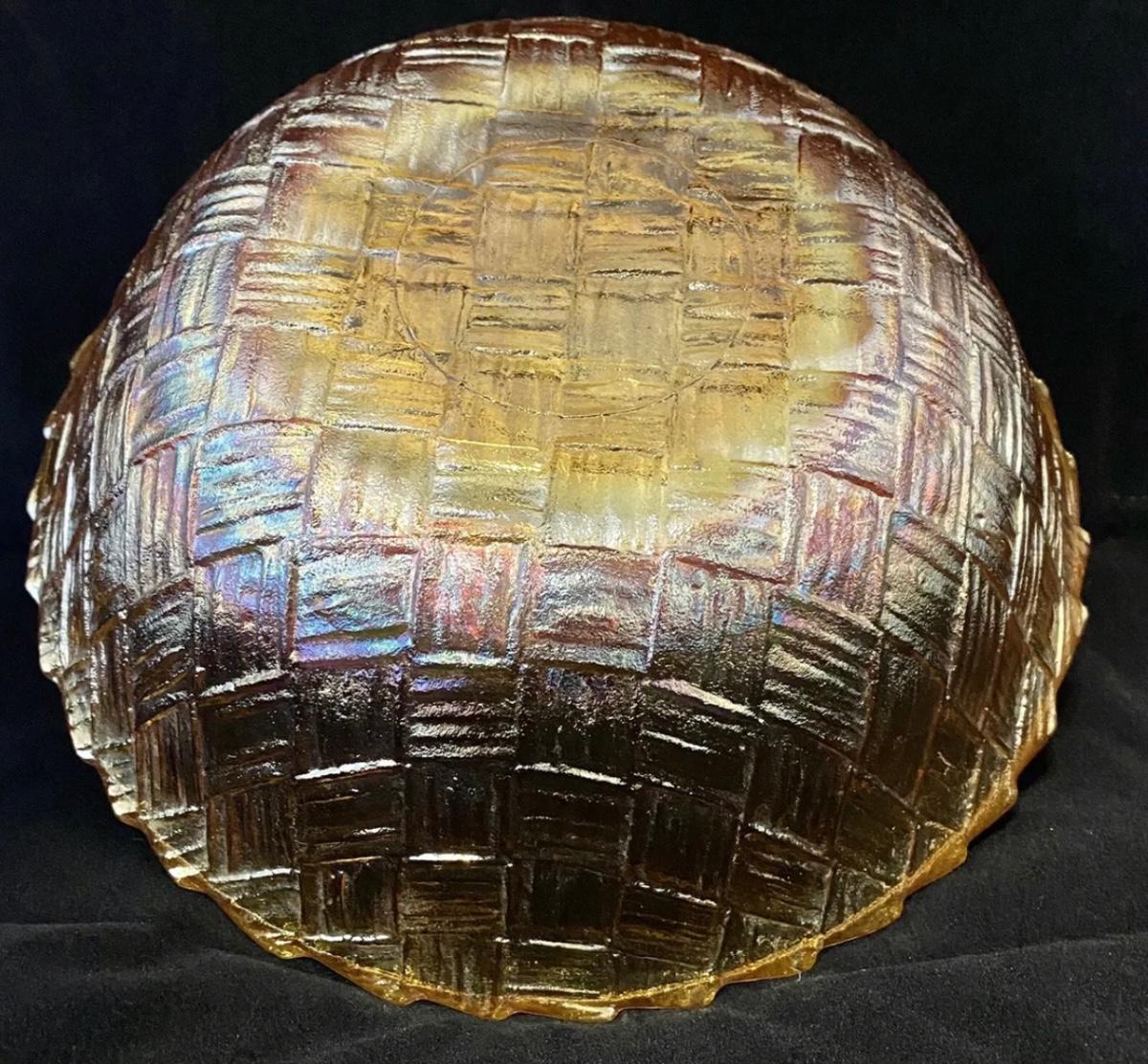 One large measures at 9” wide and one smaller measuring at 4.5” both weave pattern iridescent very beautiful bowls.