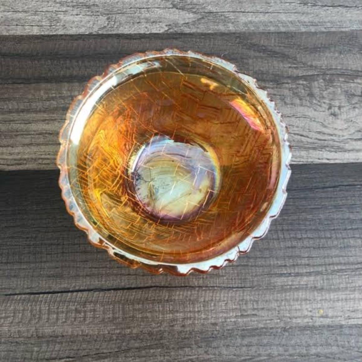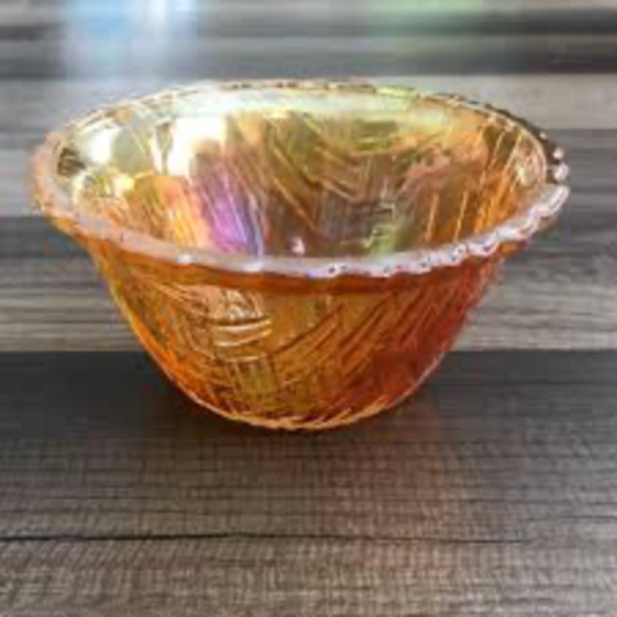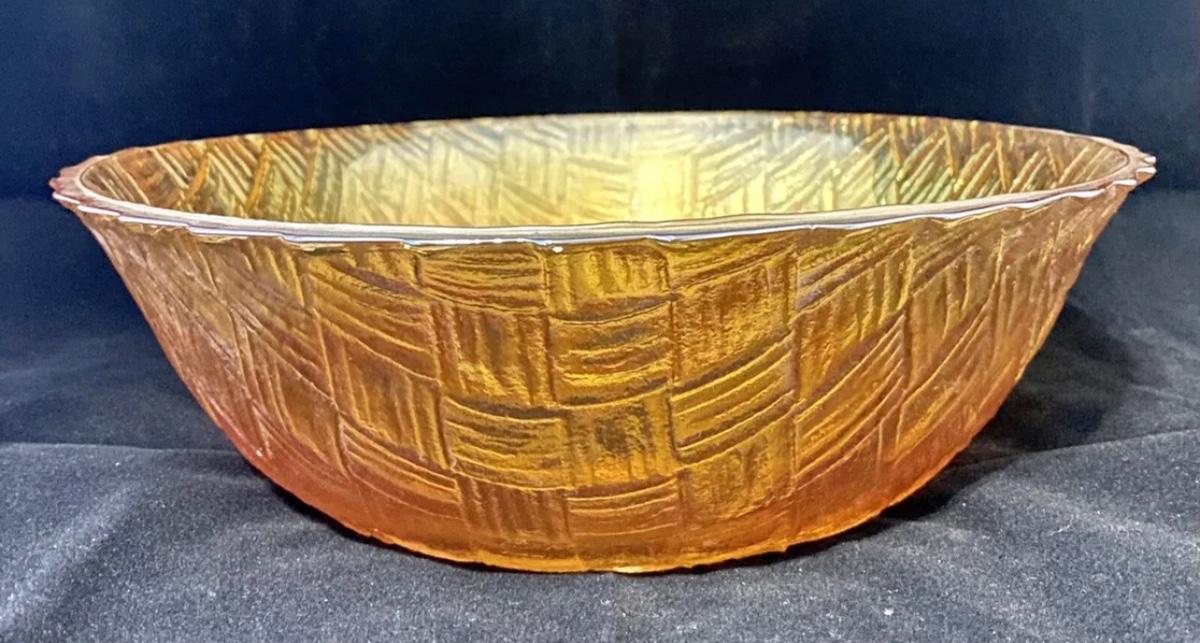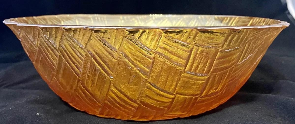 One large measures at 9” wide and one smaller measuring at 4.5” both weave pattern iridescent very beautiful bowls.