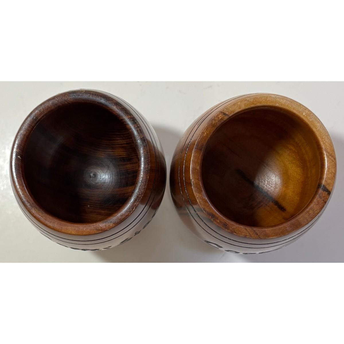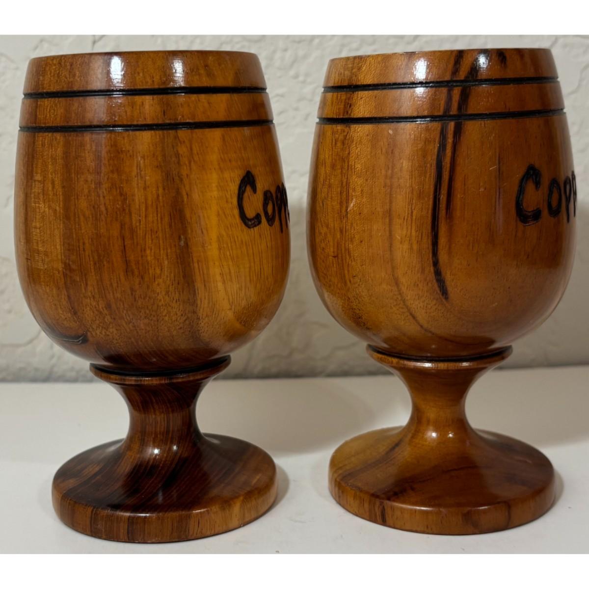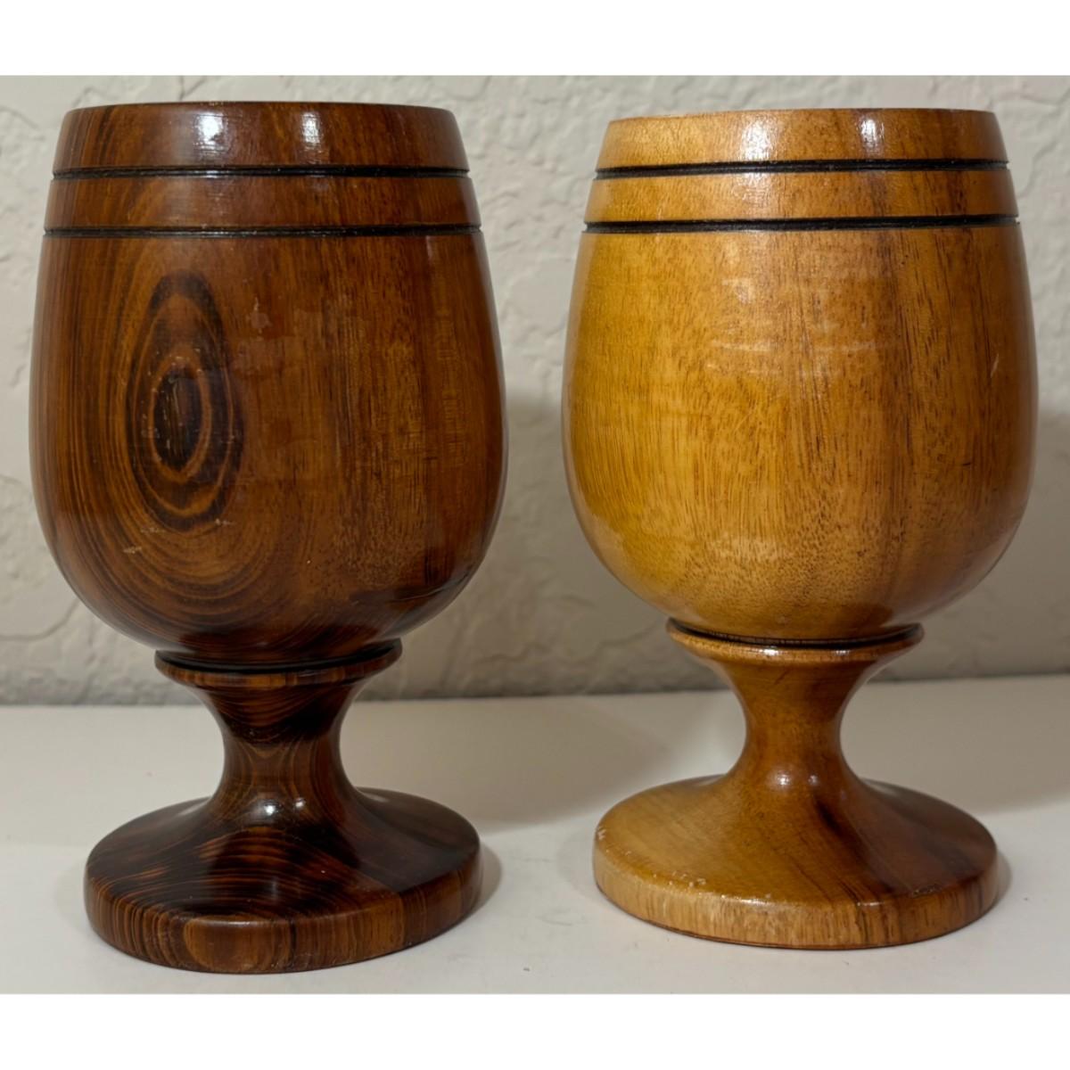You get two wood cups that are in good condition with minor surface wear. Each cup has an approximately 2 5/8" diameter at the base and stand roughly 5 1/8" tall. Please see all pictures. Thank you for looking. As a reminder, if this is a lot, we do not break up lots. Also, all items are prepacked, so each item is sent individually. Any item that qualifies for media mail and weighs over one pound will be shipped via media mail. Otherwise, the item will be shipped USPS ground advantage, or UPS ground. Shipping for this item is $9.00. Items ship within two days after payment is received. Item SKU is OTH1245.