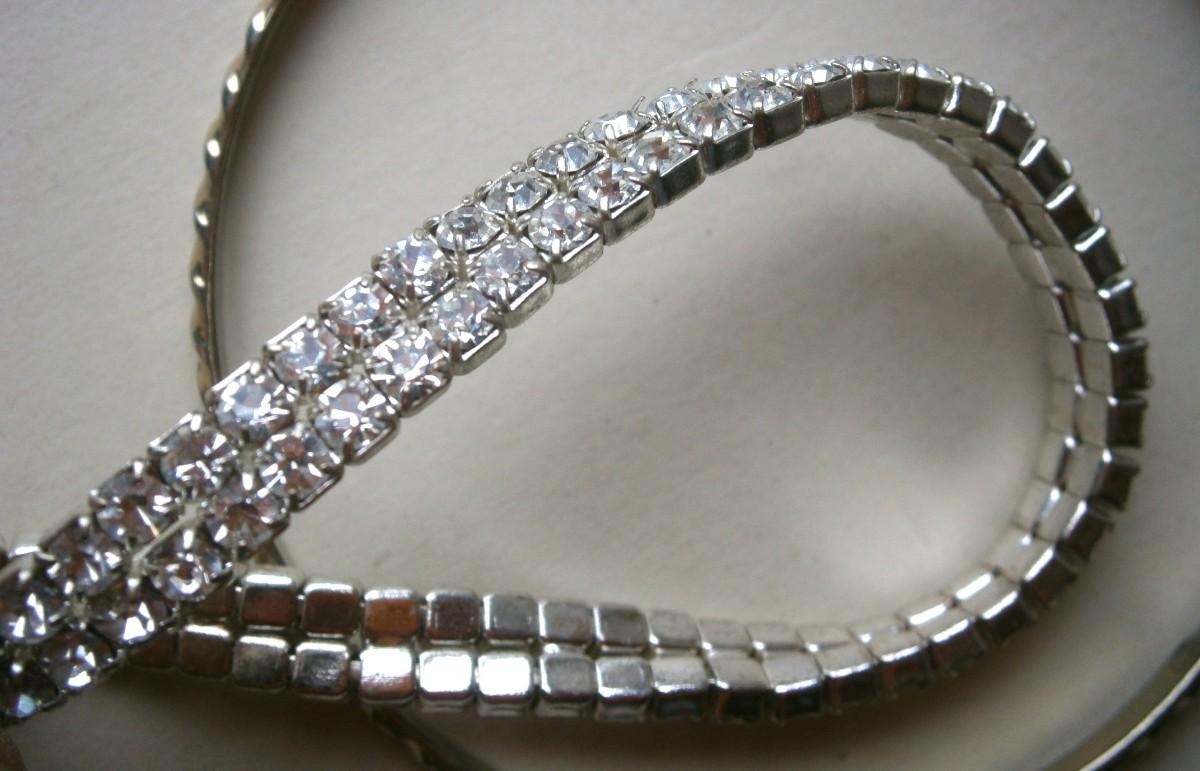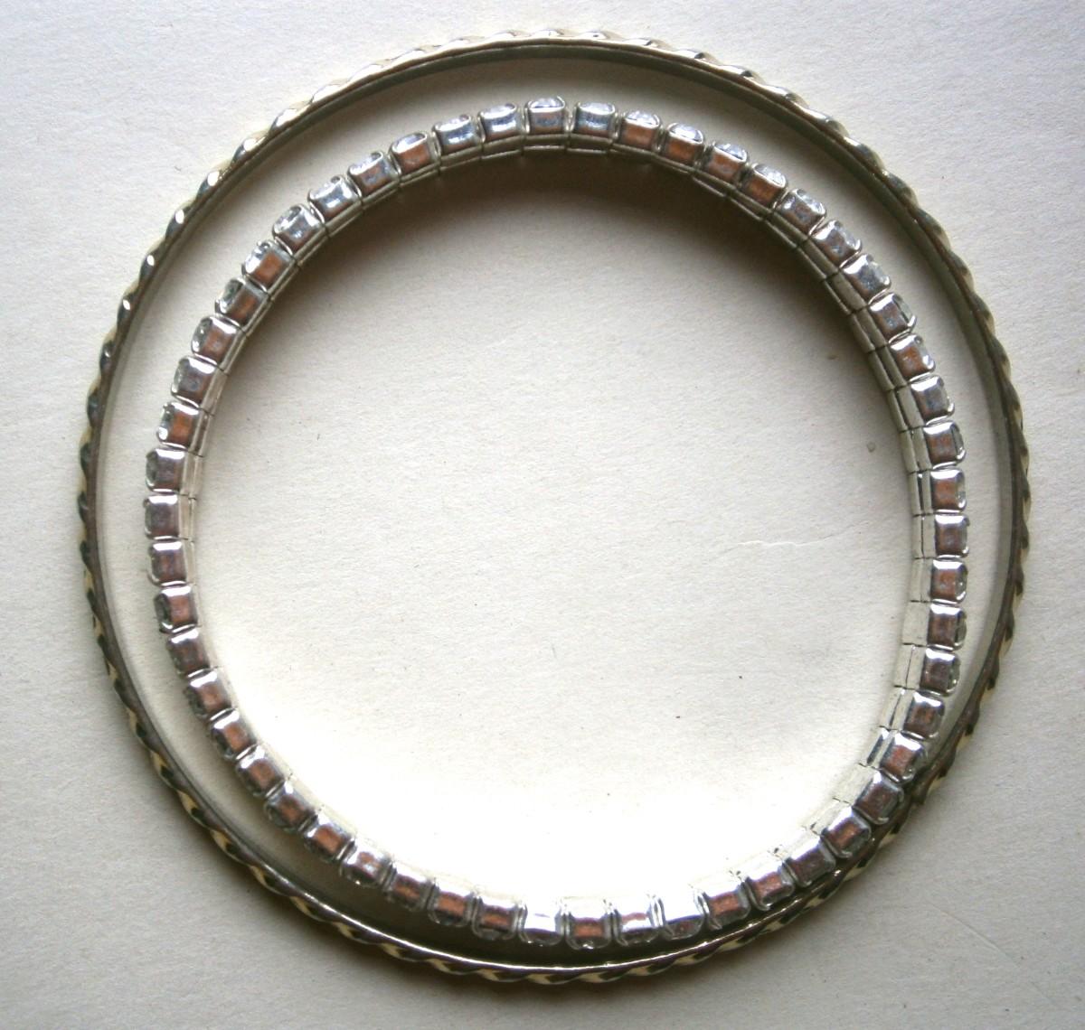 2 Vintage Costume Jewelry Bracelets, a 2 in. expandable bracelet with rhinestones together with a2 5/8 in. diameter bangle bracelet made of gold tone metal.