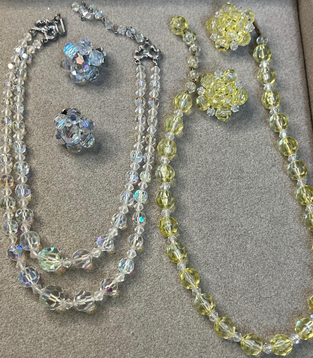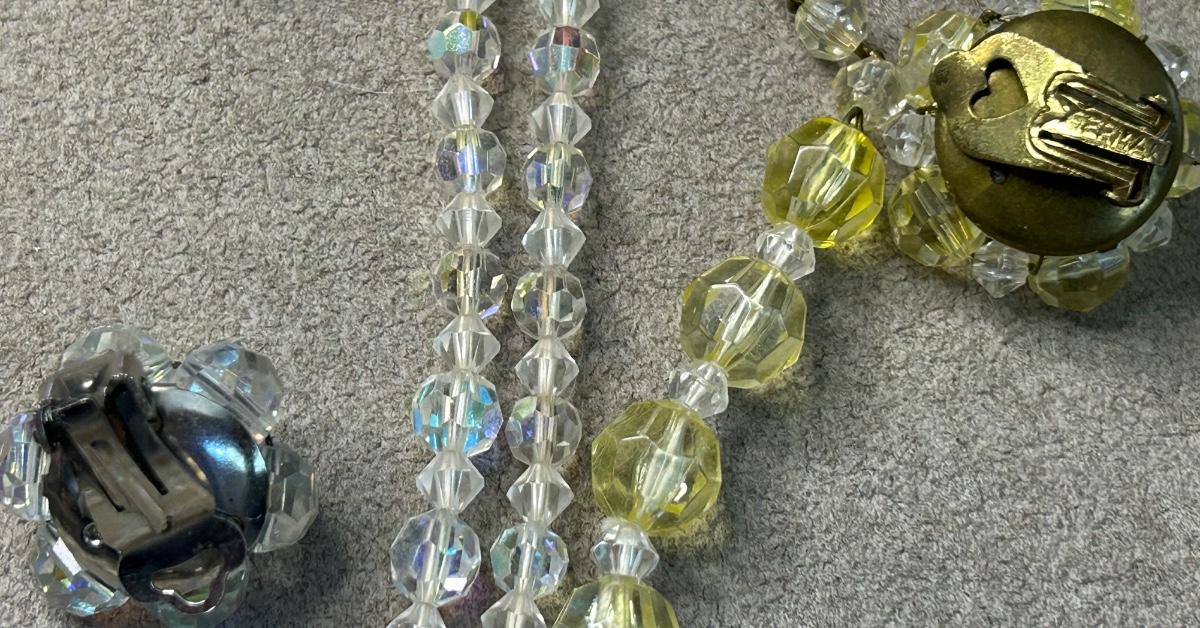 The yellow set is stamped Germany on the clips & the clasp. The aurora borealis set has clip ons