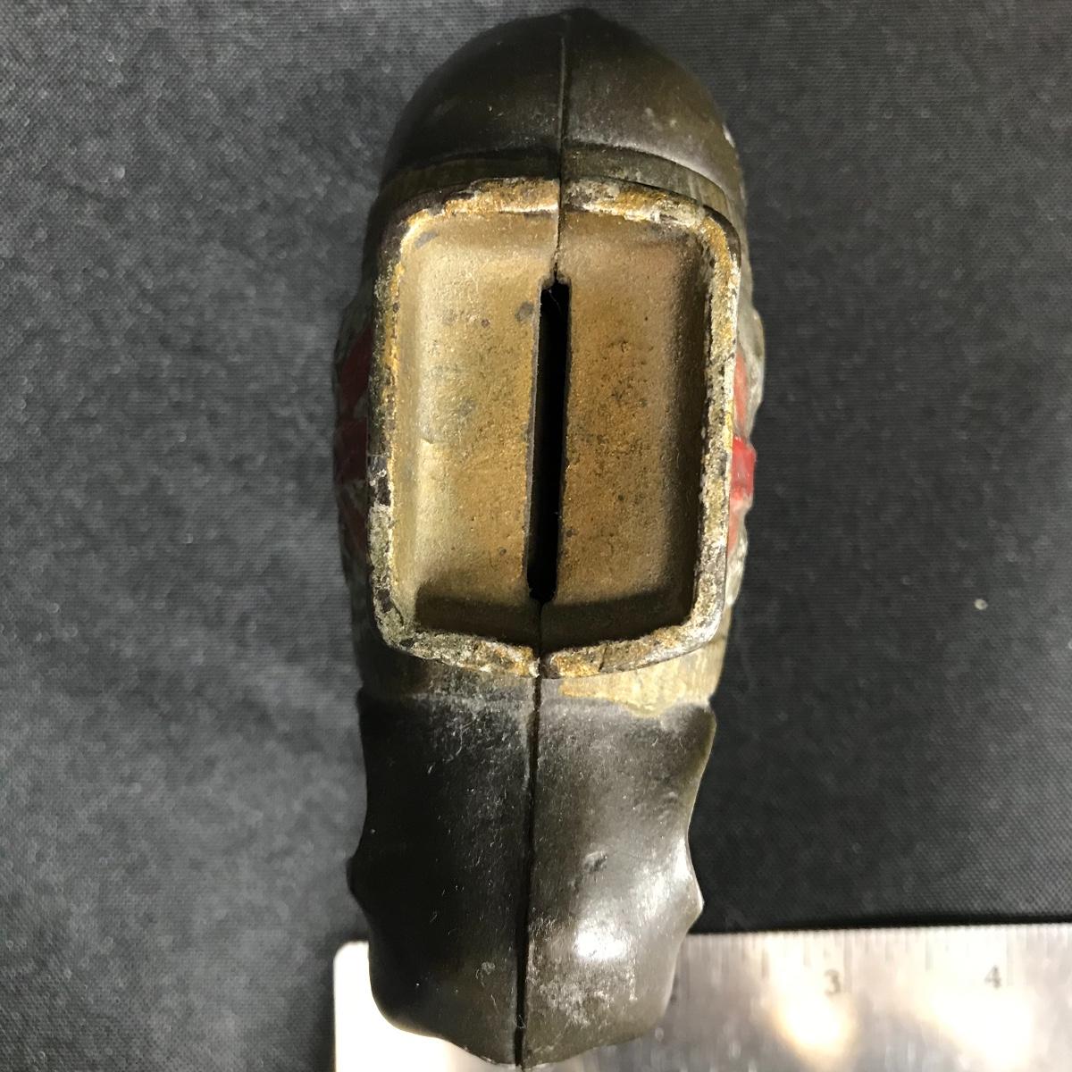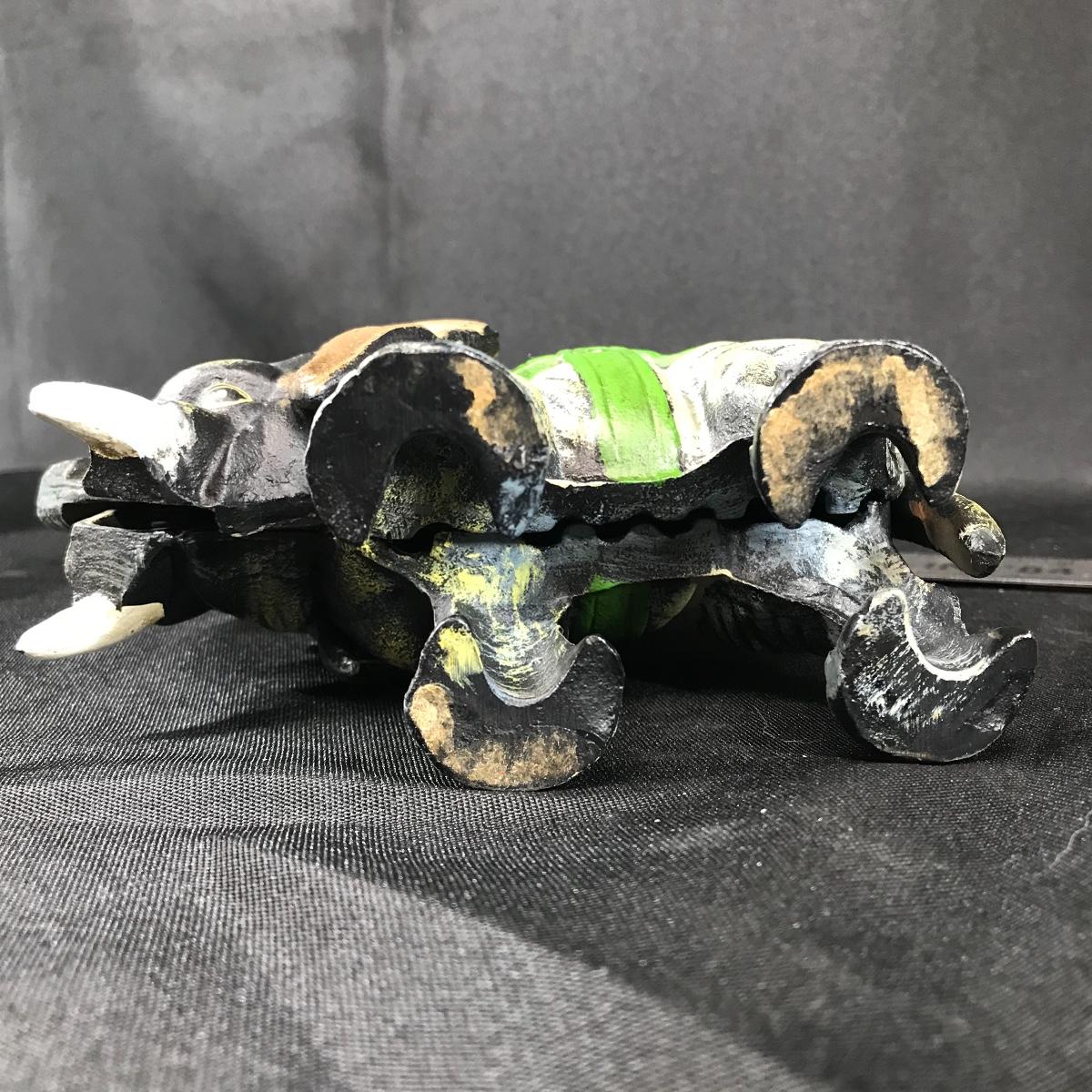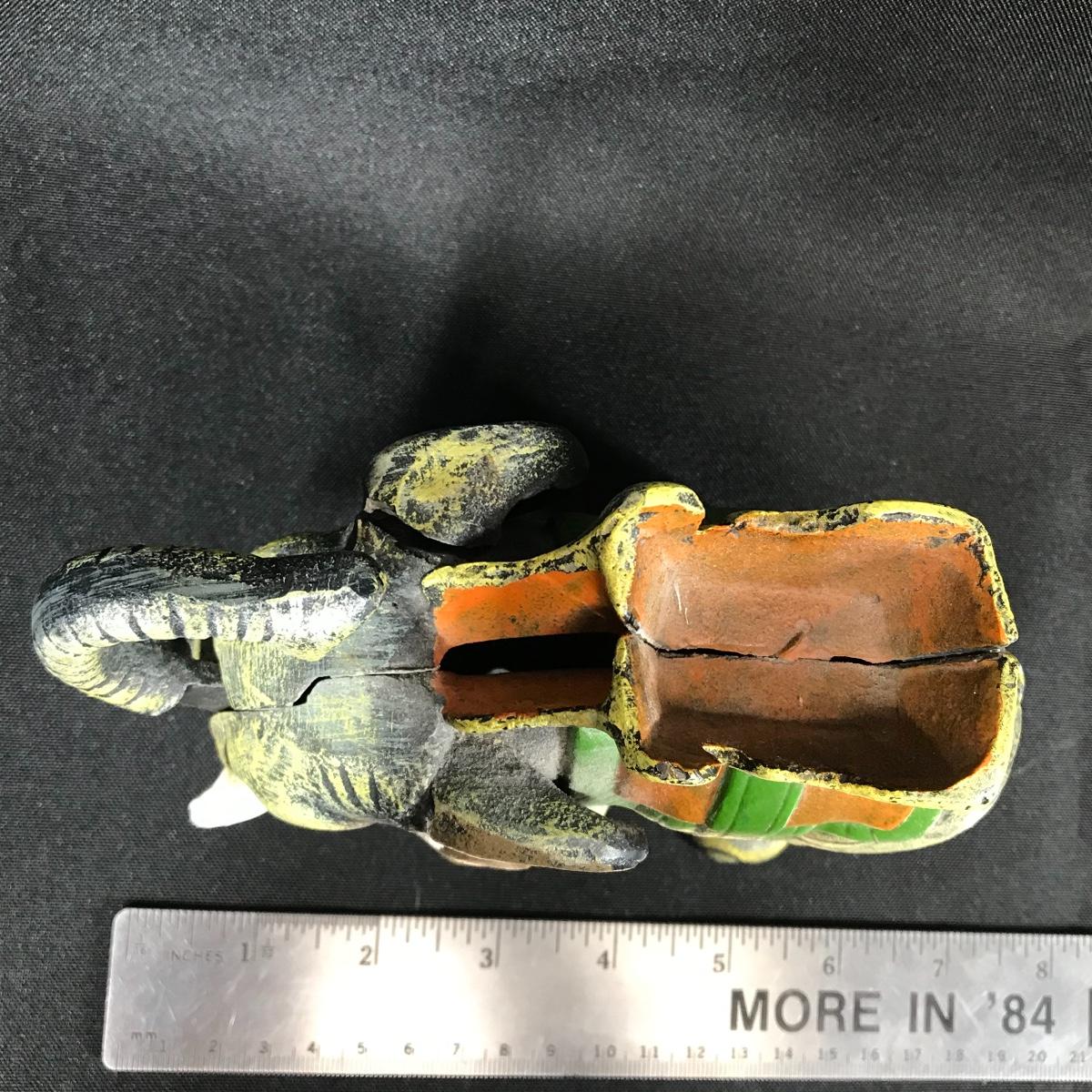 Up for auction are metal elephant banks. The large green/yellow one appears to have some cracks and is slightly off level; see pictures. Both are unmarked.