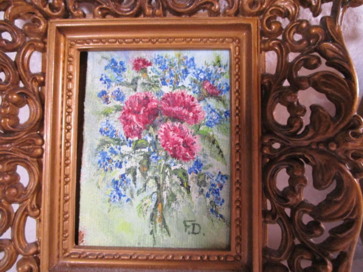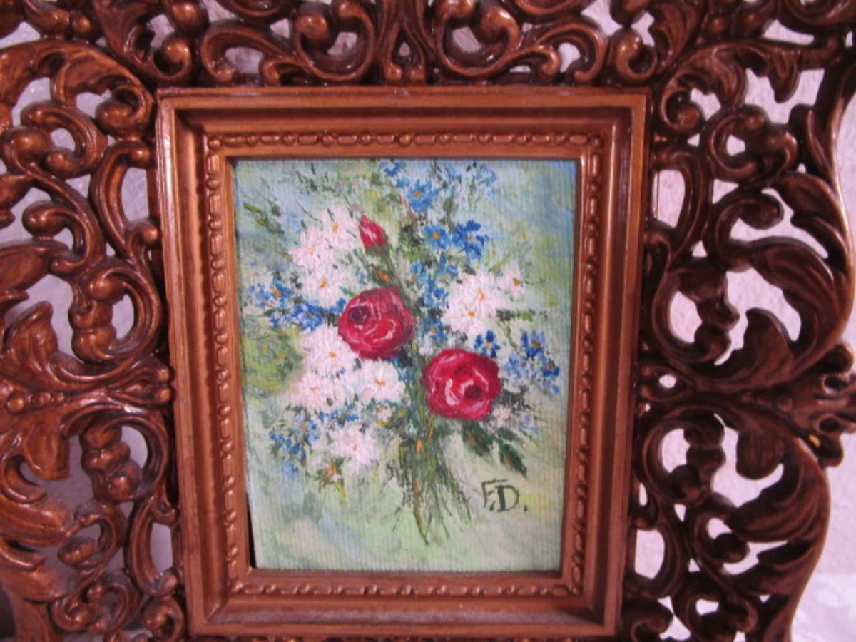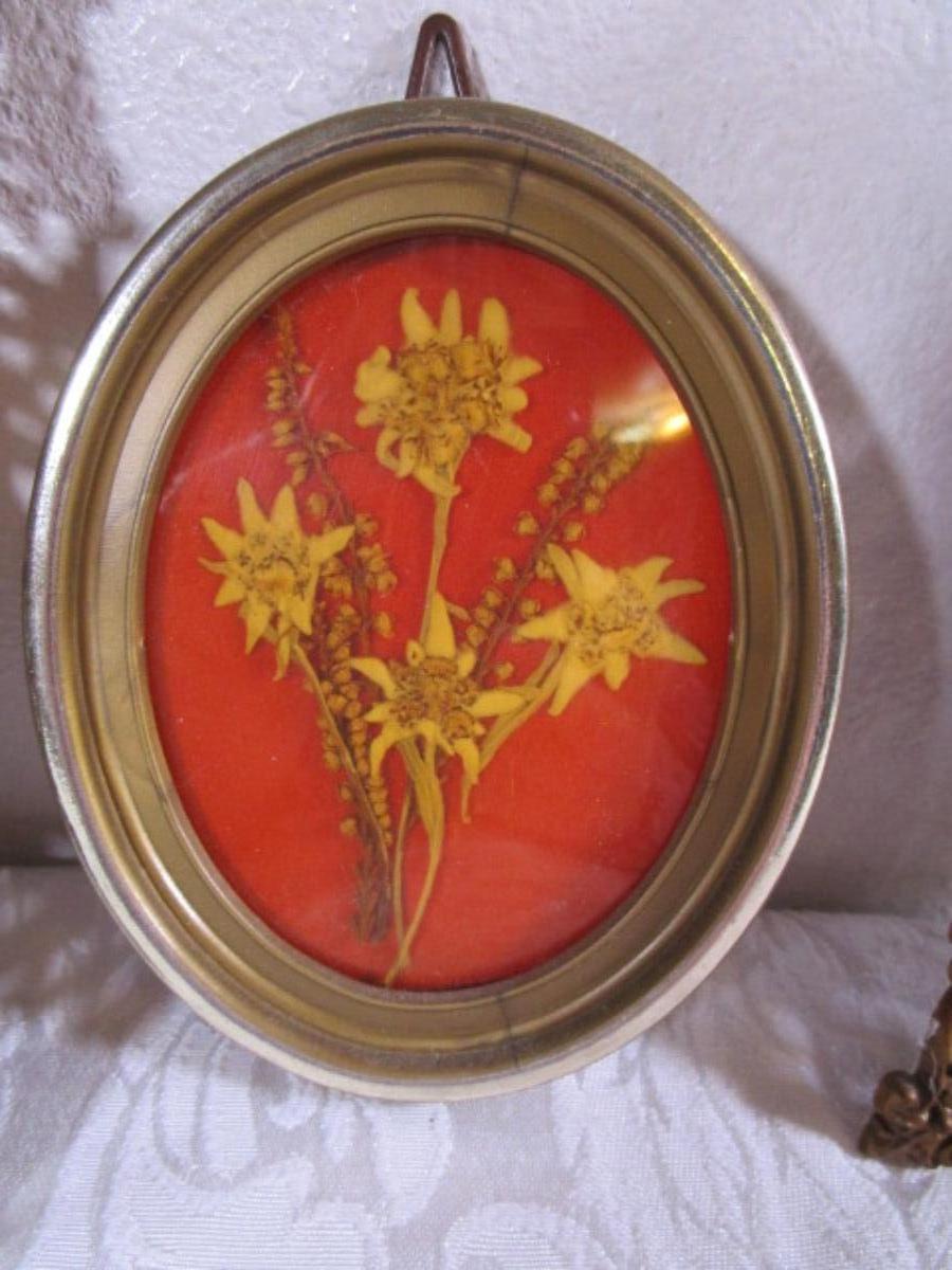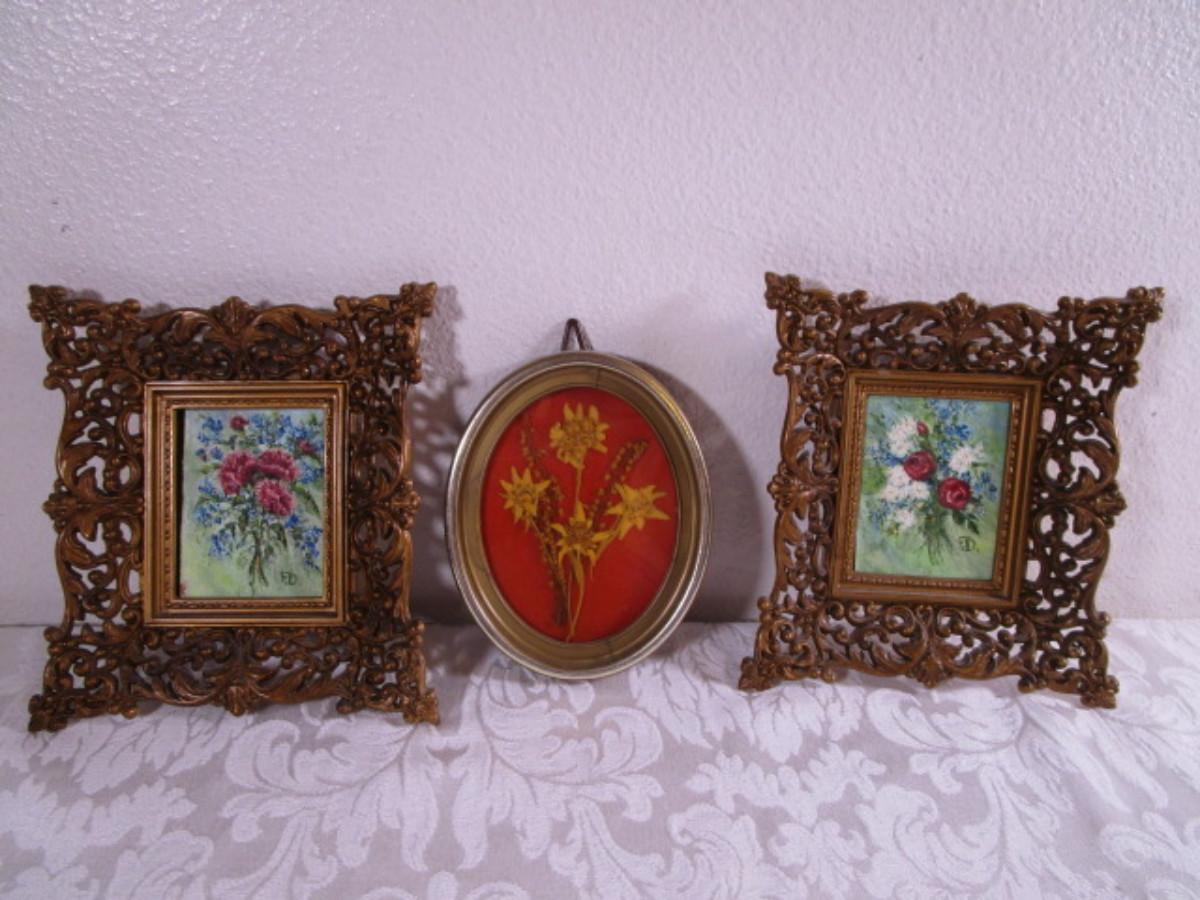2 painted pictures are 3" x 2-3/8", frames measure 6-1/2" x 6"; dried flowers frame is oval 5-1/2" x 4-1/4"