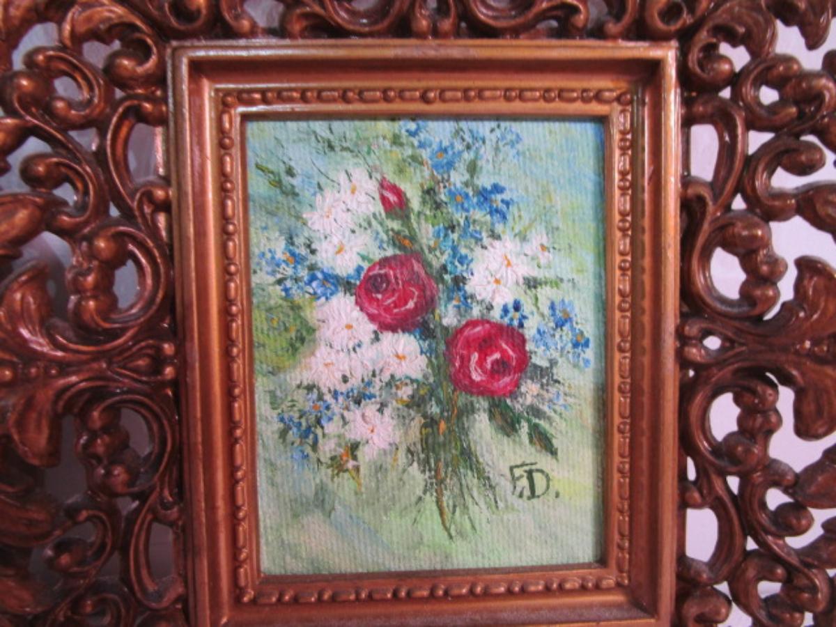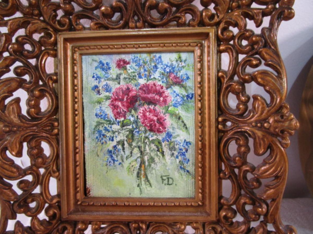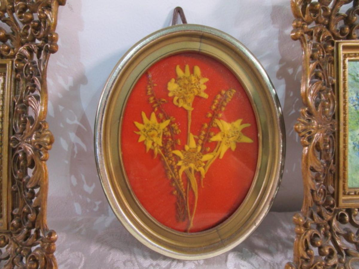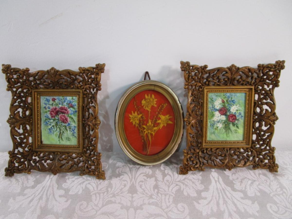 Florence Dowling paintings are 3" x 2-3/8" & frames measure 6-/12" x 6", dried flowers frame is oval 5-1/2" x 4-1/4"