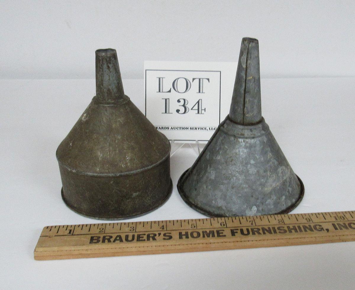 2 Vintage Galvanized Funnels Different Shapes, Medium Sized.