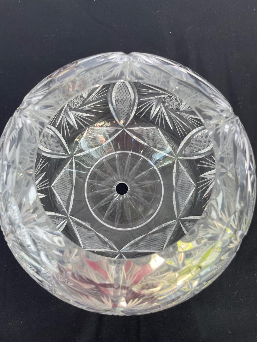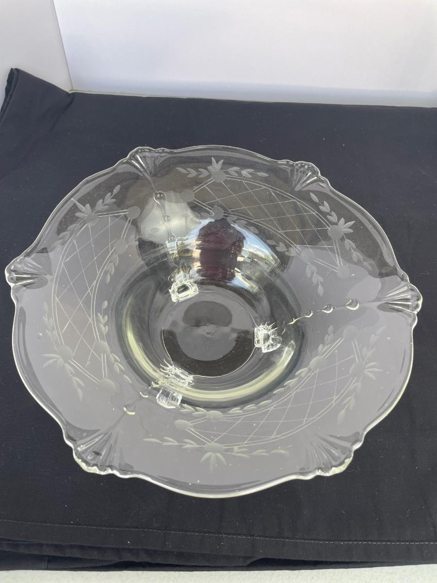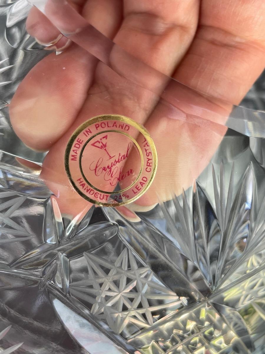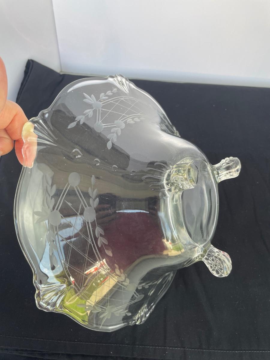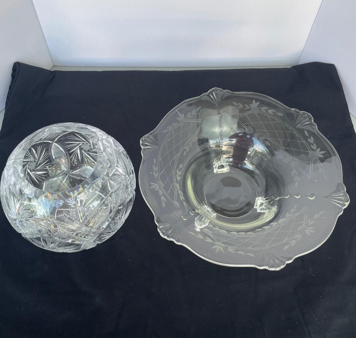 Footed bowl is etched and 11 inches wide. Cut crystal bowl is from Poland and has a hole cut in the bottom. It’s 7” wide and 6” high.