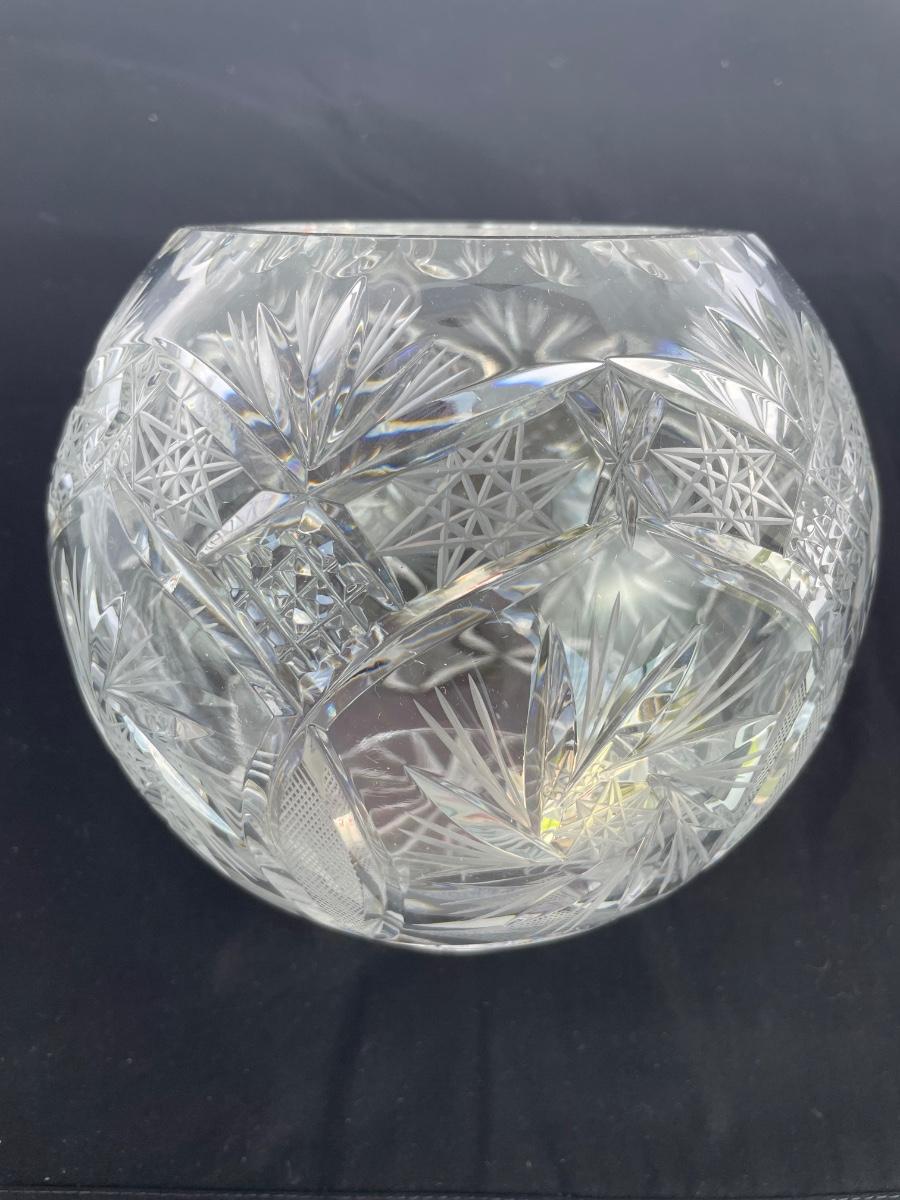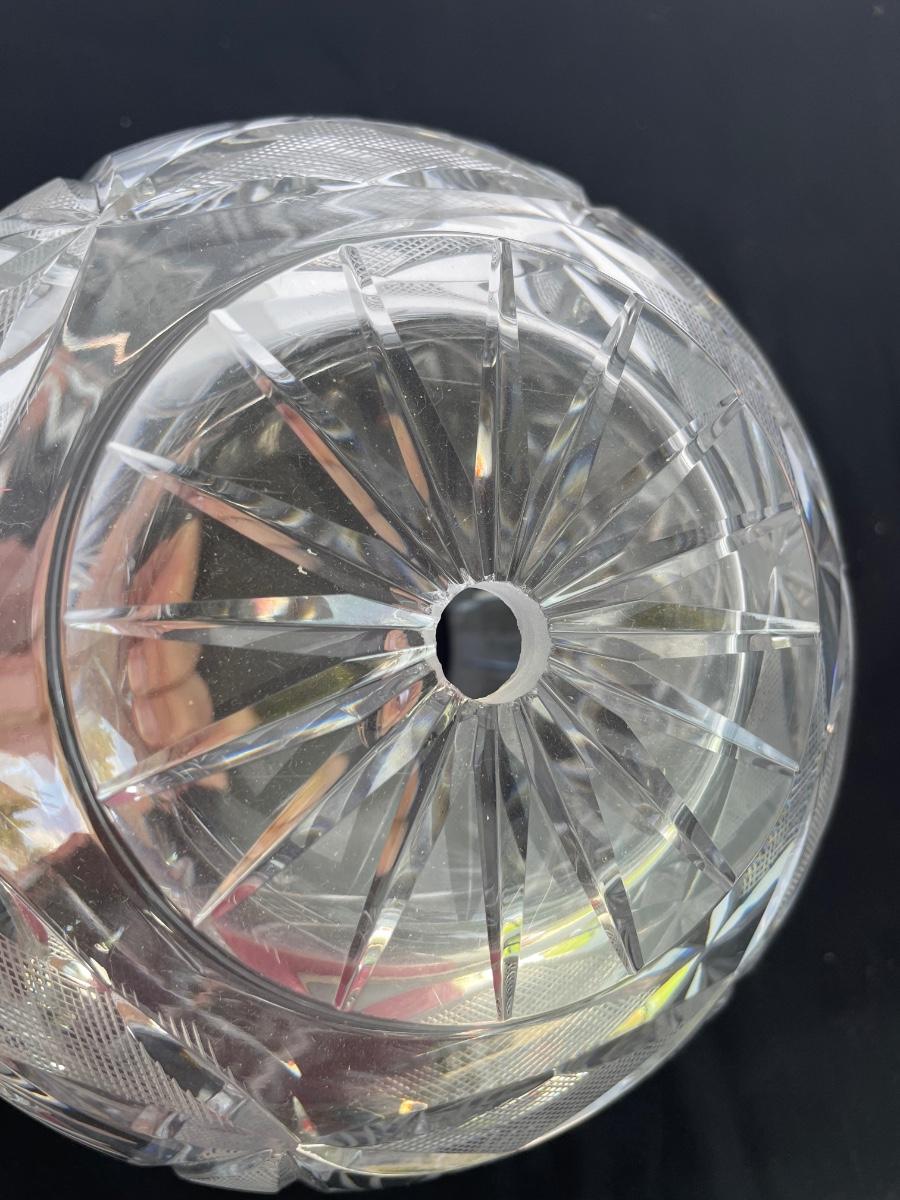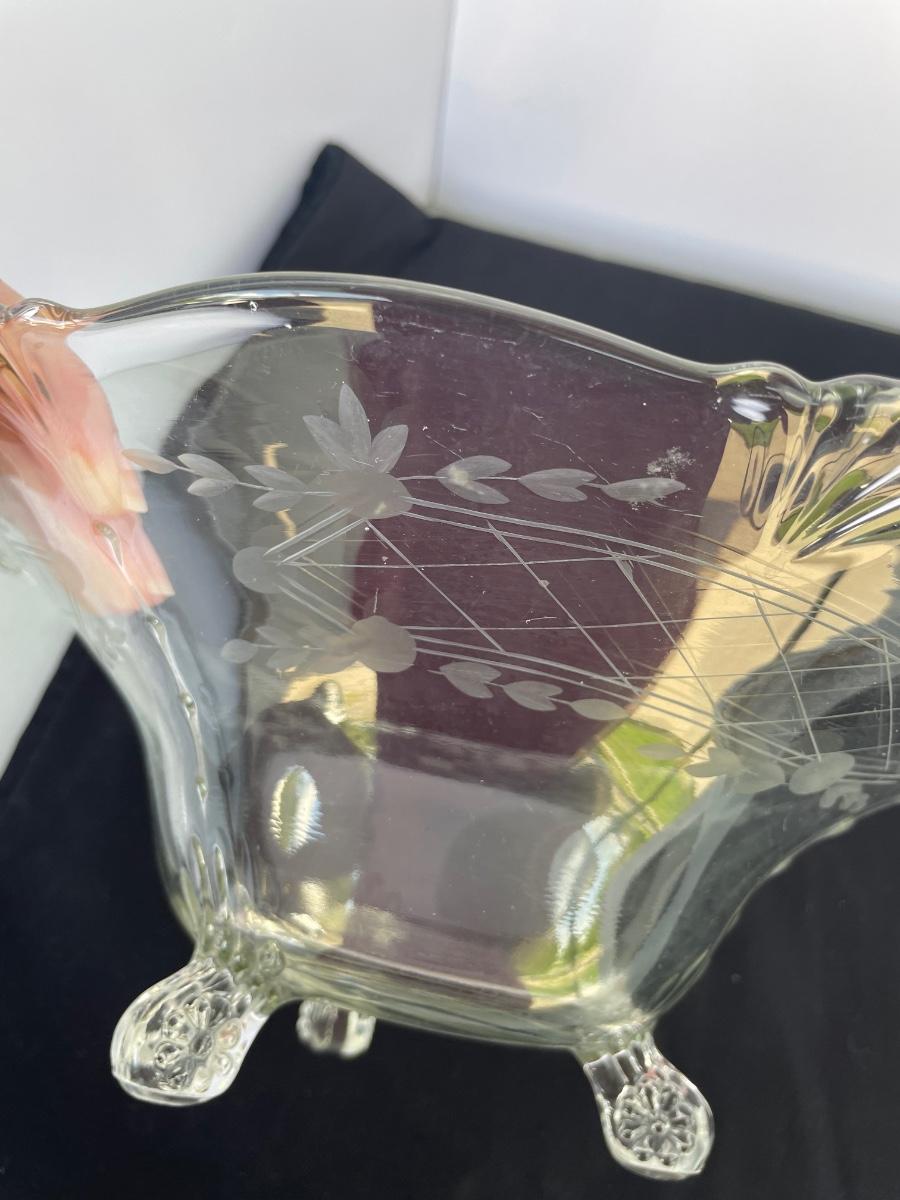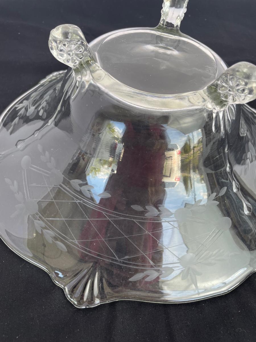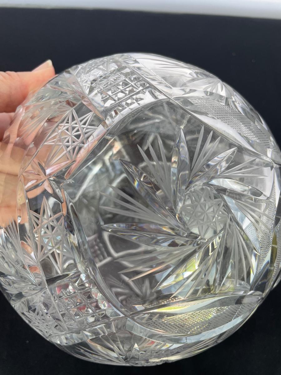 Footed bowl is etched and 11 inches wide. Cut crystal bowl is from Poland and has a hole cut in the bottom. It’s 7” wide and 6” high.