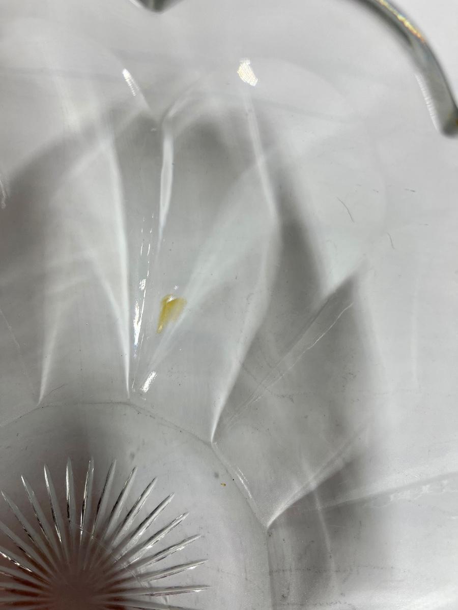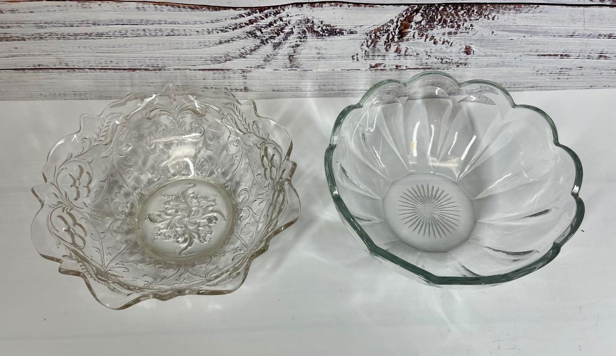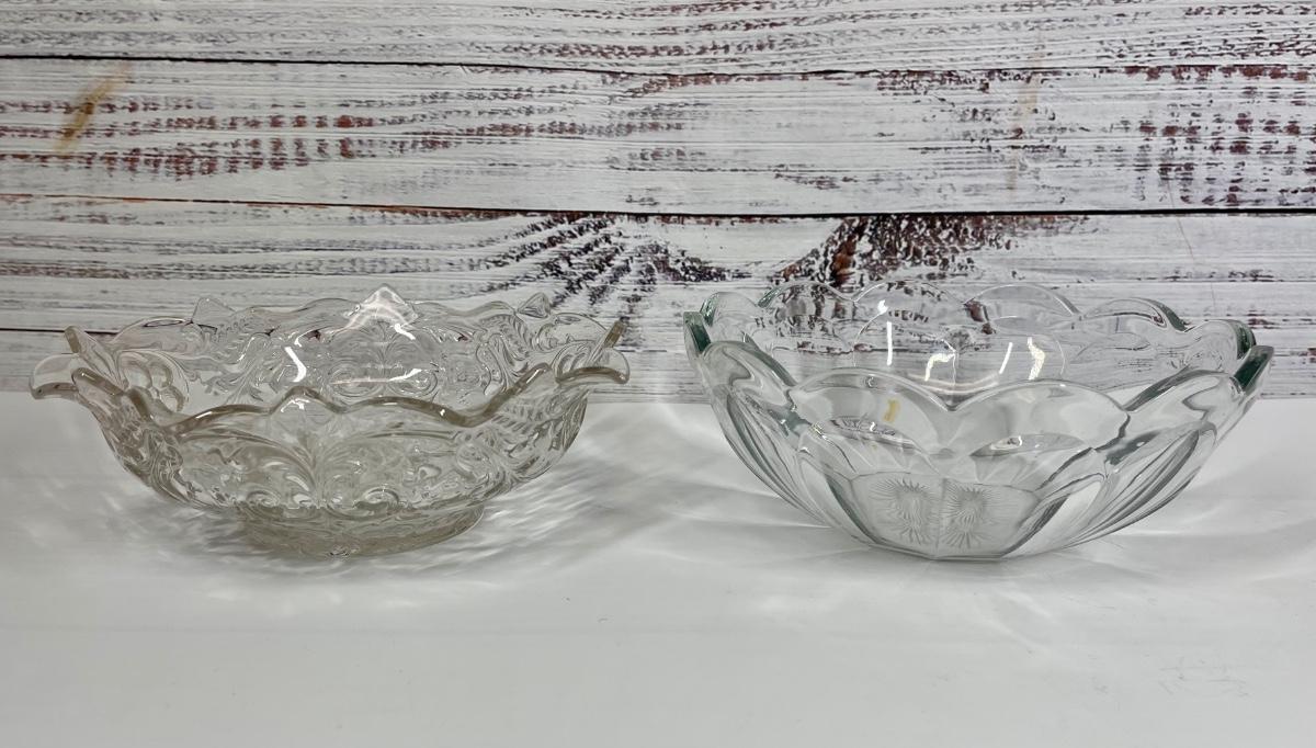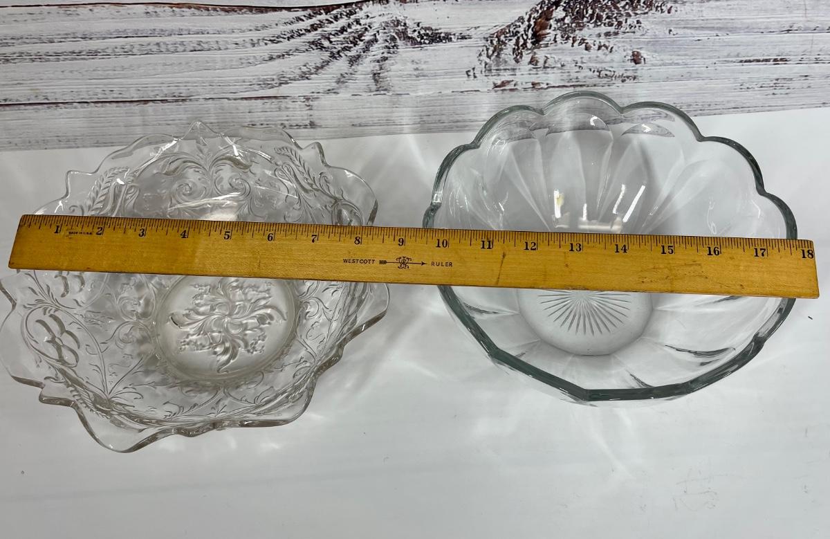 Pair of Vintage Pressed Glass Serving Bowls. Nice glass bowls, different patterns. One has small yellow mark that doesn’t come off (see photo)