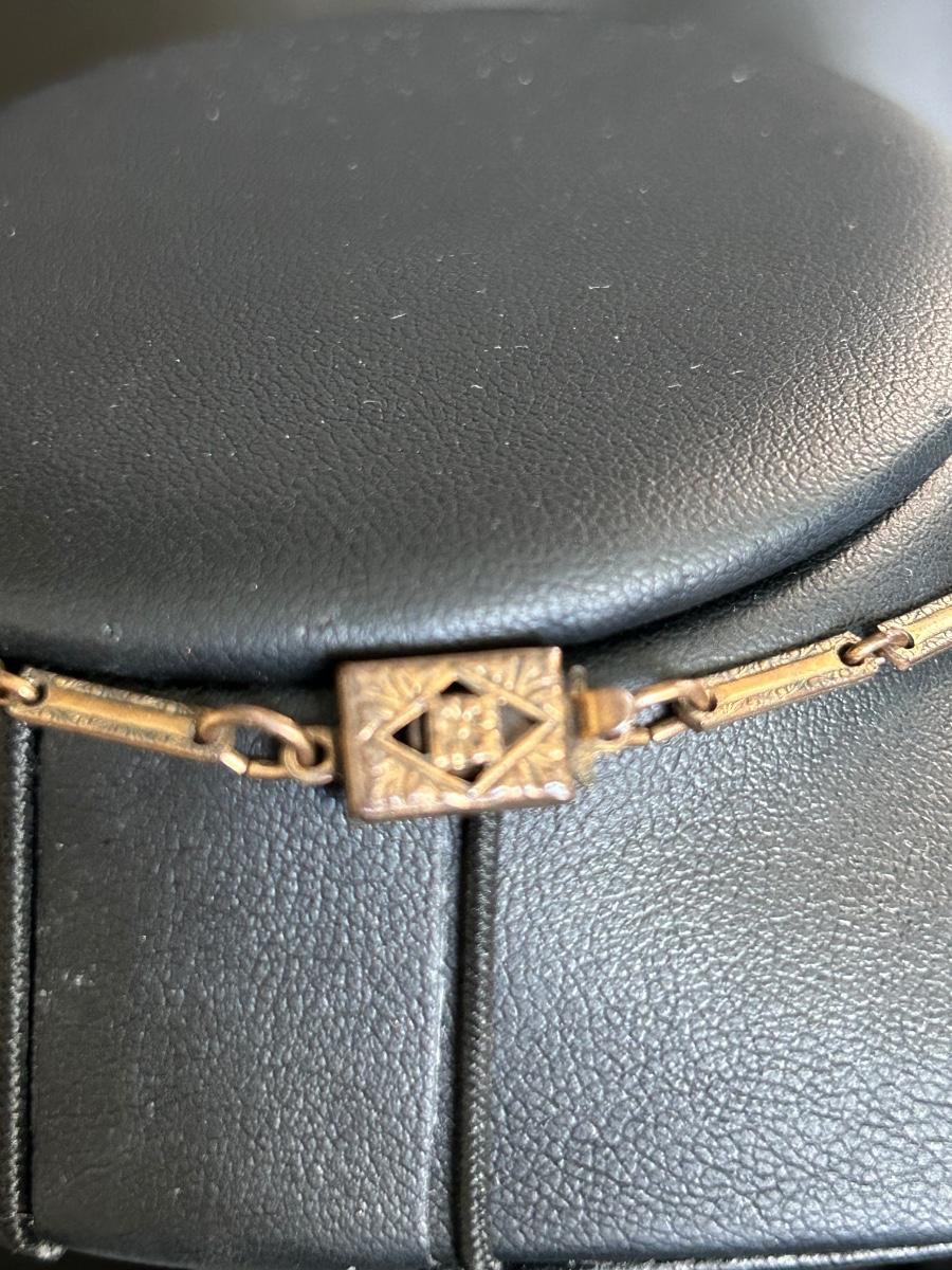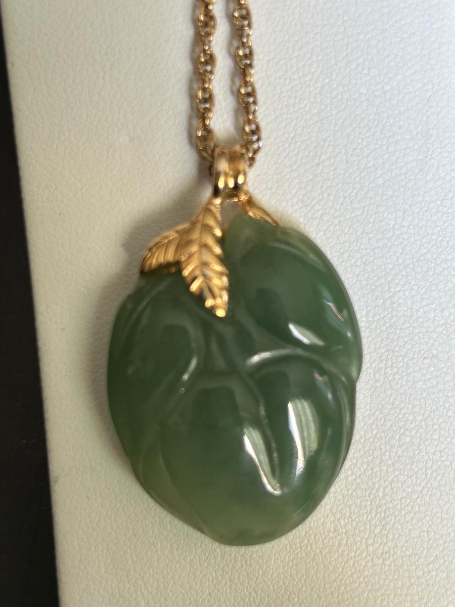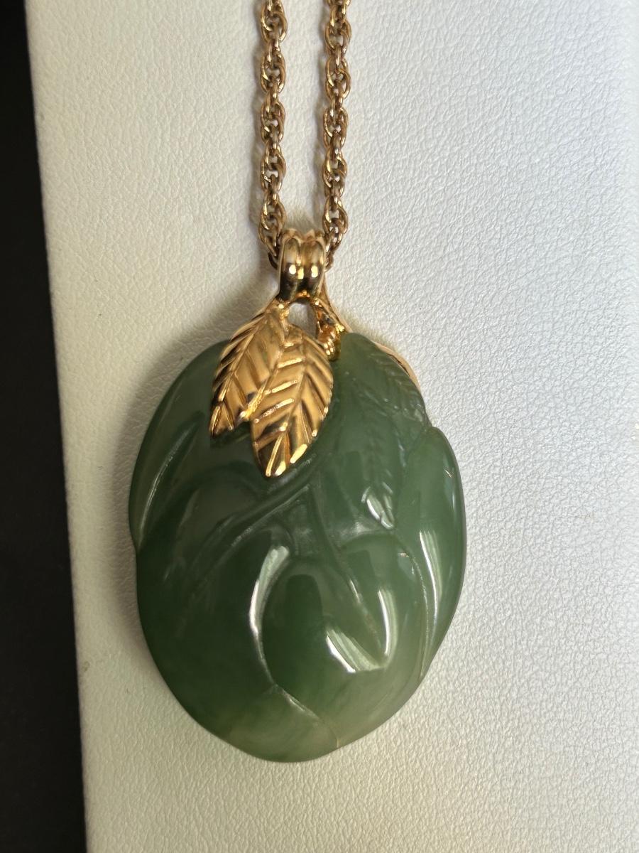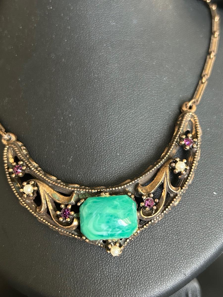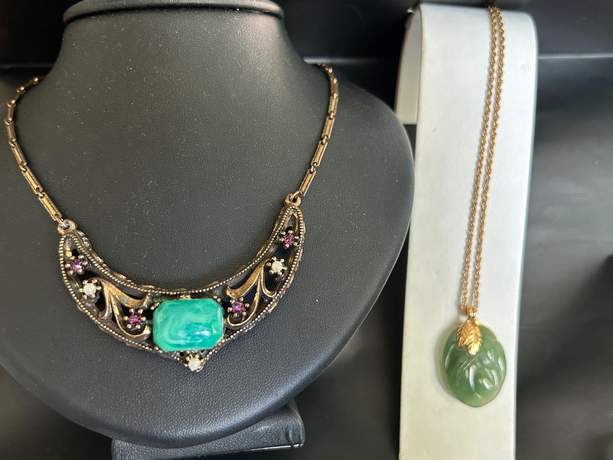 There are no markings on the 1st necklace, I believe the green stone is Chalcedony, amethysts & pearls are not real. The 2nd necklace is a Trifari & the stone looks like serpentine“🦆both very cool!