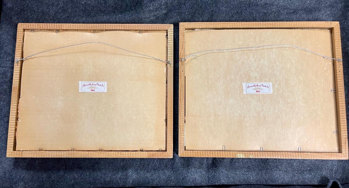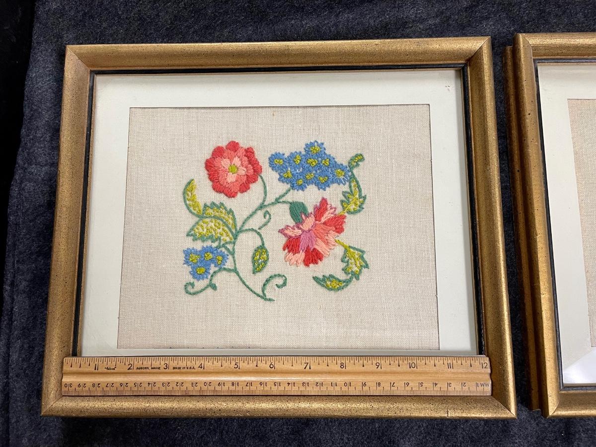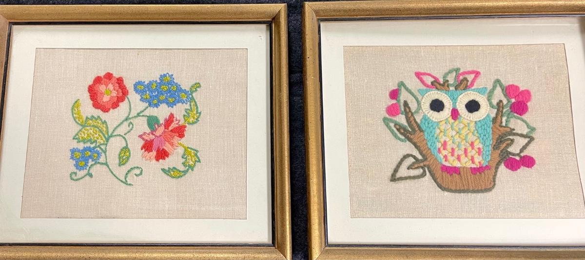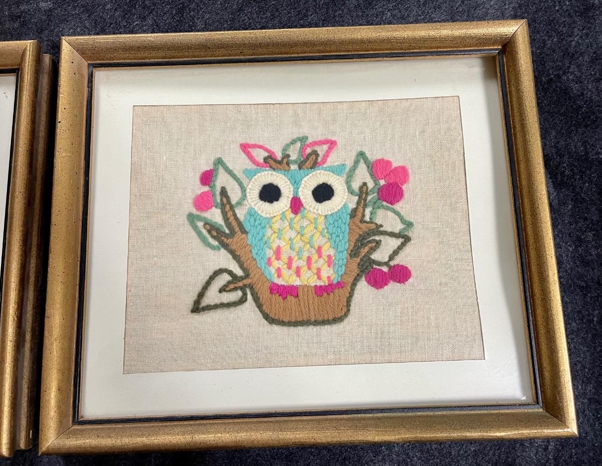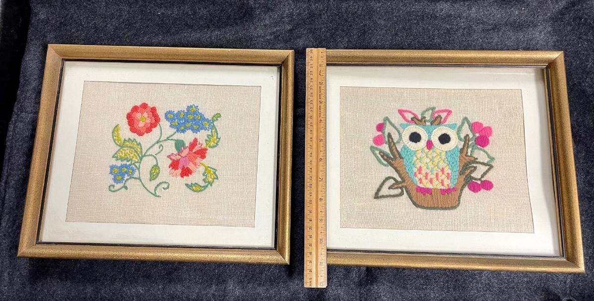 Pair of Vintage Hand Stitched Framed Art Flowers and Owl