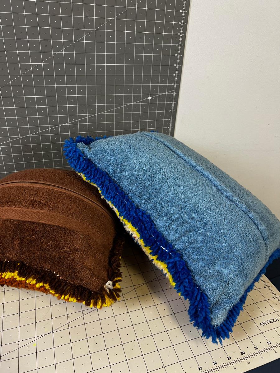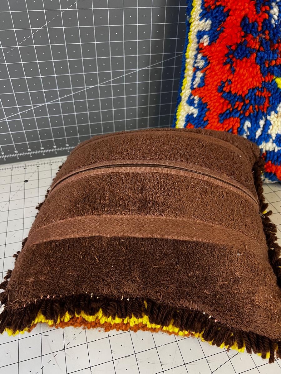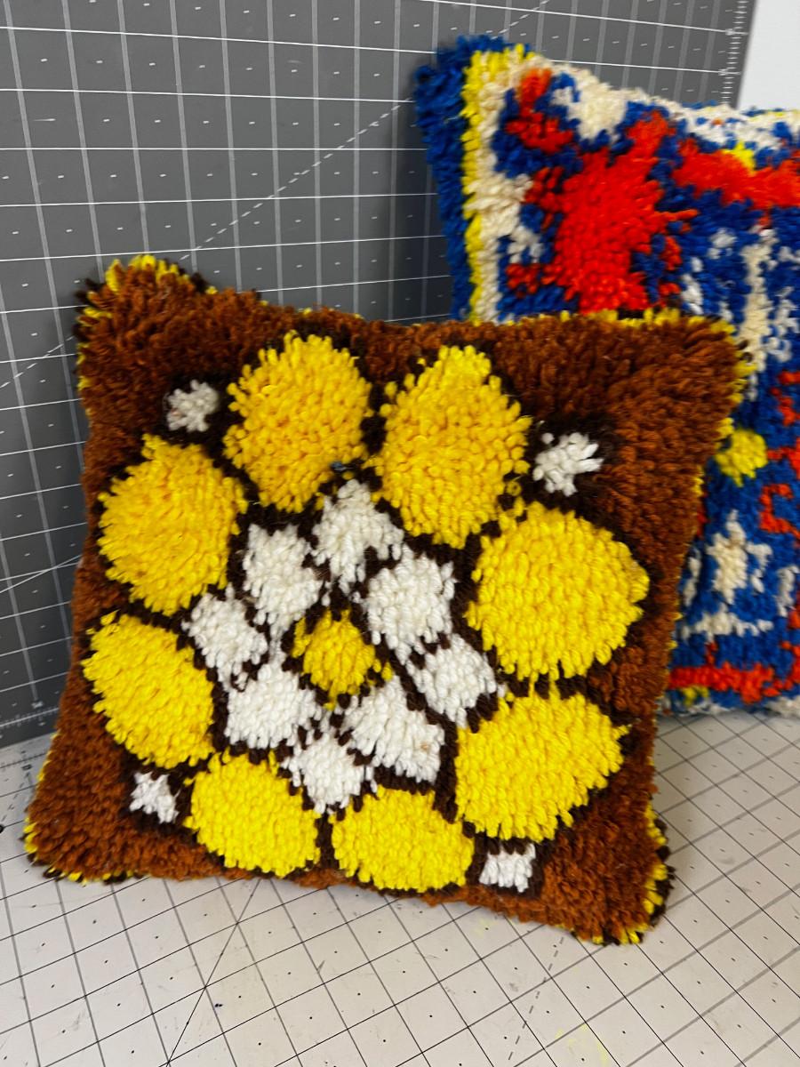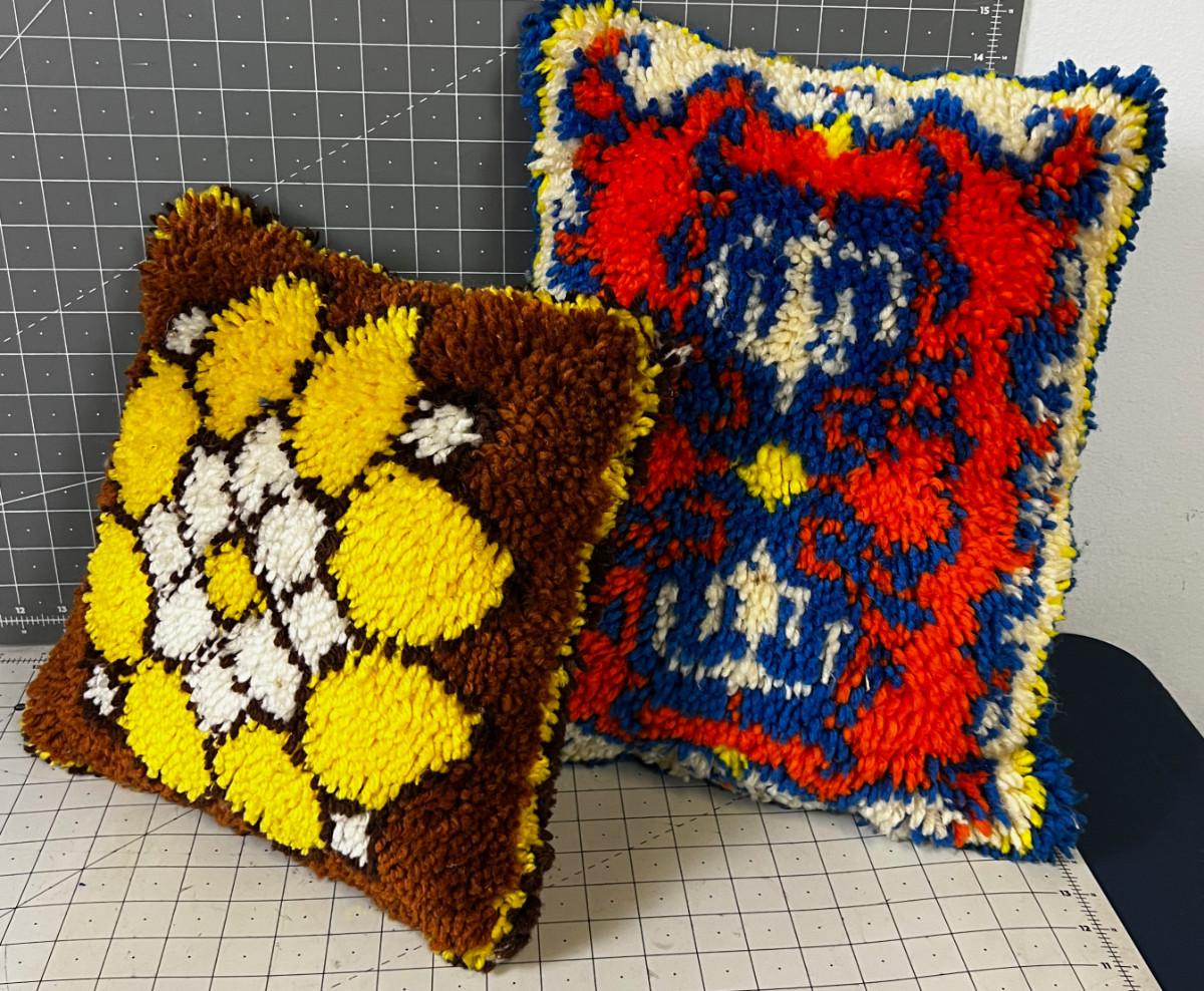 2 VINTAGE Hook Rug Throw Pillows with Terry Cloth Backs