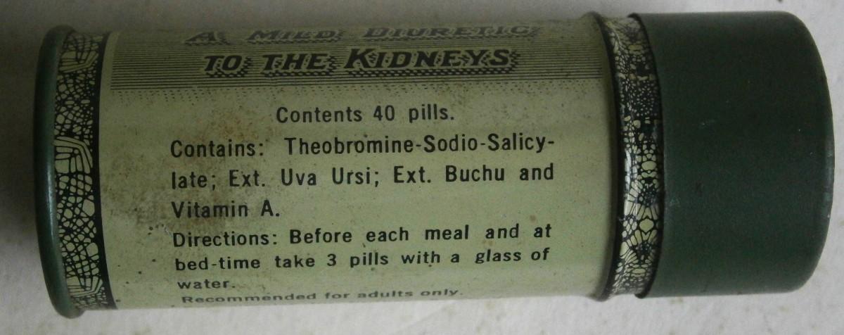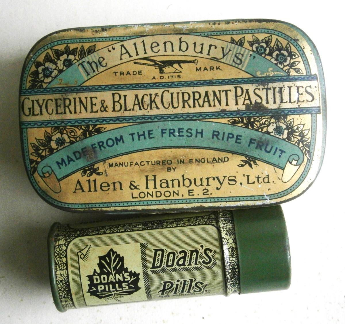 2 Vintage Medicinal Tins, Allenbury's 3 1/4 in. wide, Doan's 2 1/2 in. tall, lithographed tin.