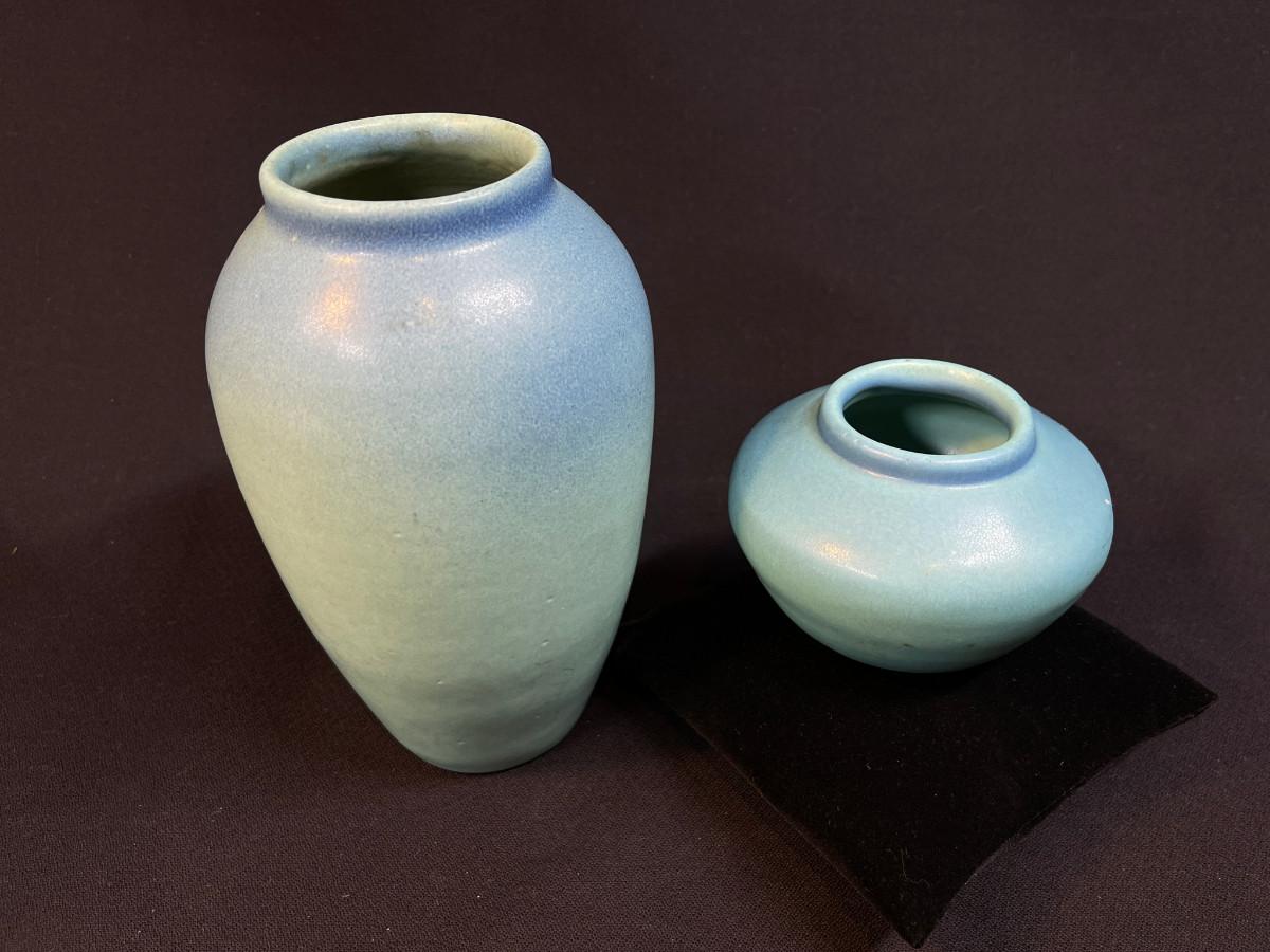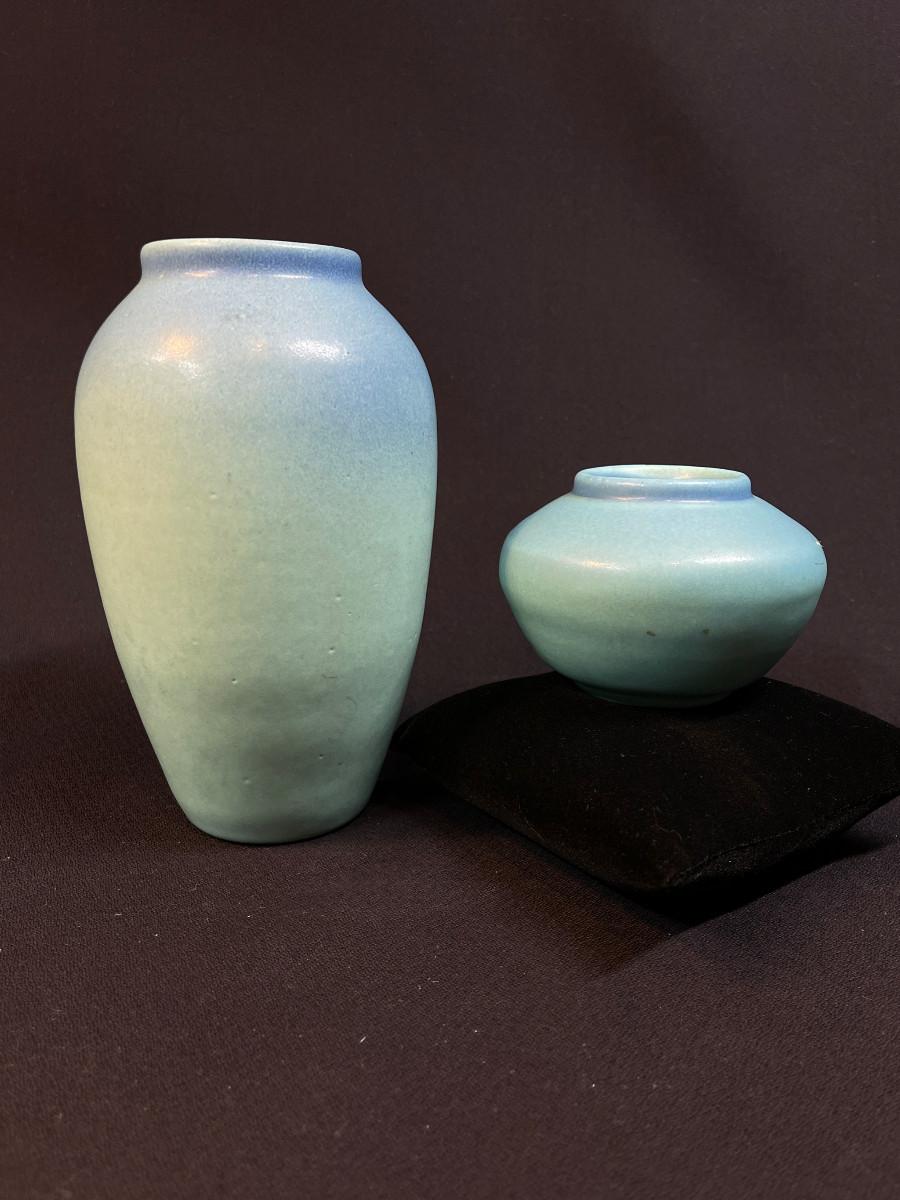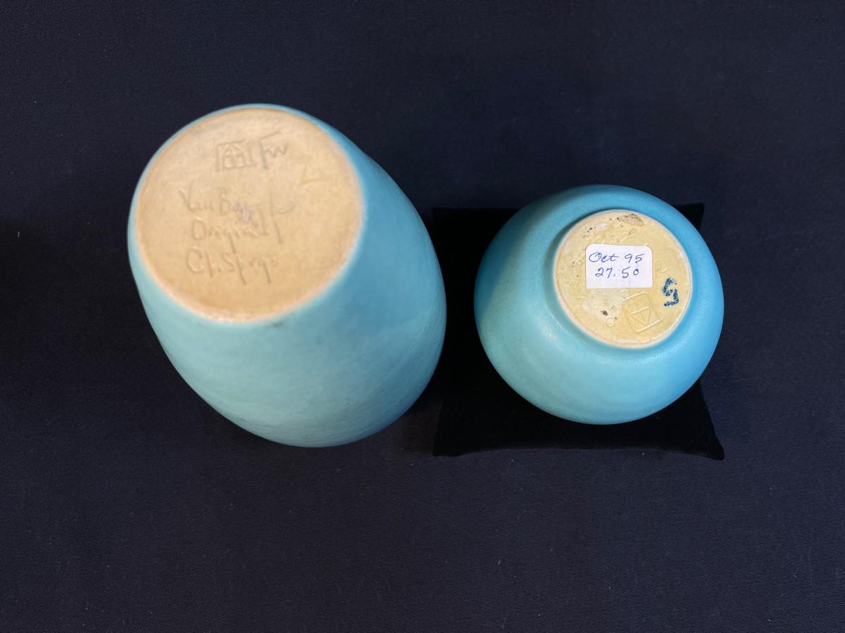 The subject item is comprised of two vintage Ming Blue Van Briggle vases. The squat form, marked “original” sports a slightly darker, more saturated glaze. The piece is also marked with a glazed #5. The standing vase, also marked “original”, is marked with the initials “FW.”