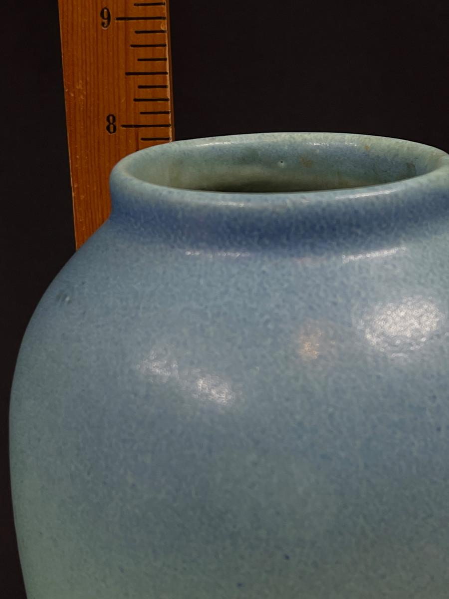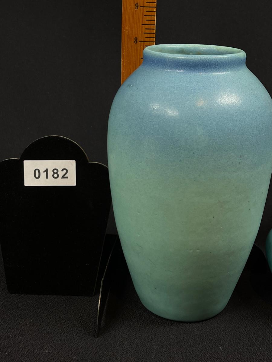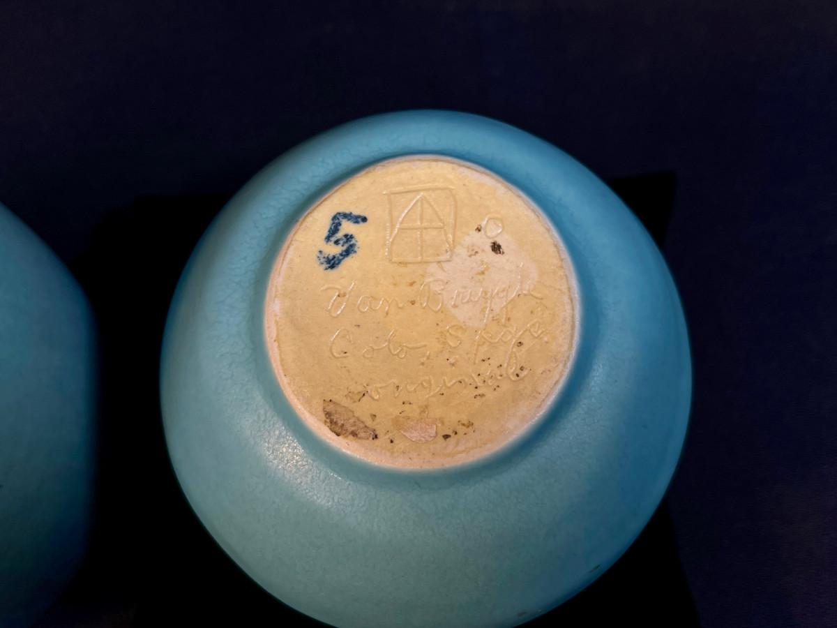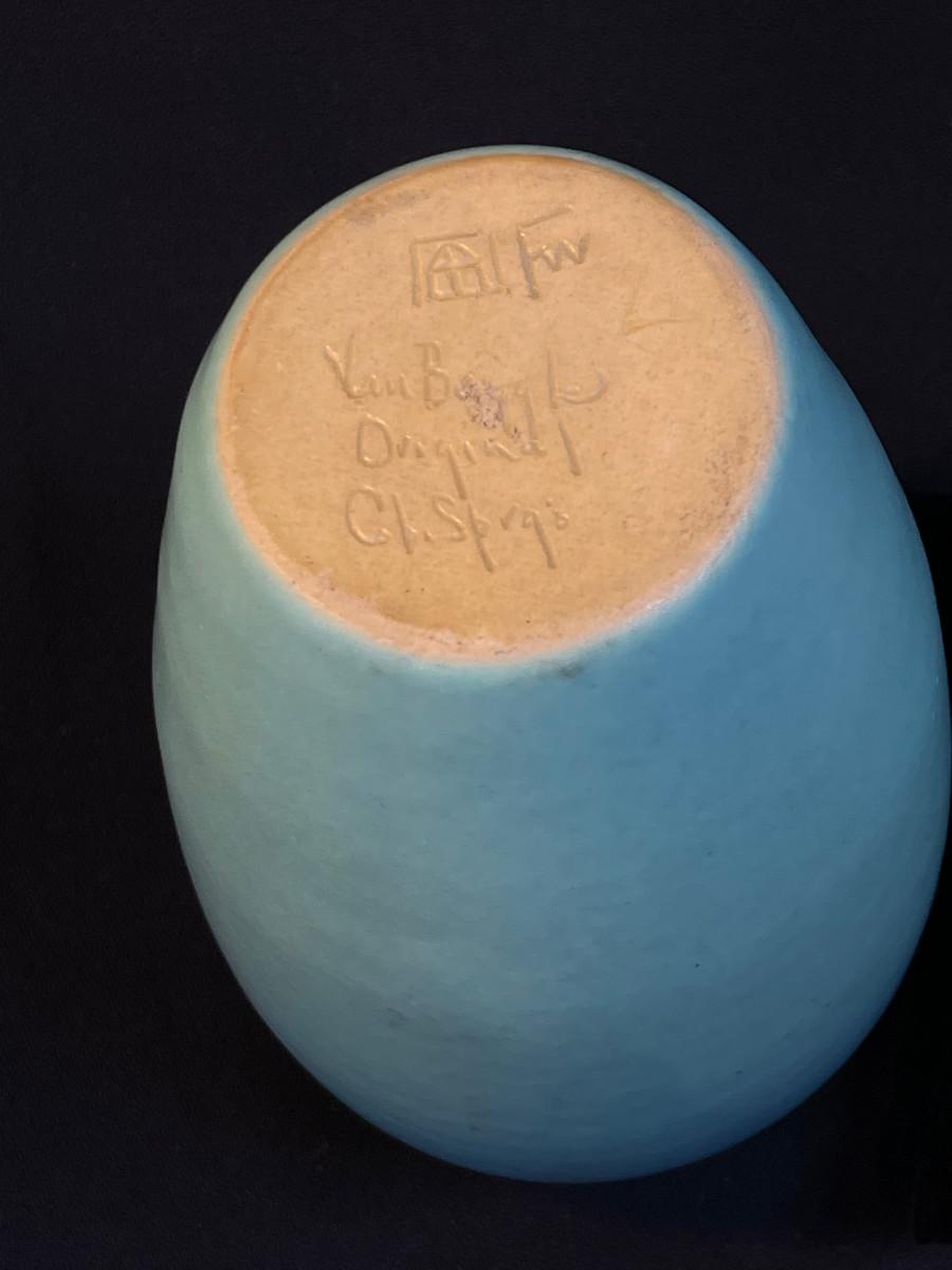 The subject item is comprised of two vintage Ming Blue Van Briggle vases. The squat form, marked “original” sports a slightly darker, more saturated glaze. The piece is also marked with a glazed #5. The standing vase, also marked “original”, is marked with the initials “FW.”