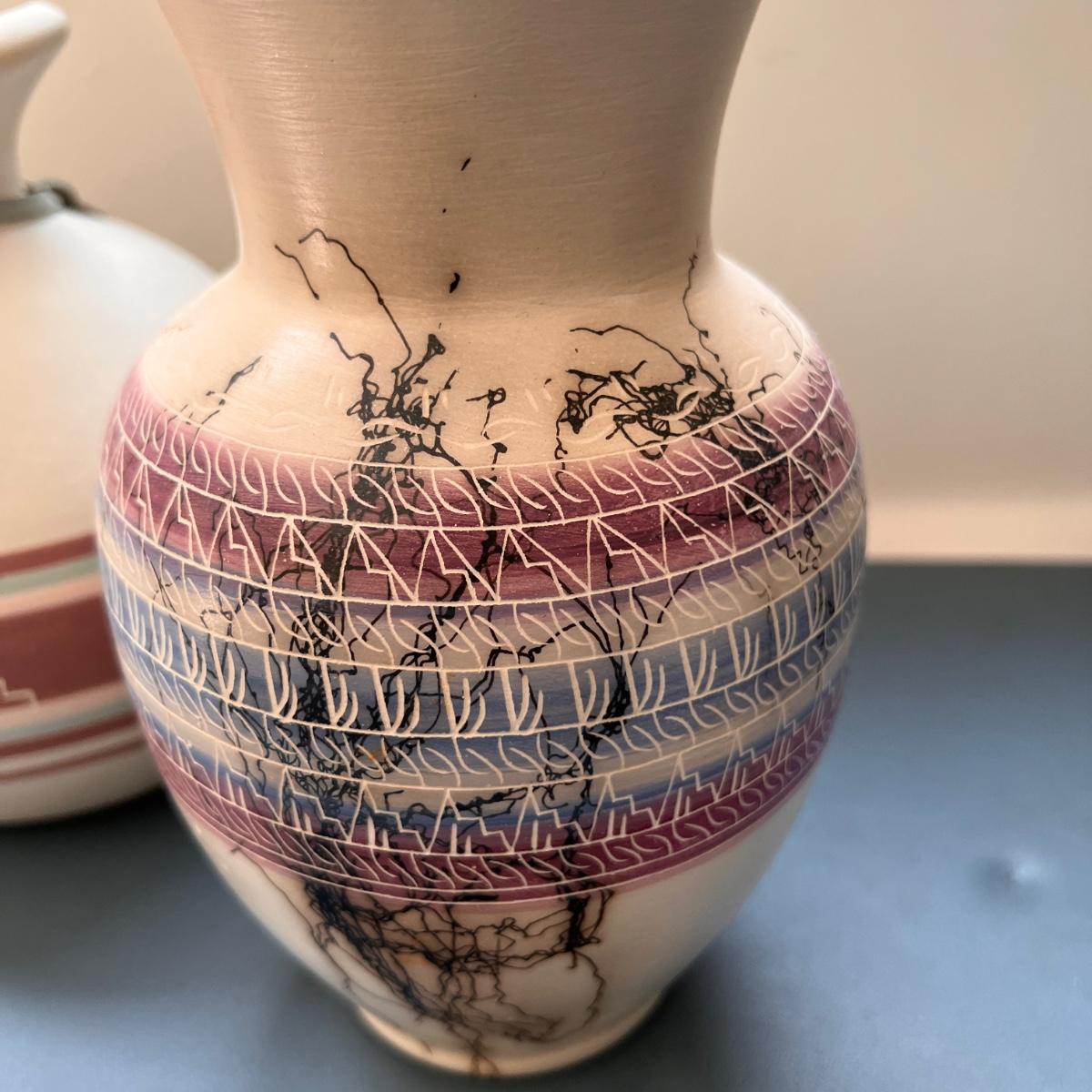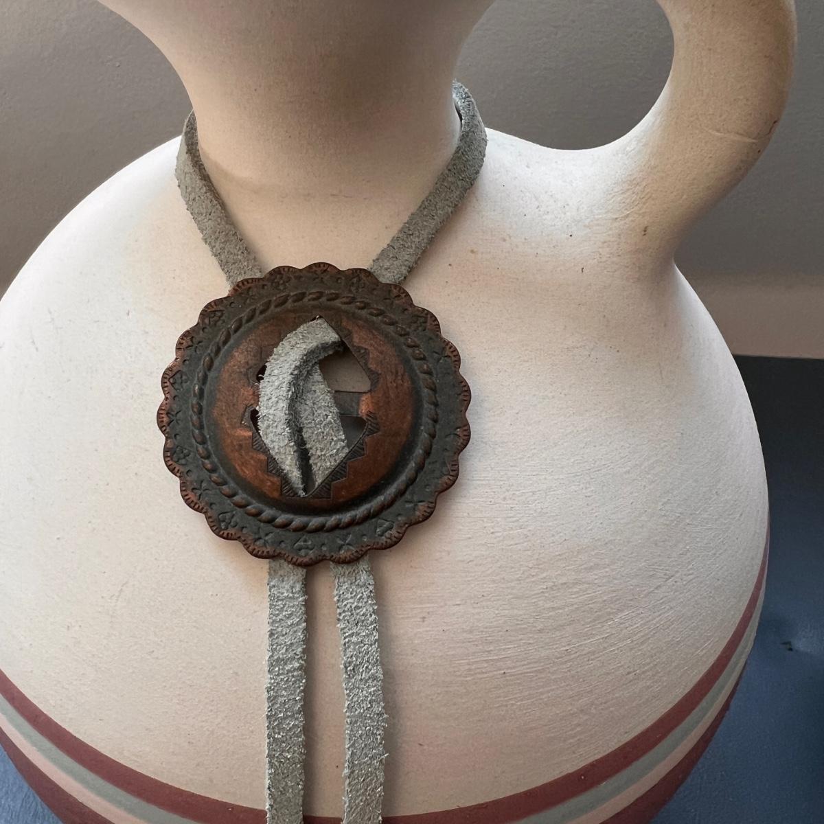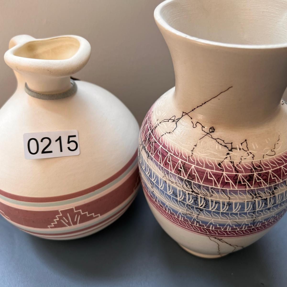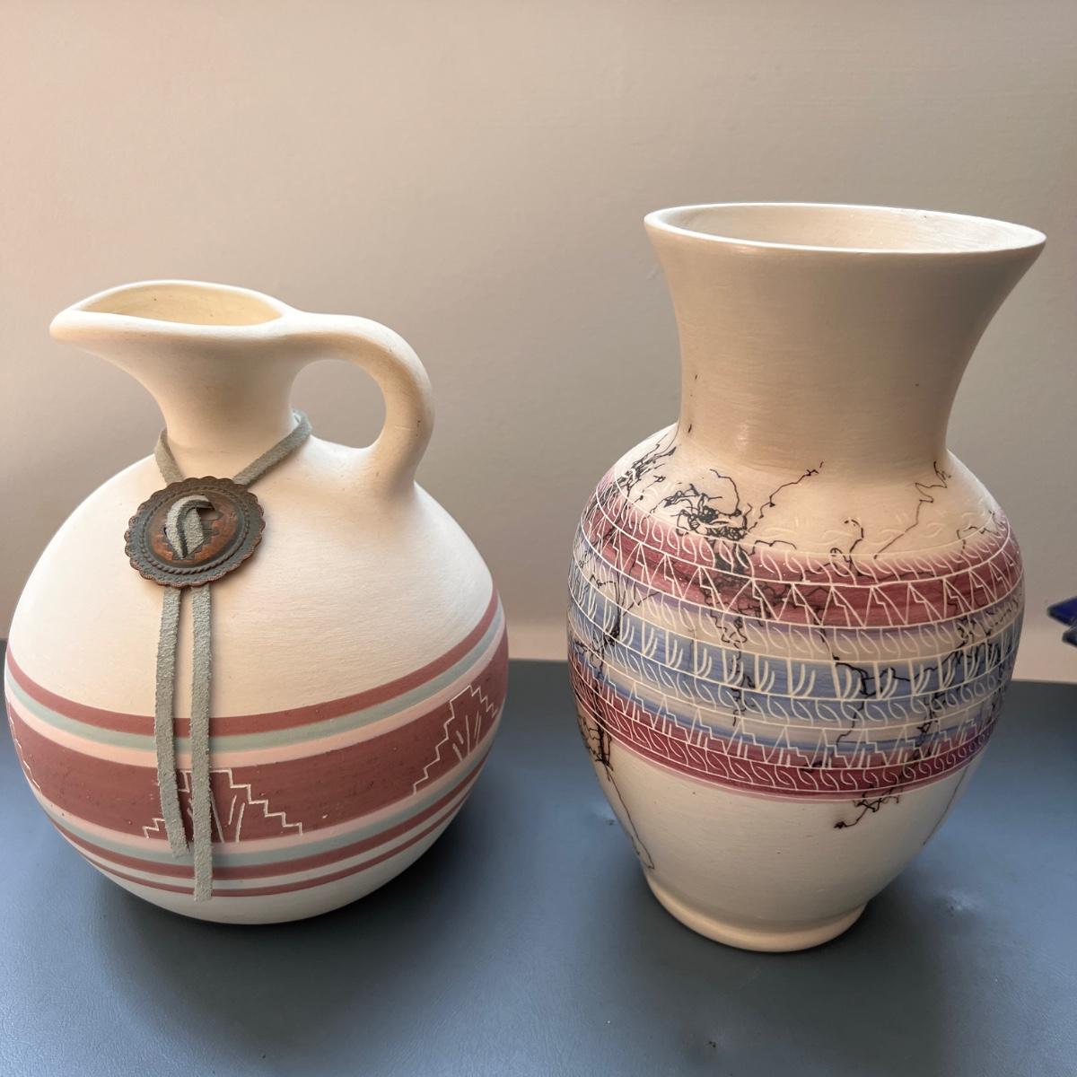 The vase is signed and is Navajo horse hair etched pottery. The pitcher is numbered 729B and has a suede and metal medallion. Both are in excellent condition.