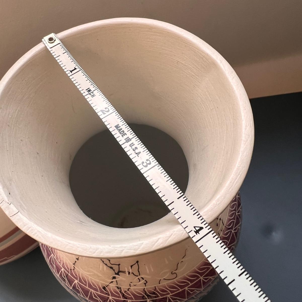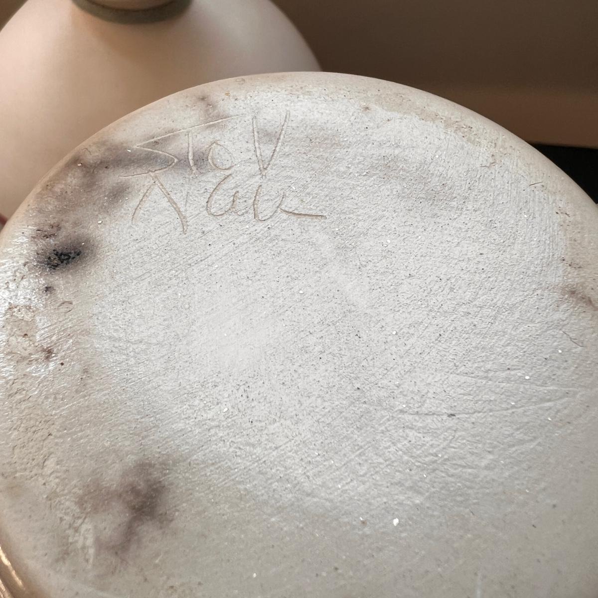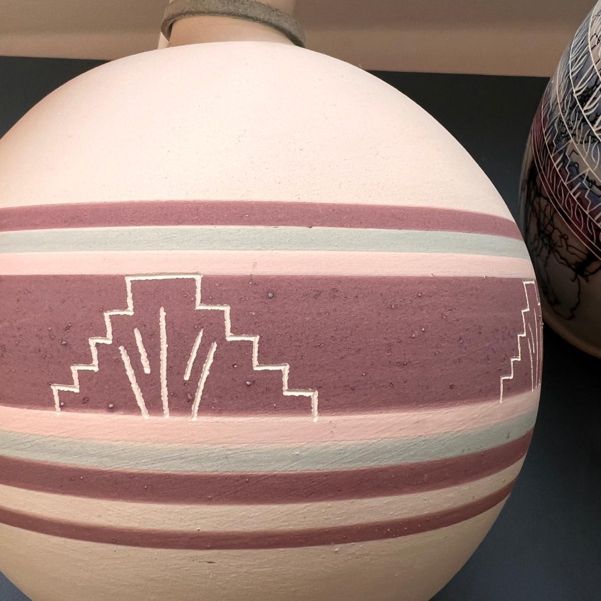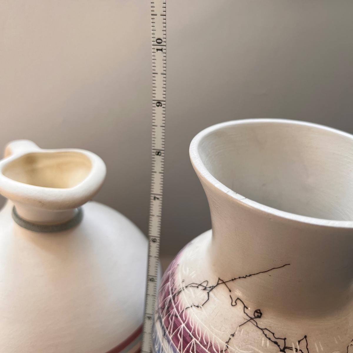 The vase is signed and is Navajo horse hair etched pottery. The pitcher is numbered 729B and has a suede and metal medallion. Both are in excellent condition.