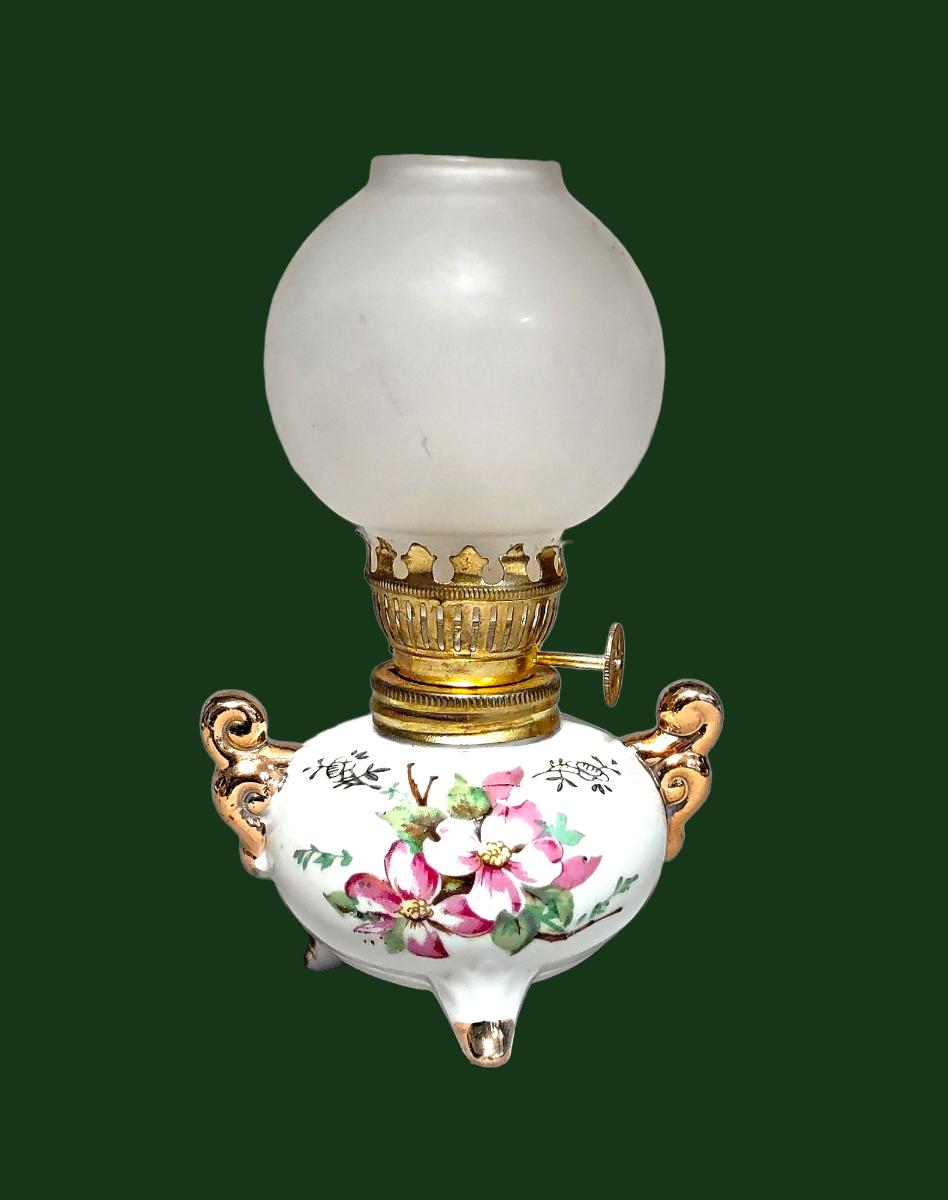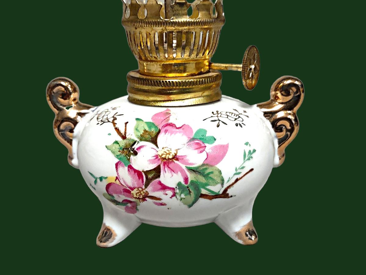 2 Vintage Norcrest Japan Ivory Porcelain Miniature Finger Oil Lamps - Dogwood Blossom Motif w/ Metallic Gold Accents - 1 is 6"H & the other is 7"H