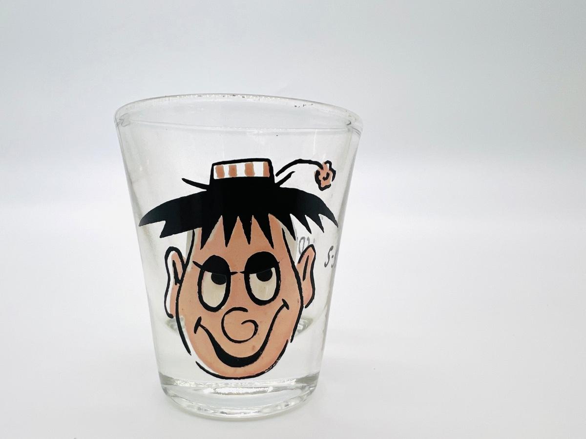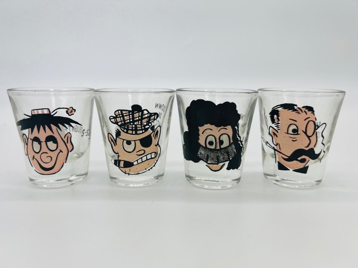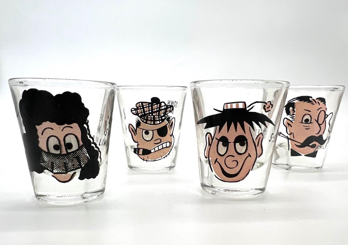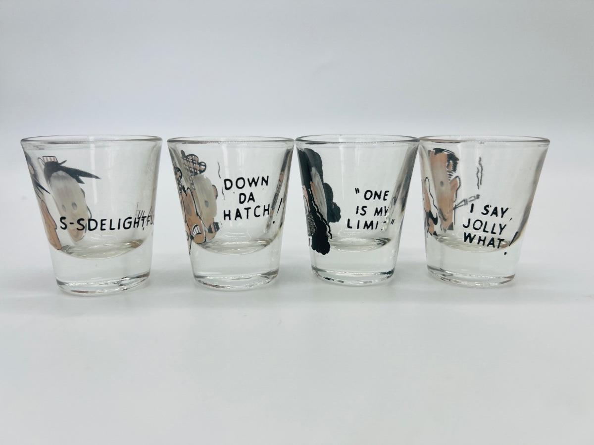 Four Vintage Novelty Moving Roving Eye Shot Glasses. “ONE IS MY LIMIT” “DOWN DA HATCH” “S-SDELIGHTFUL” “I SAY JOLLY WHAT”