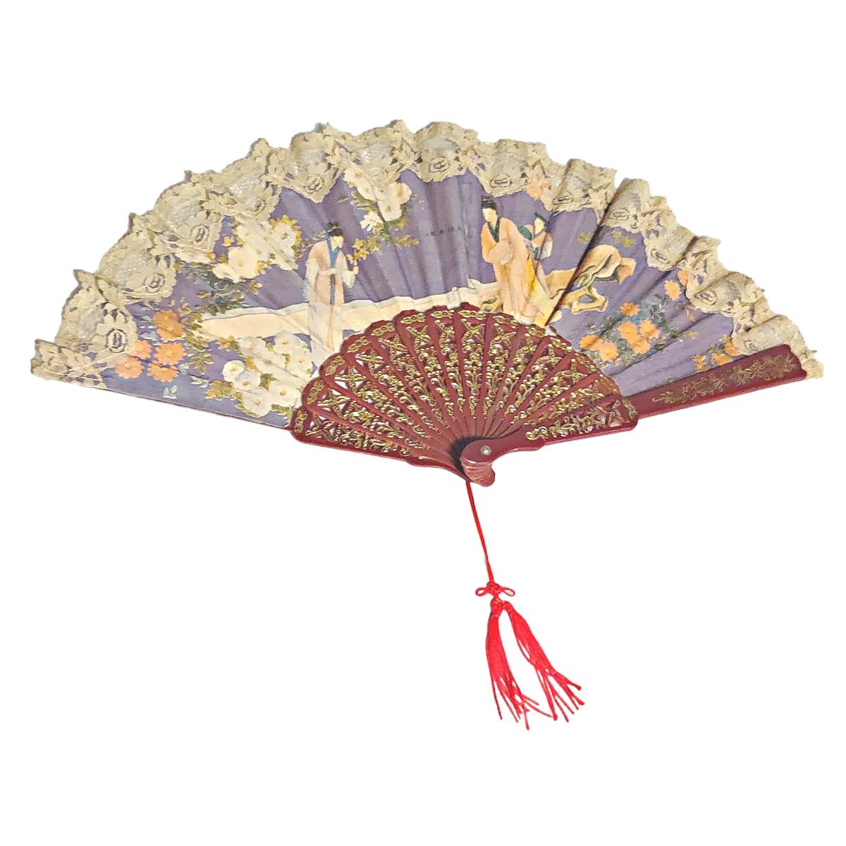 - Purple & Peach Floral Outdoor Scene w/ Green & Tan Lace Trim, Dark Red Handle w/ Gold Embossing & Red Silk Tassel