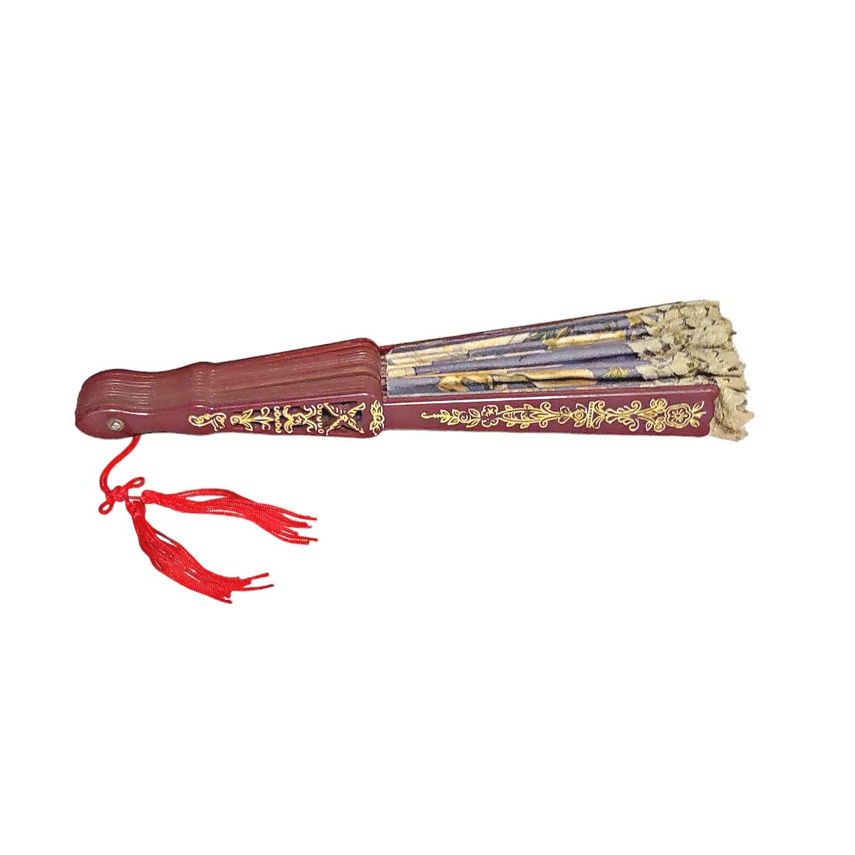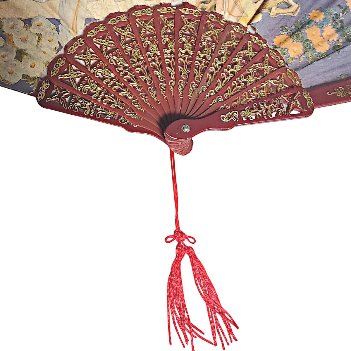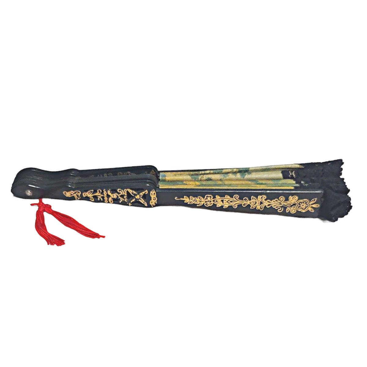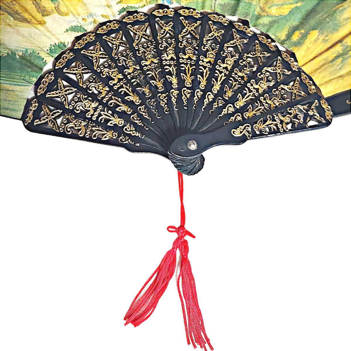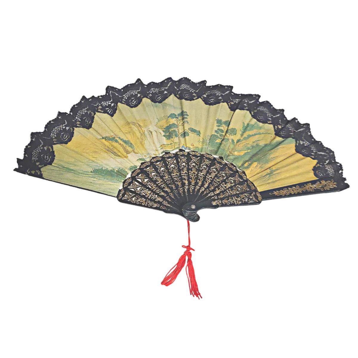 - Green & Yellow Outdoor Scene w/ Black Lace Trim, Black Handle w/ Gold Embossing & Red Silk Tassel