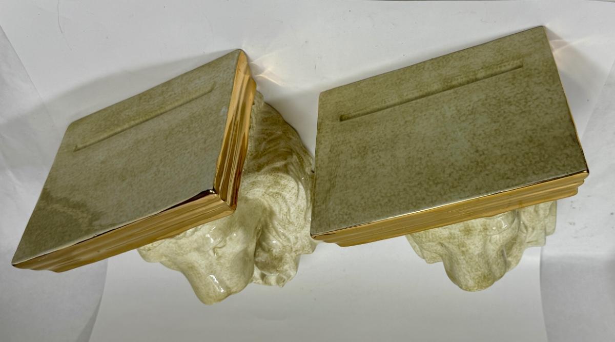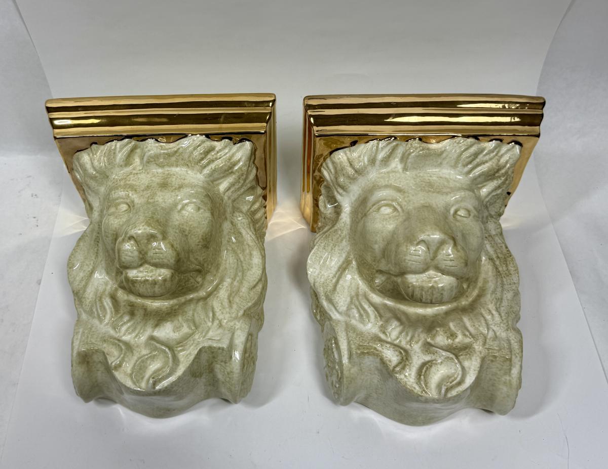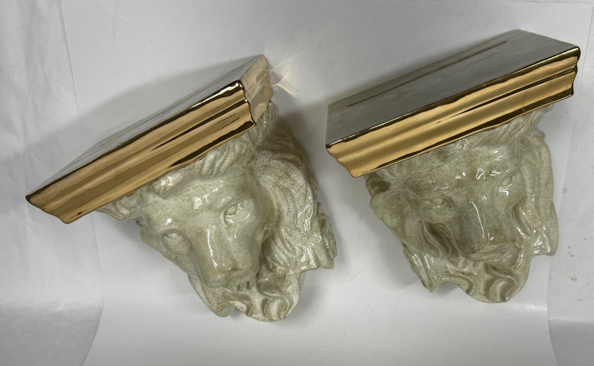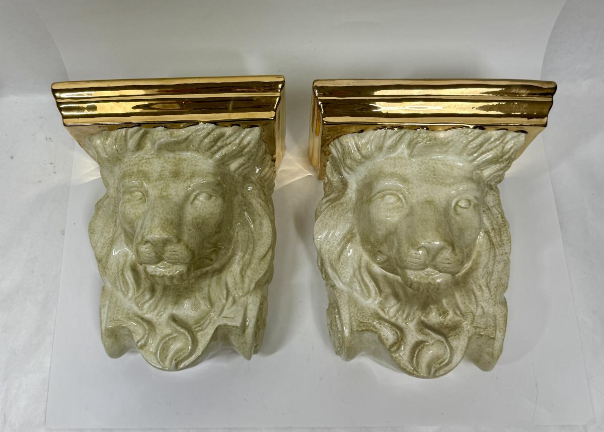 2 Vintage Painted Gold Plaster Lion Head Wall Decor Shelf