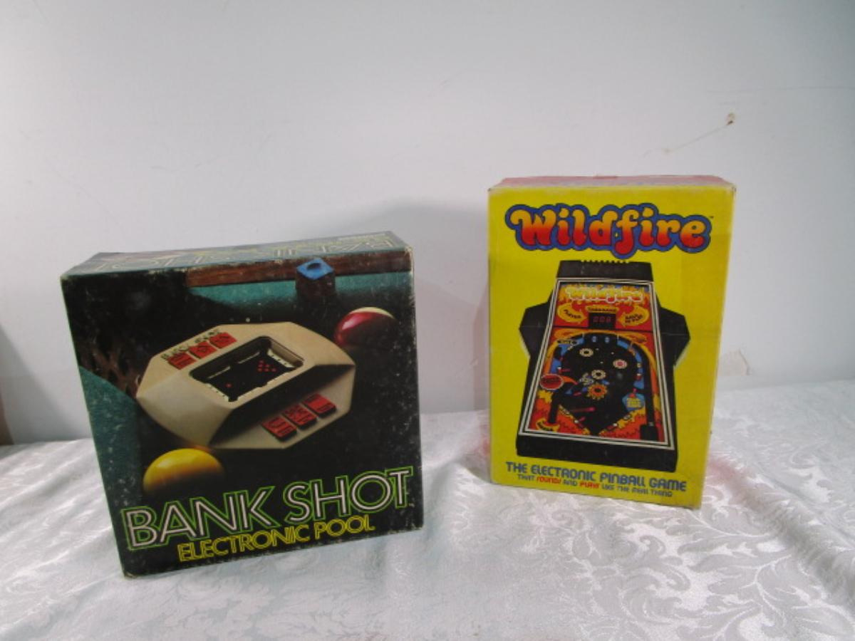 Wildfire is an electronic pinball game takes 6 AA batteries not included, Bank Shot is an Electronic pool game takes 6 AA batteries not included, tested and both work