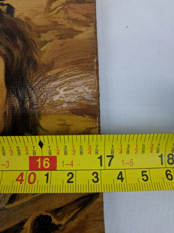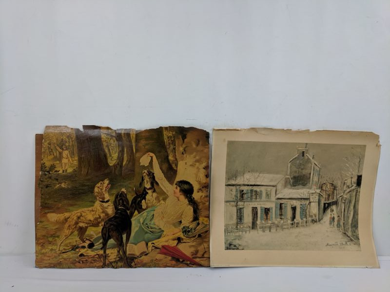 2 Vintage Pictures: Dogs 17" x 14" & Snowy Town 17" x 14", with Glass Covers