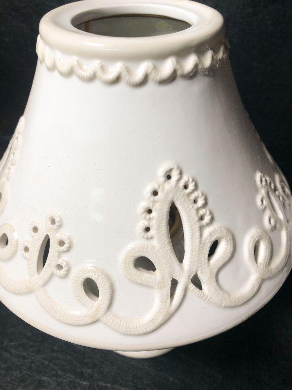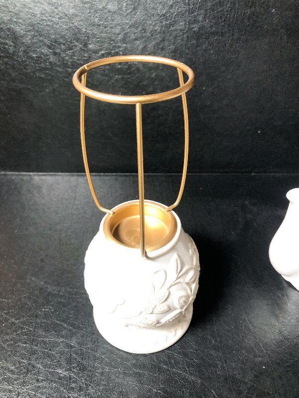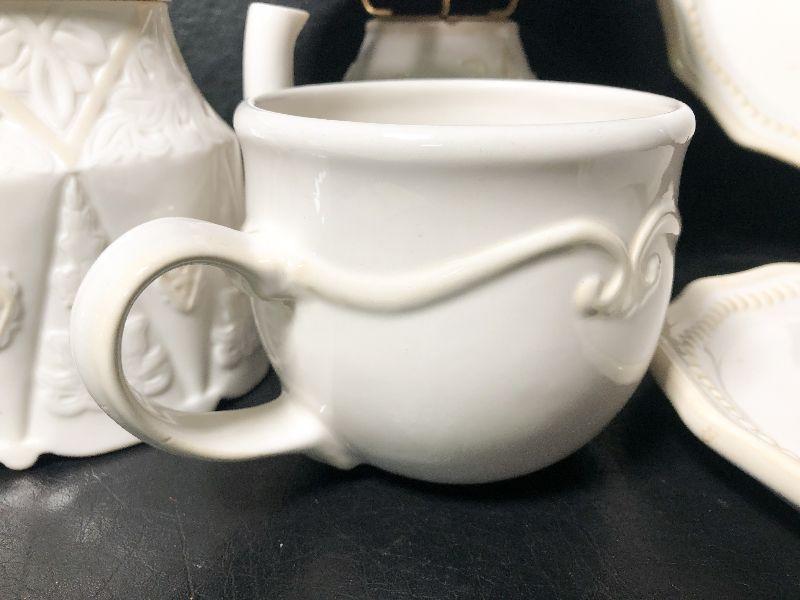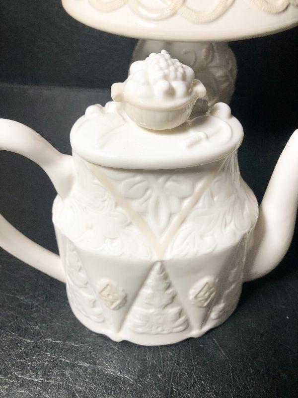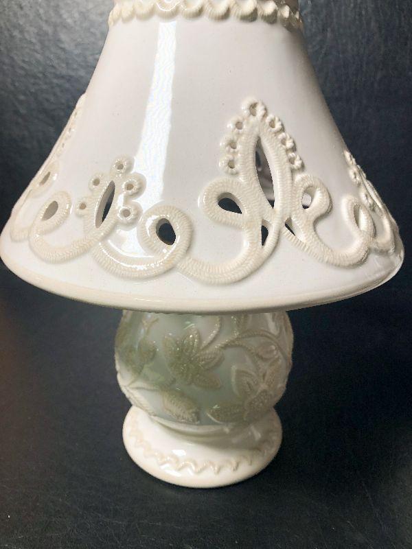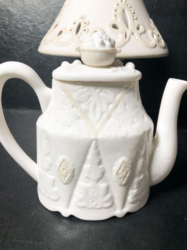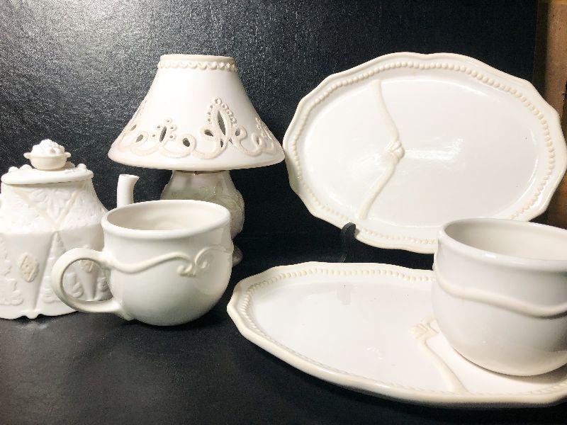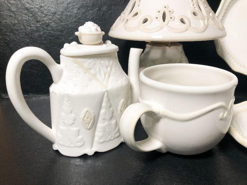 Disigner home decor lot includes two soup/sandwhich plates, Teapot and candle lamp. *Please review all photos for condition and contents of lot.