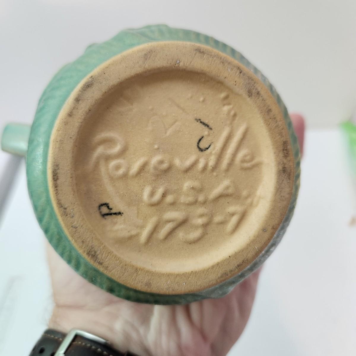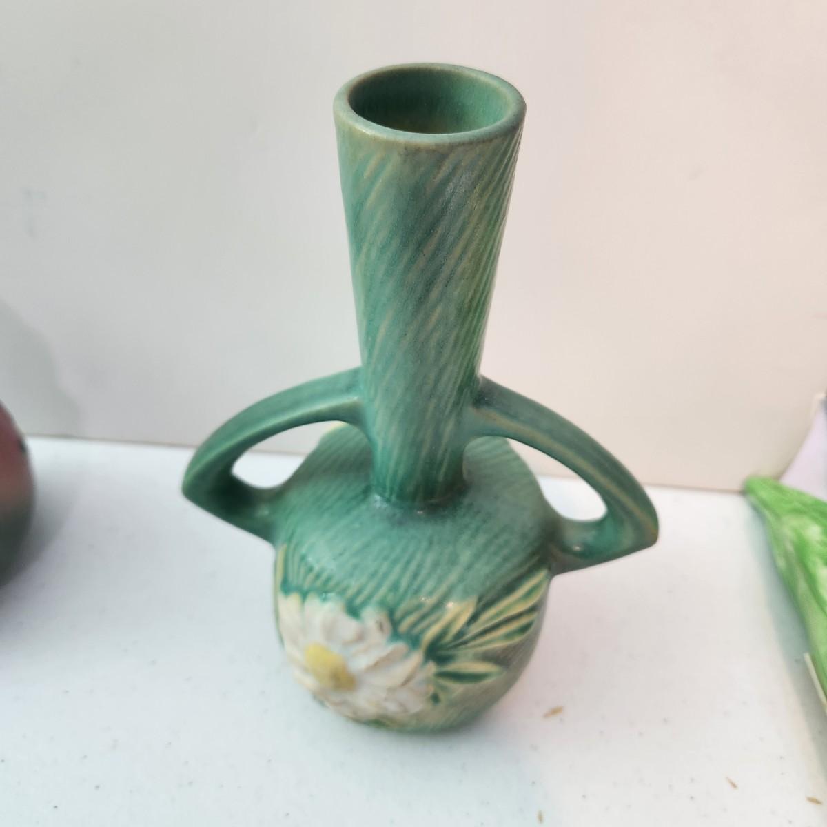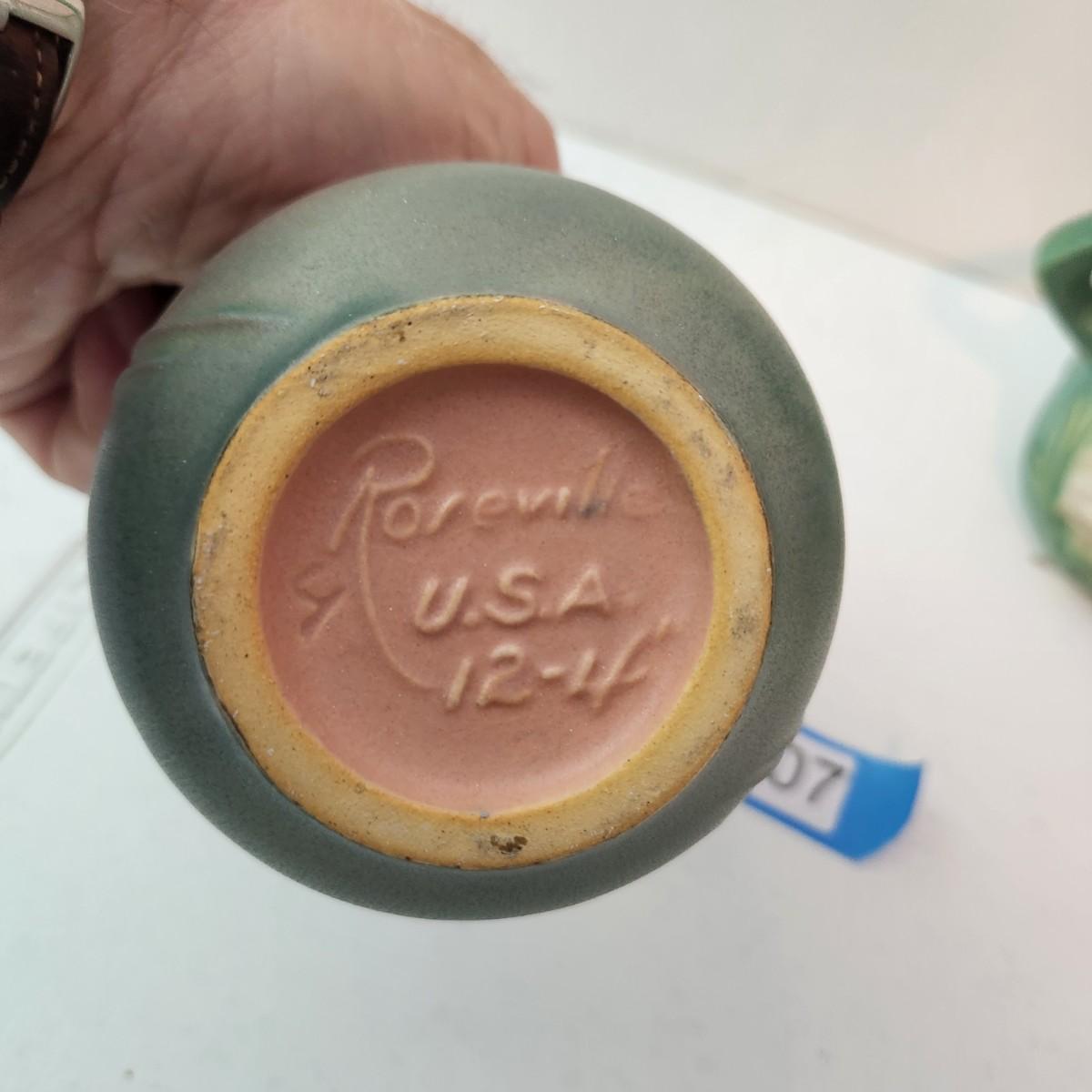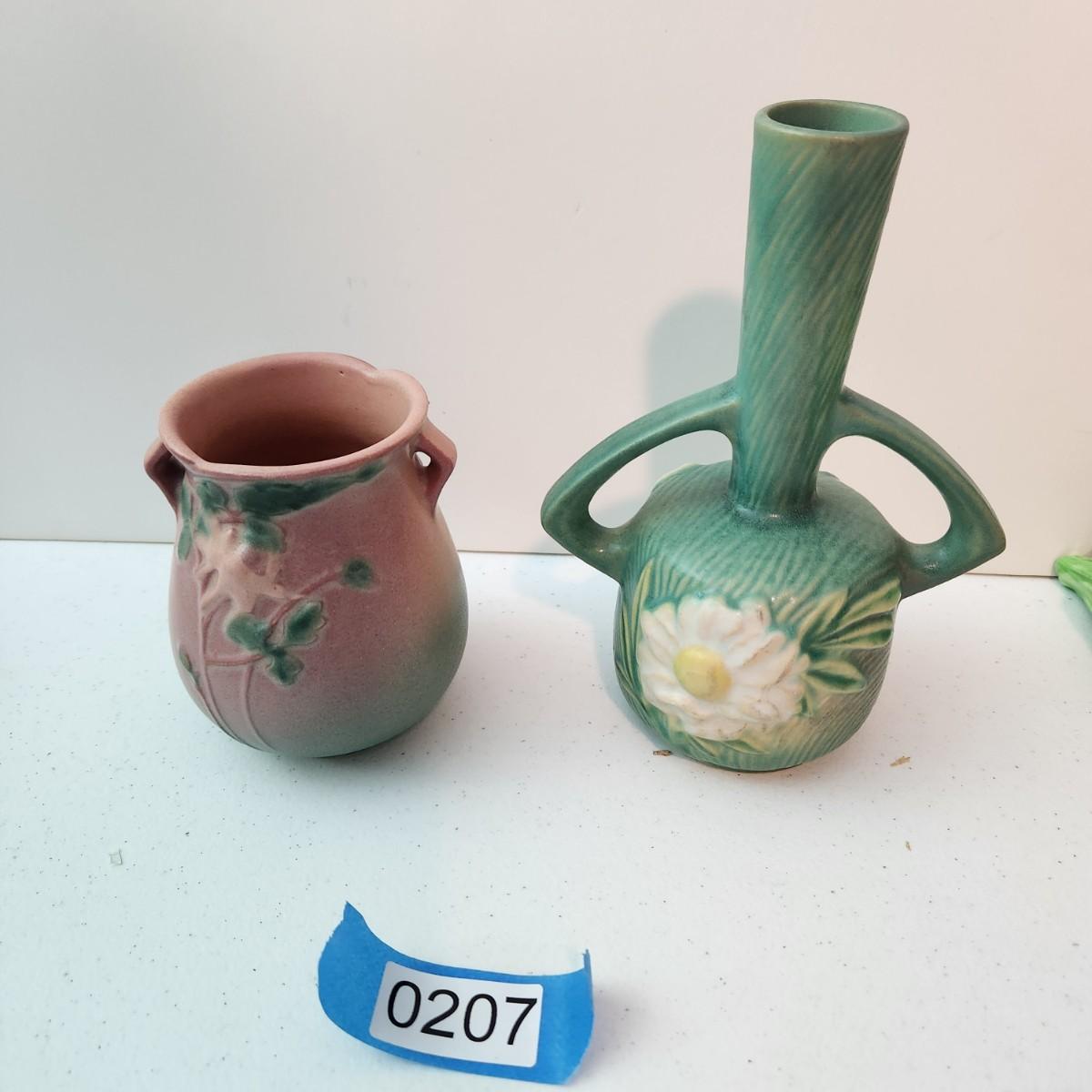 2 Vintage Roseville Pottery Two Handed Vase 173-7 Peony 7" & Columbine Cabinet Vase 12-4"