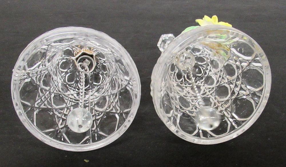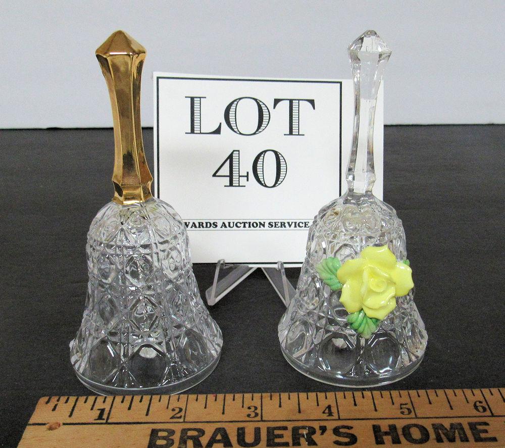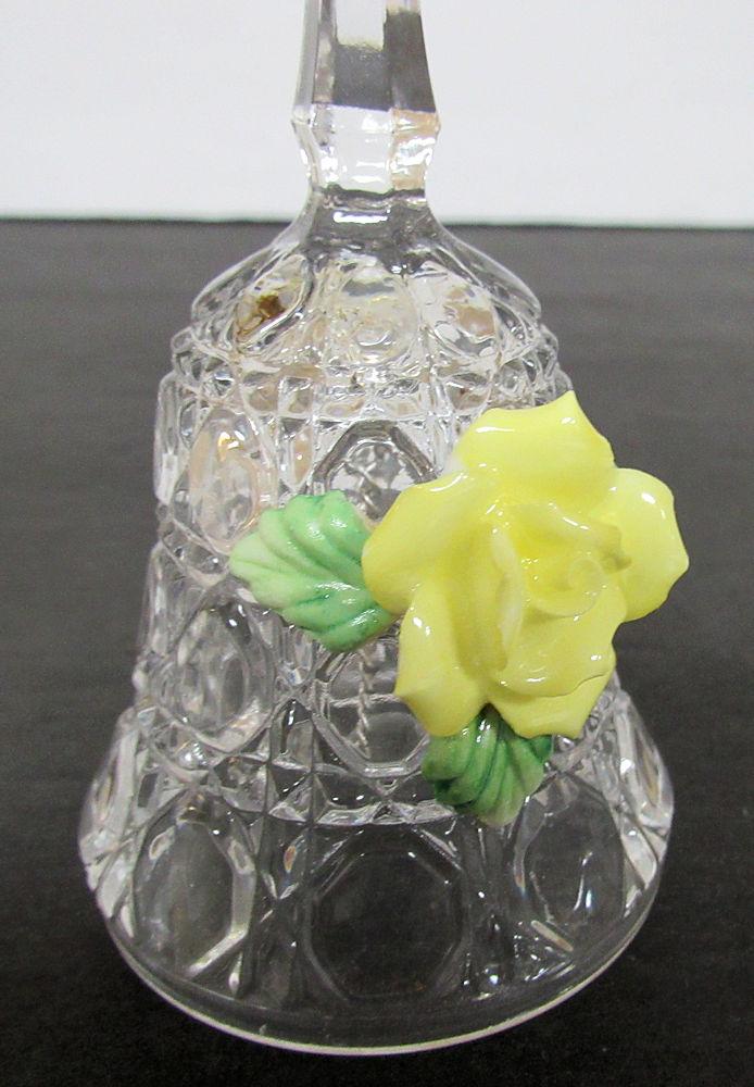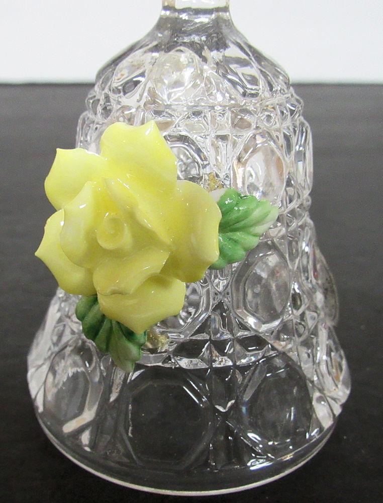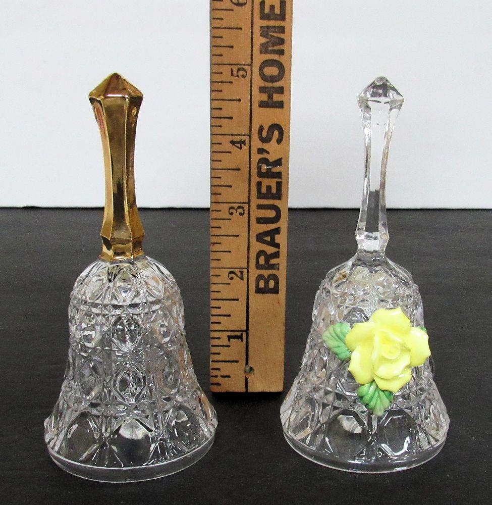 2 Vintage Small Pressed Glass Bells, One With Applied Yellow Rose, Taiwan