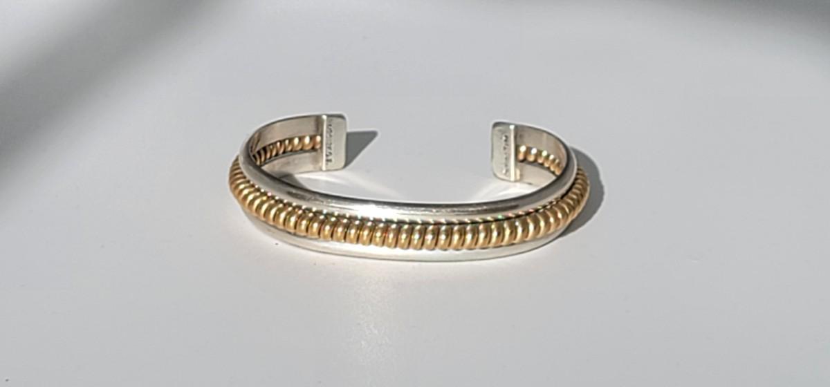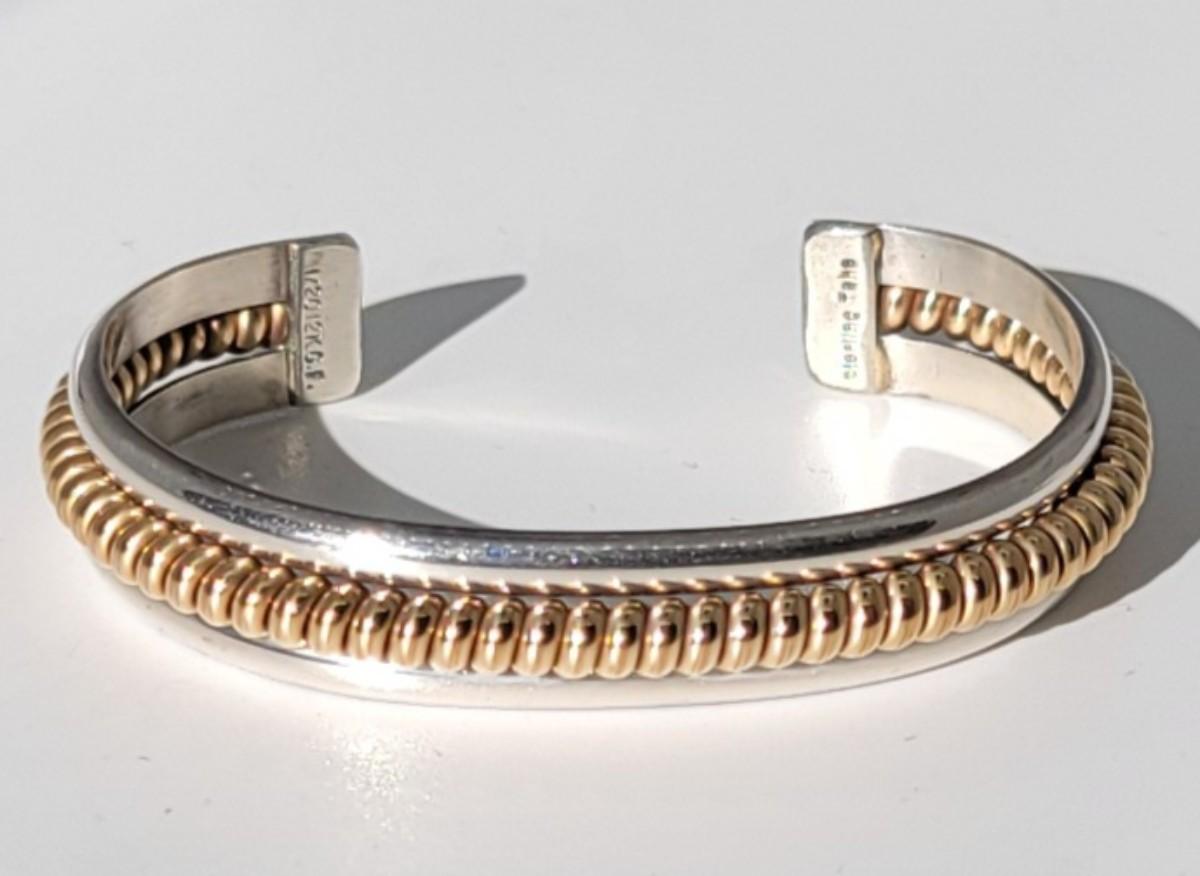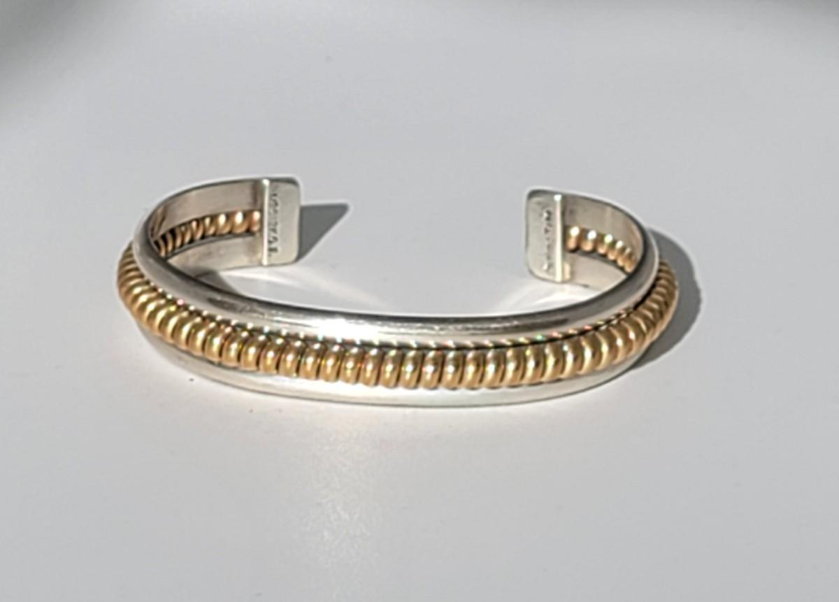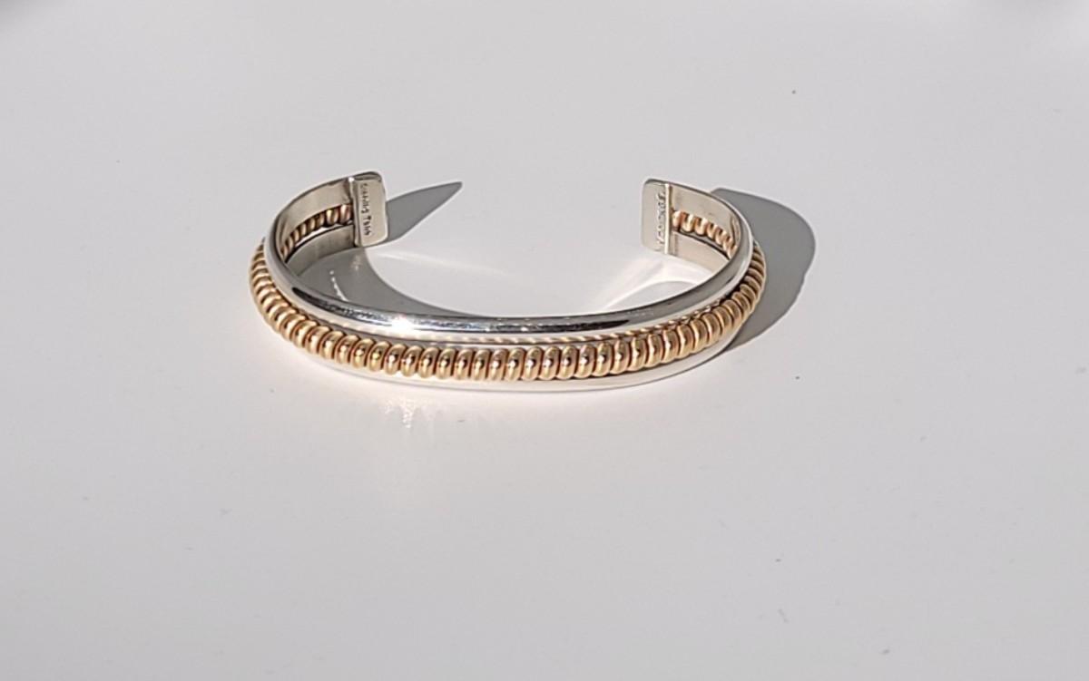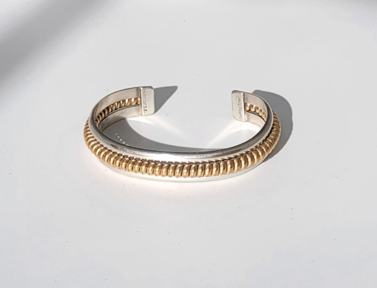 2: Vintage Native American Two Tone Cuff Bracelet Silver: 1/20 12k G.F. (gold fill coil center marked Sterling) Tahe