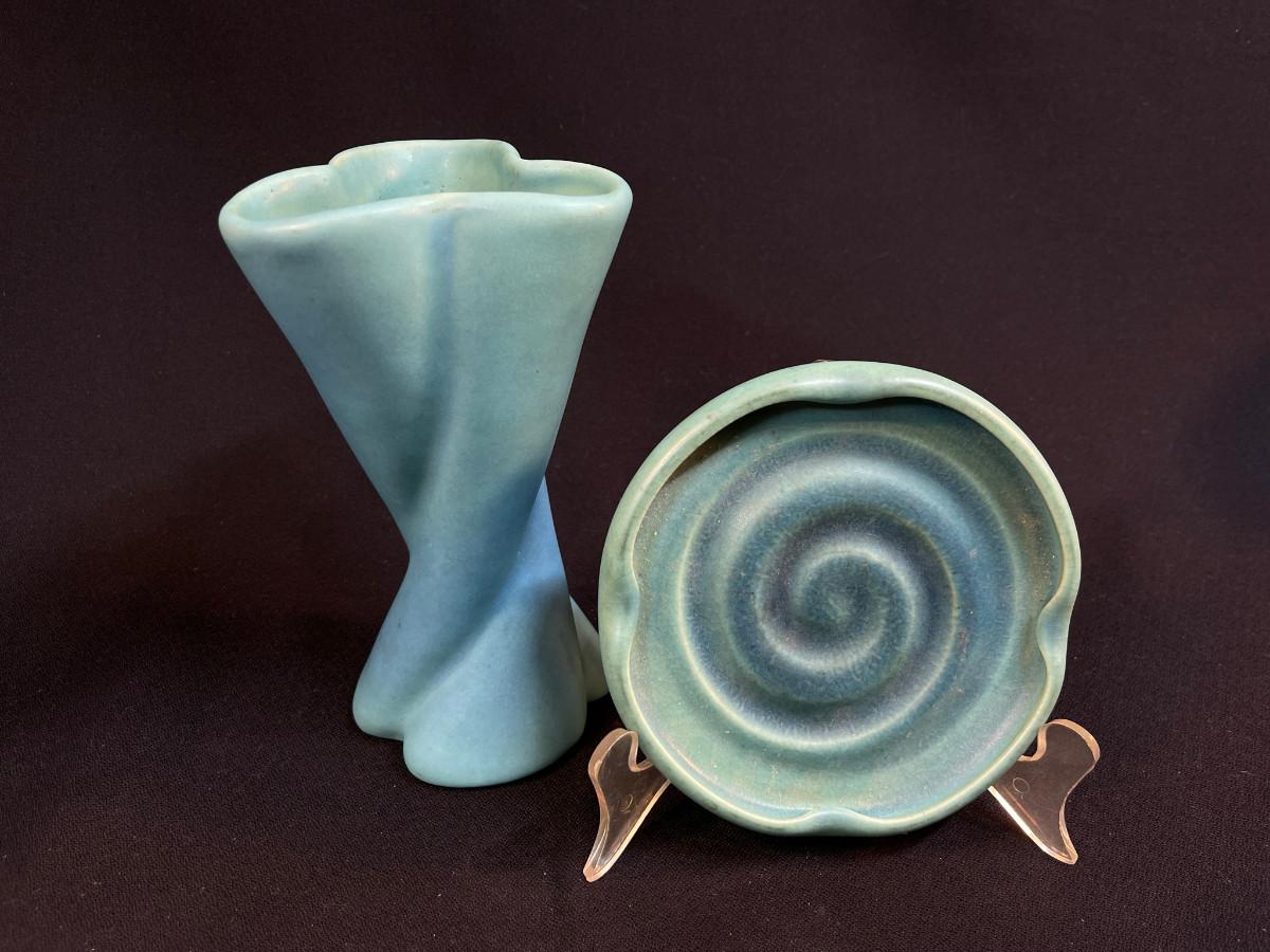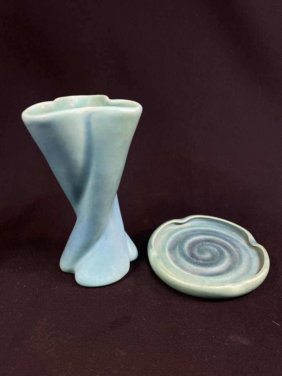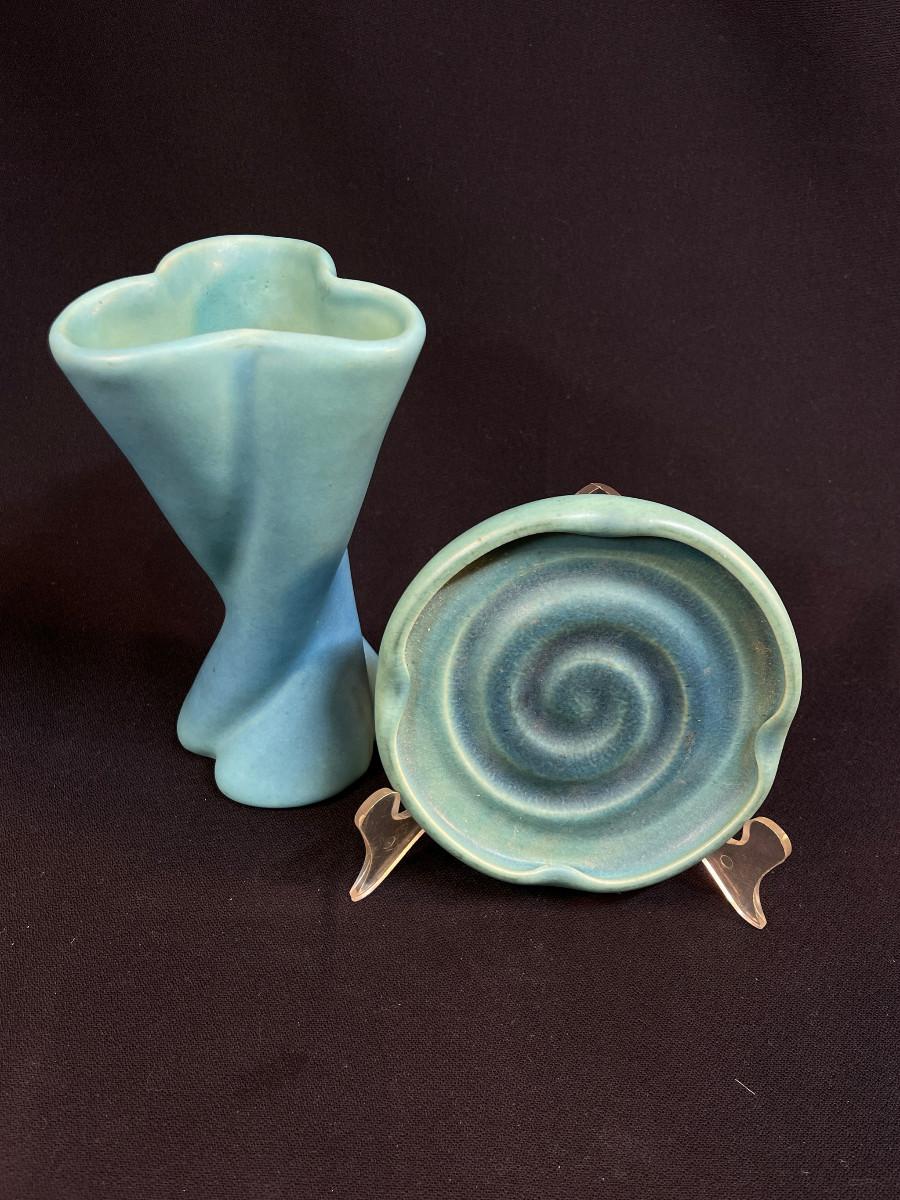 The subject item is comprised of two vintage Van Briggle, Ming Blue pieces. The rare shallow ashtray is detailed with a swirl interior and gently folded edging. The vase is a twisted tri-form. Both pieces are hallmarked and in good condition with no exterior dings, cracks, or marring of any kind.