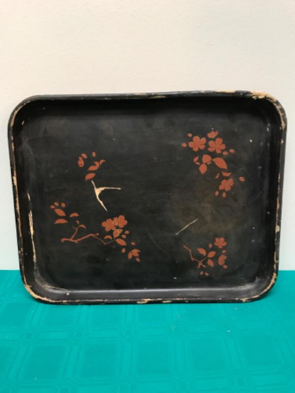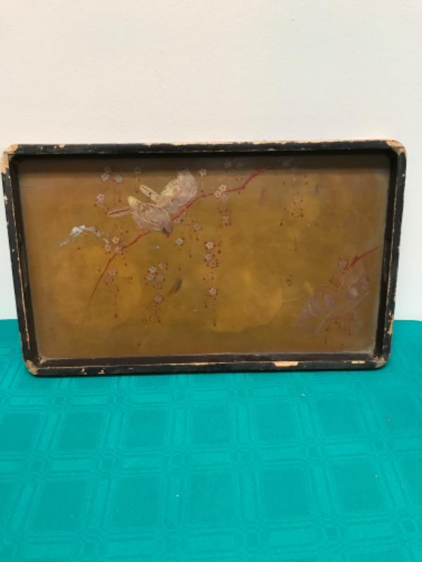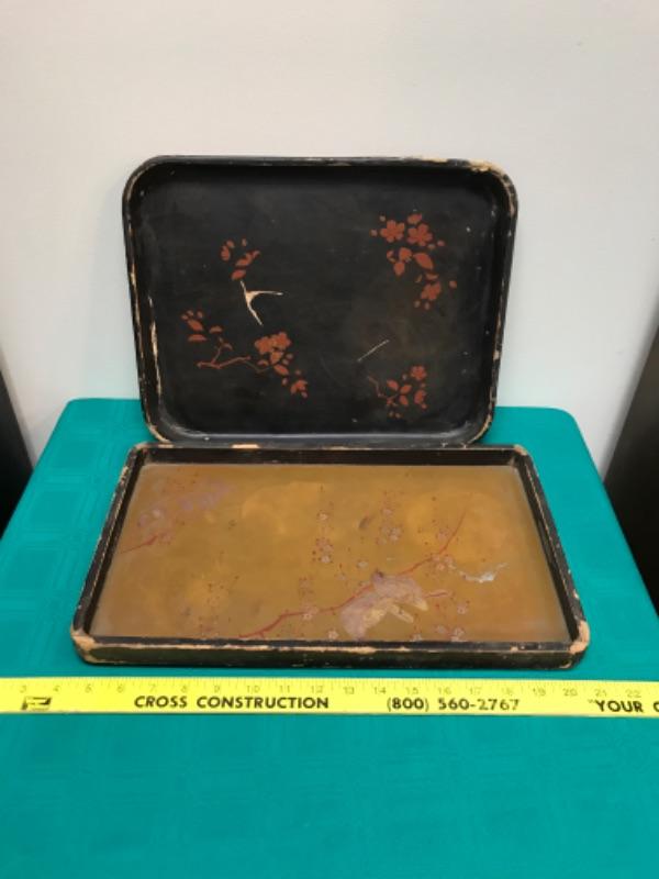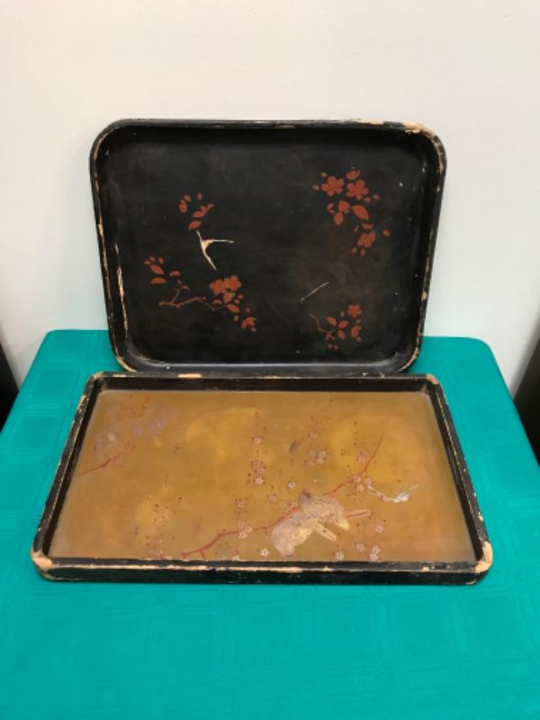 2 Vintage Wooden Oriental Hand-Painted Serving Trays