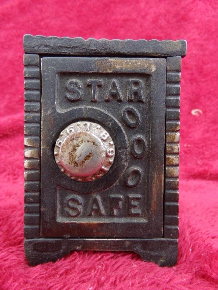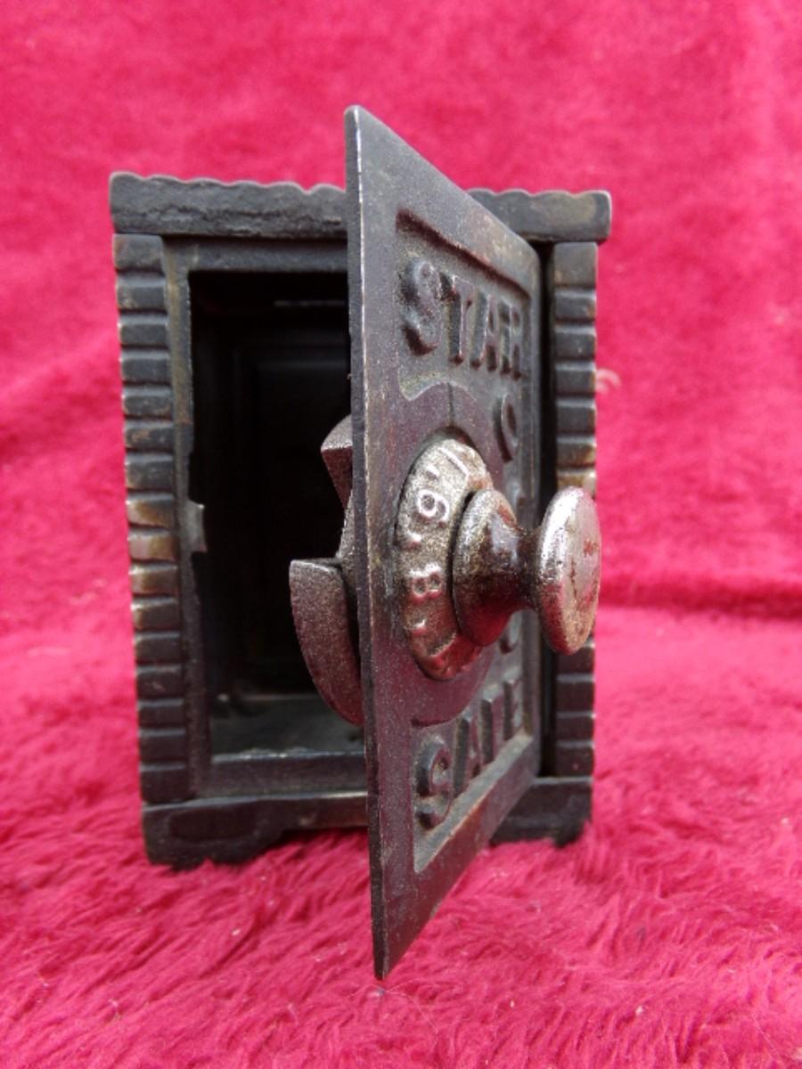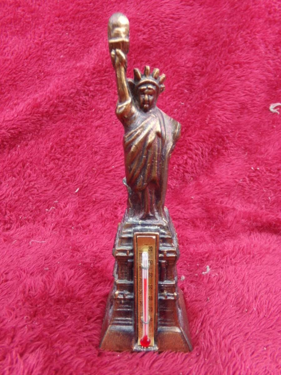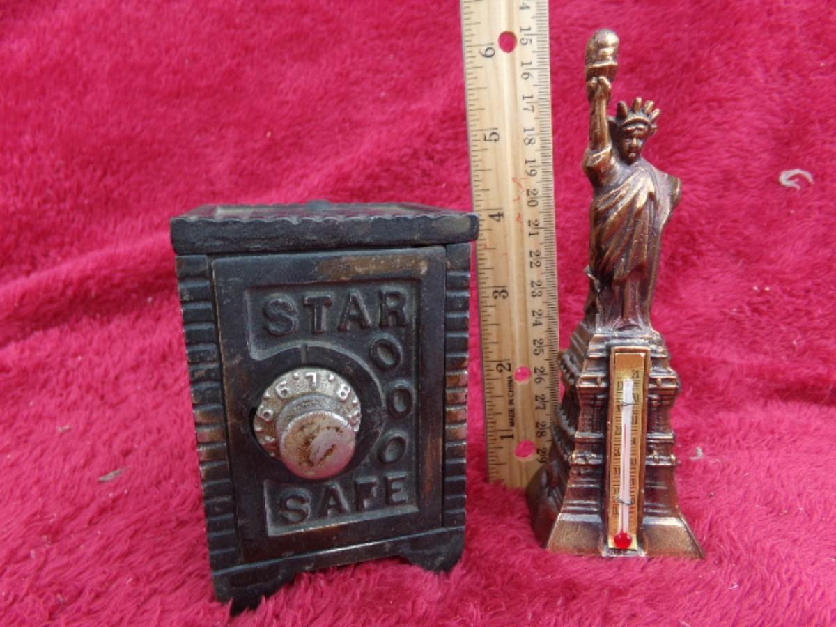 TWO VTG/antique cast metal items. Replica of the Statue of Liberty with a themometer on the front, must have been a tourist souvenir. The other is a childs’ coin bank that you open the safe door to retrieve your coins. Bank made by MUDD MFG. CO. Chicago USA.