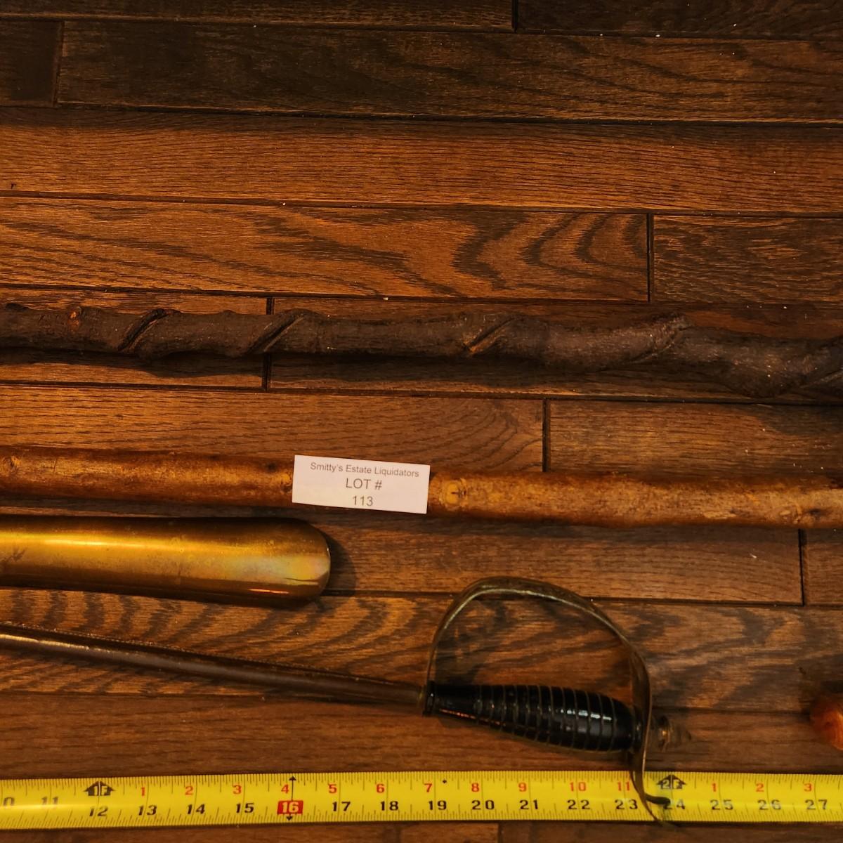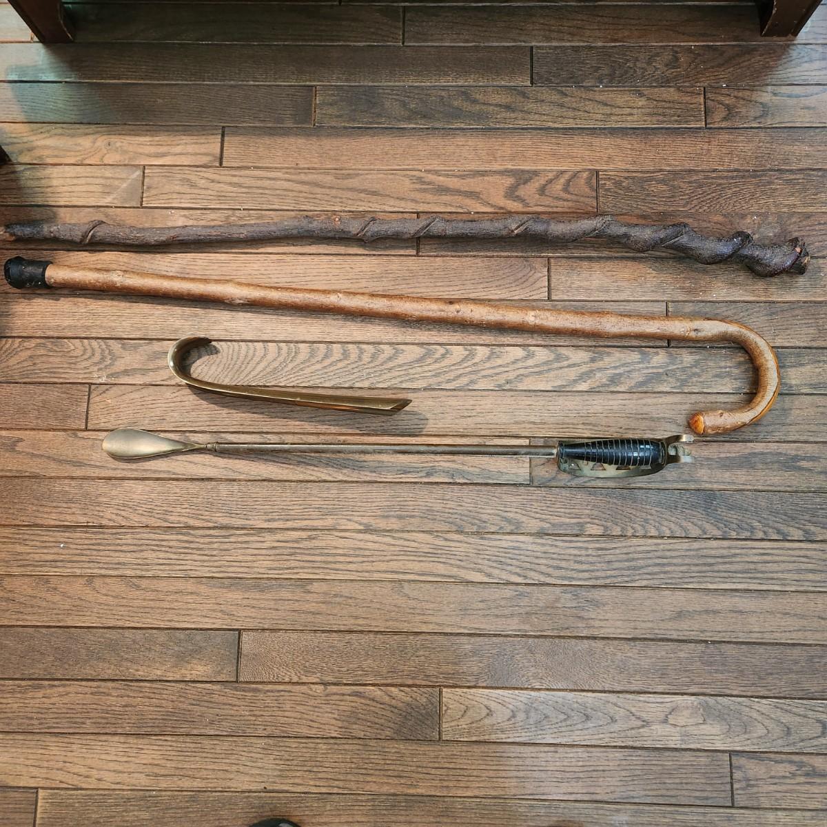 2 Walking Sticks Canes 2 Shoe Horns 1 Very heavy Brass 1 w a Sword handle