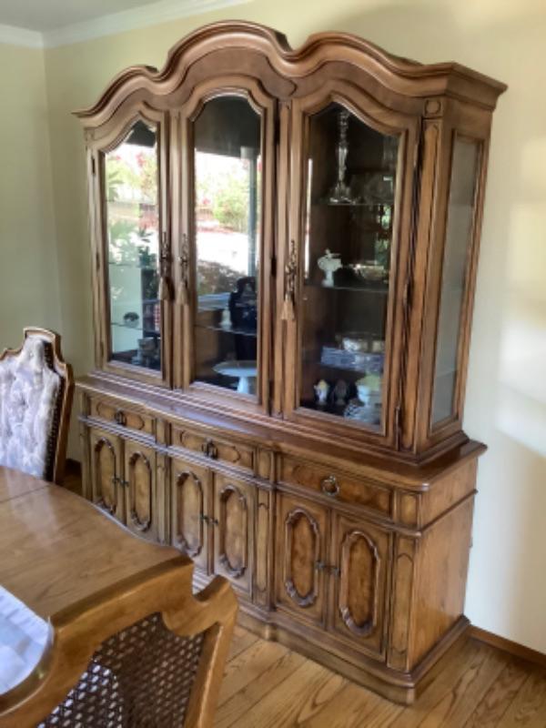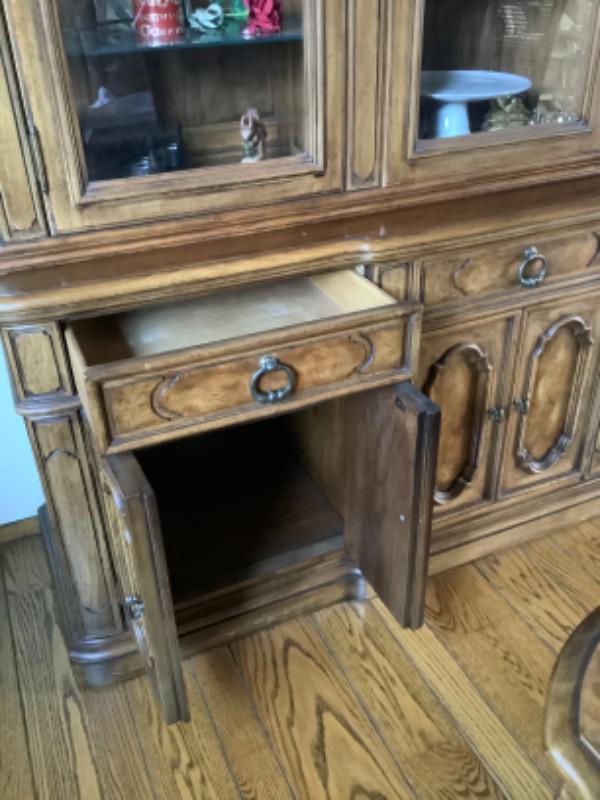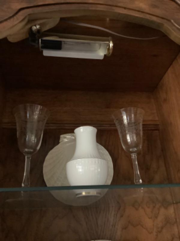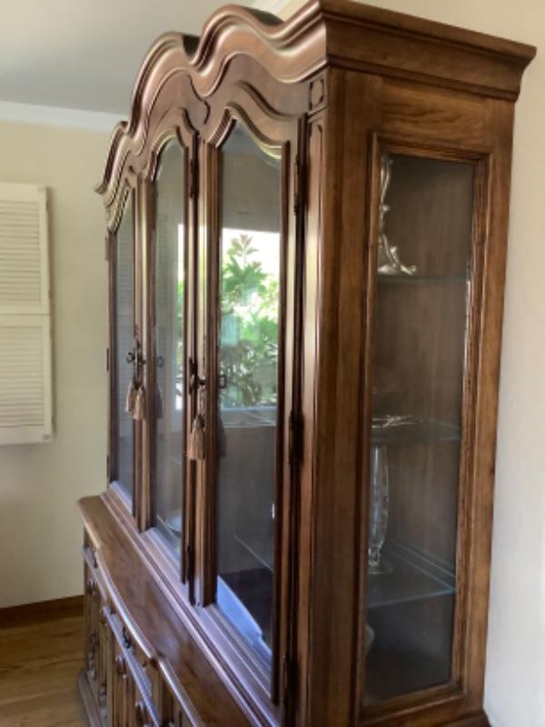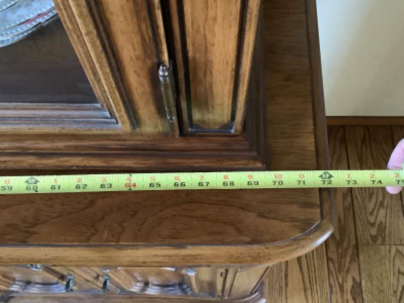 Excellent china hutch with glass shelves. Lights work in each apartment. Measurements in photos