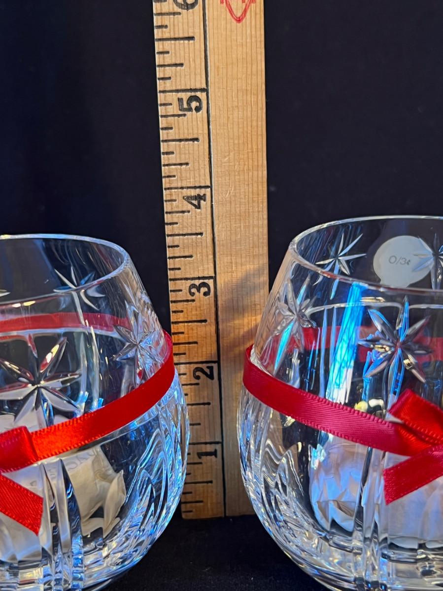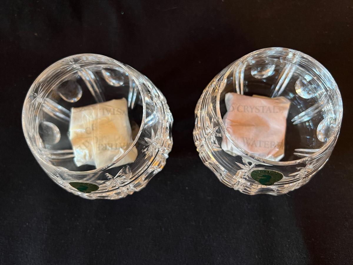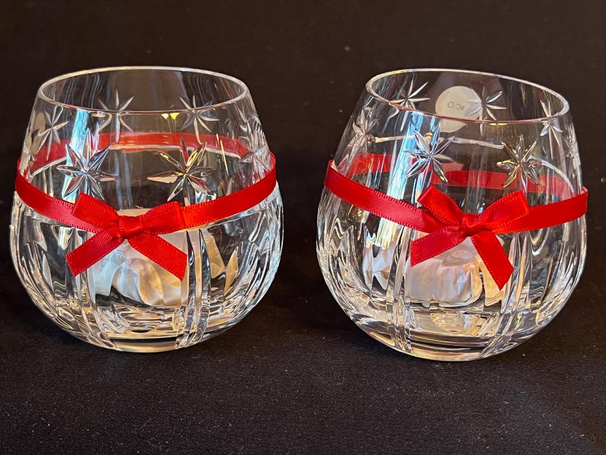 Set of 2 Waterford Christmas Holiday Crystal Votive Vases. Unused! Votives are still wrapped in tissue. Red, removable holiday ribbon in perfect condition. 3 1/2" tall Stickers intact.