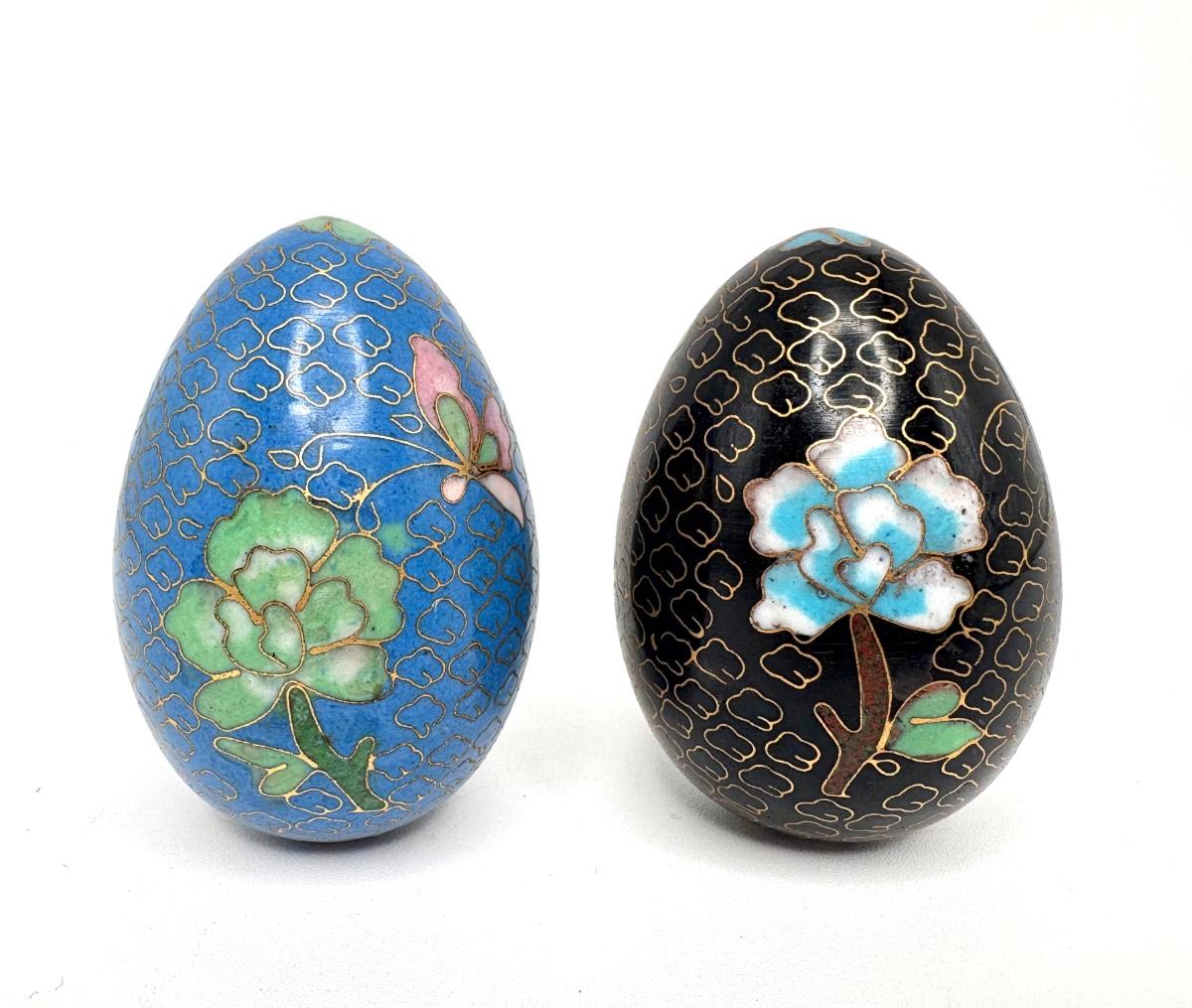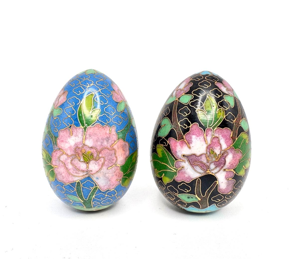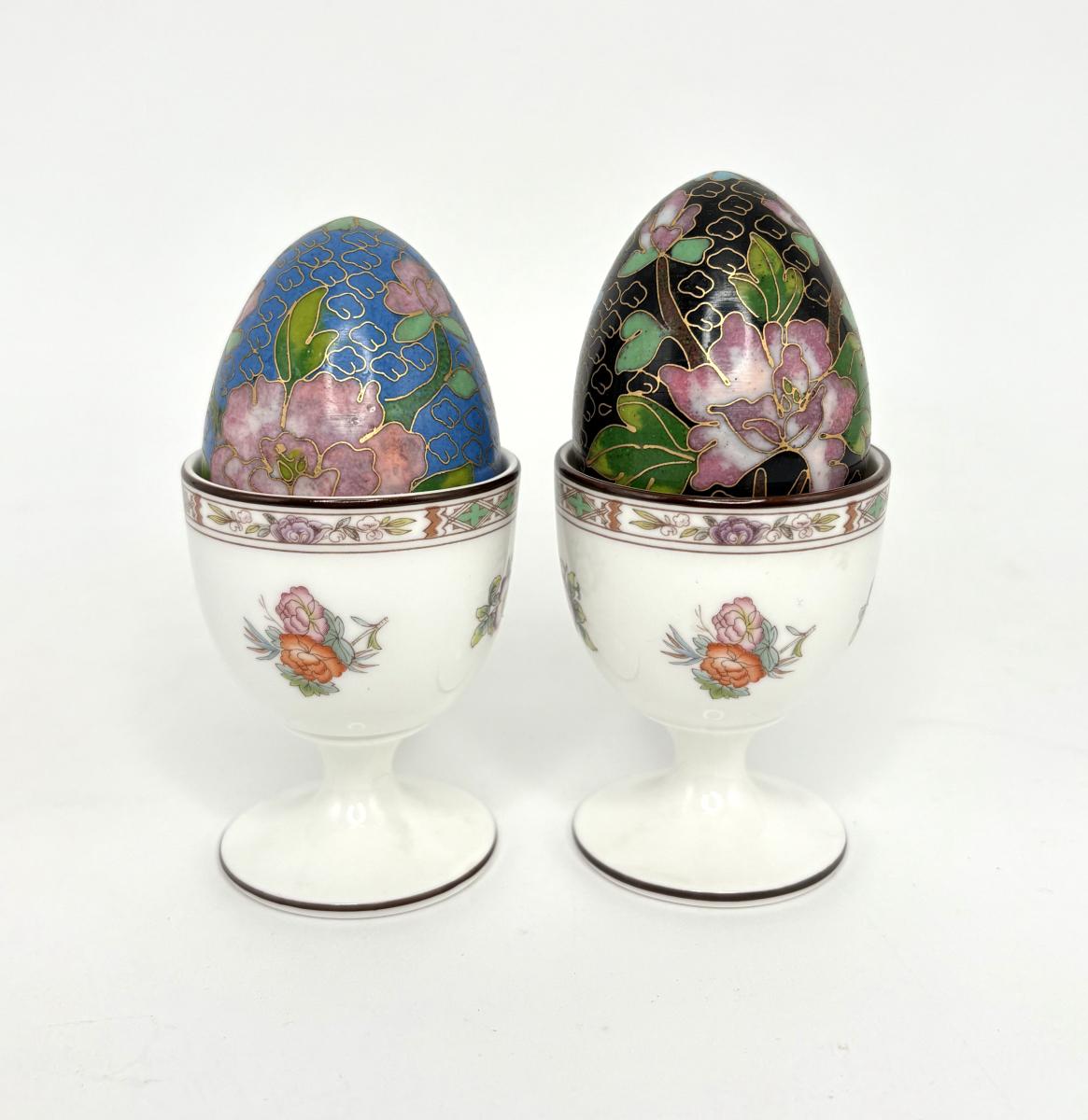 2 Wedgwood Egg Cups + 2 Vintage Cloissone Enamel Eggs