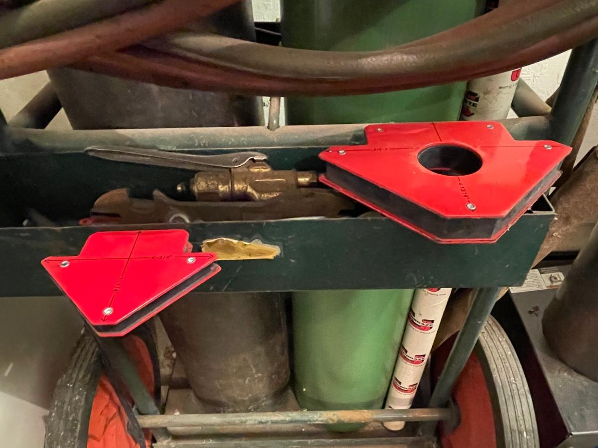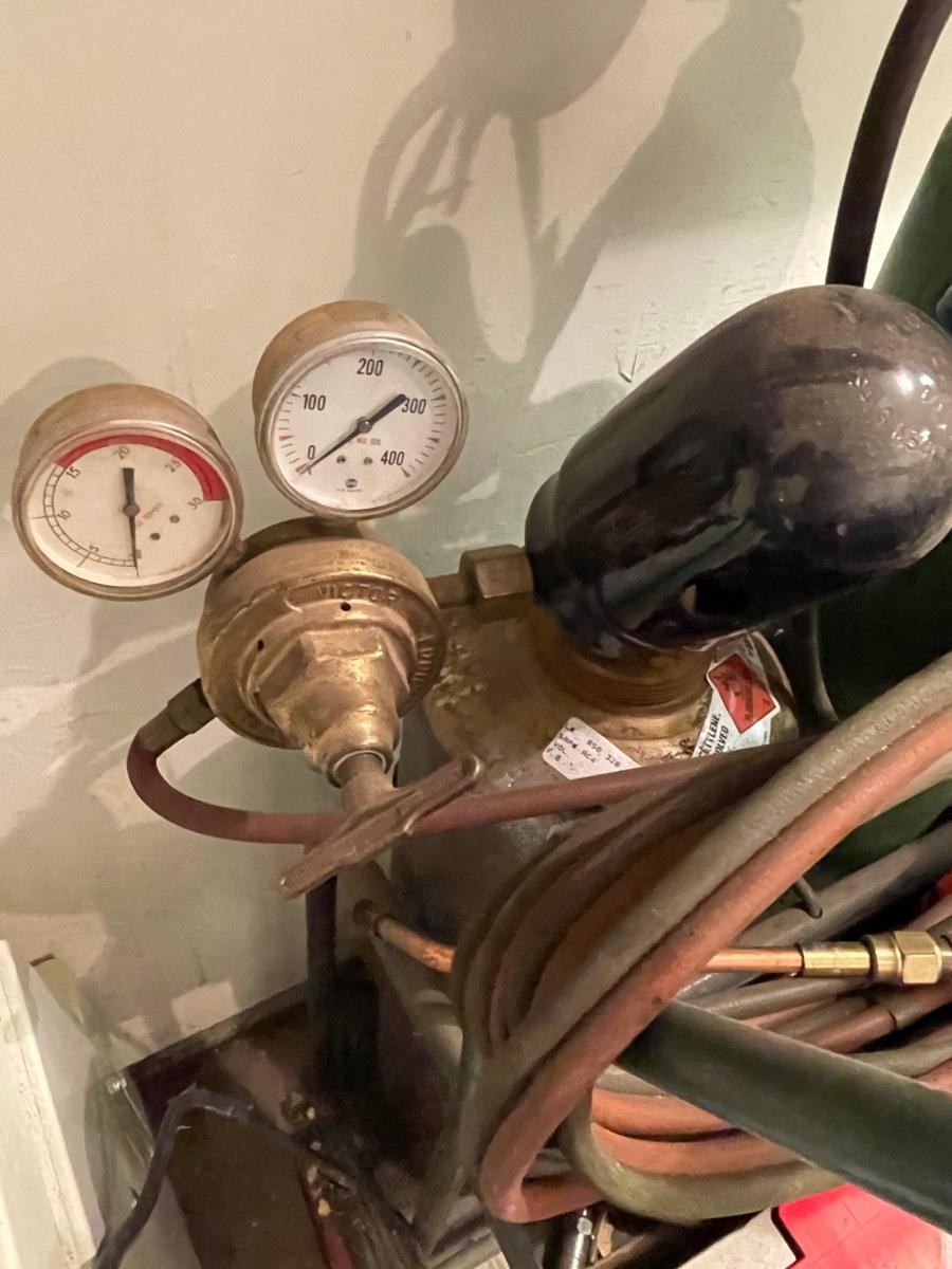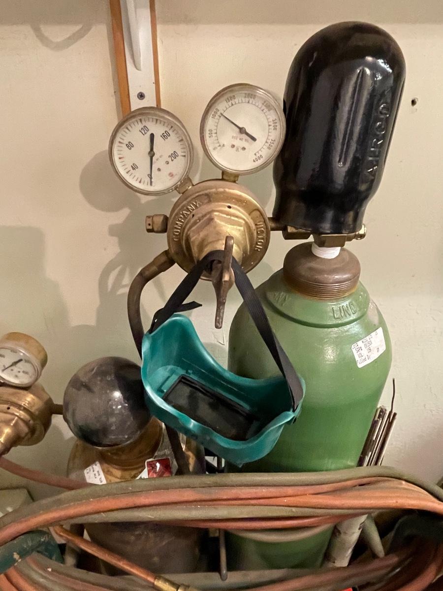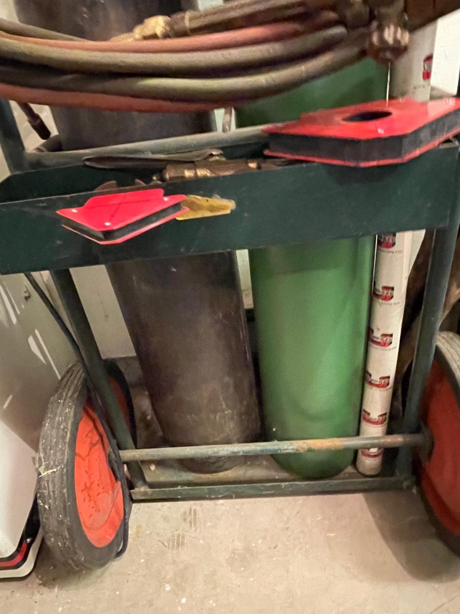 2 Oxygen/Acetylene tanks unknown how full-also nice welding mask & goggles, all cords & gauges and 2 magnet pieces all as shown.