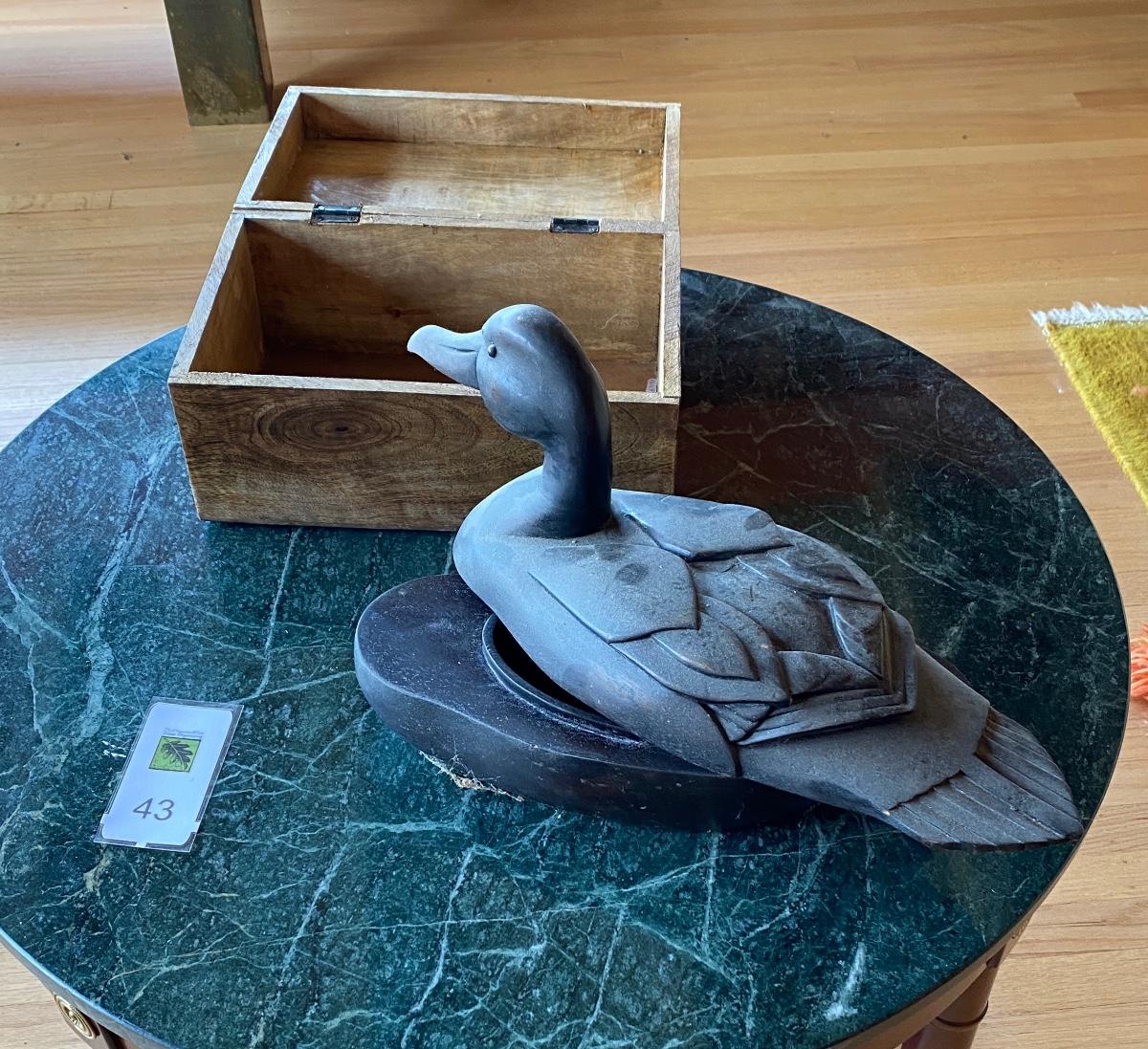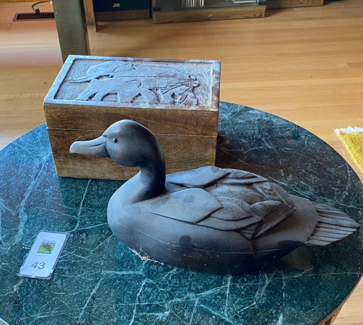 includes a duck and a box with elephants carved on the lid. 9" x 15"