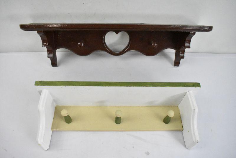 2 Wood Shelves with Pegs: Brown w/ Heart & 2 Pegs, Painted with 3 Pegs