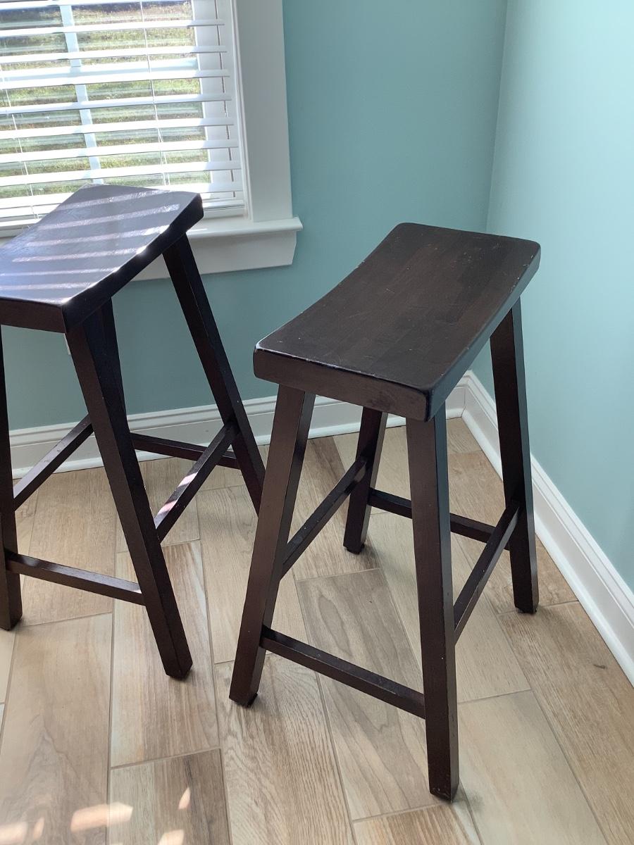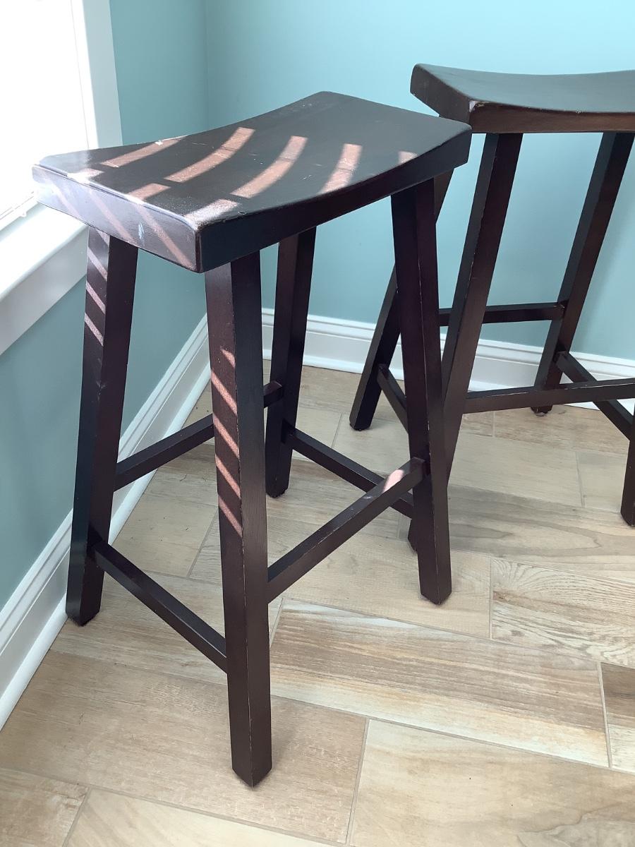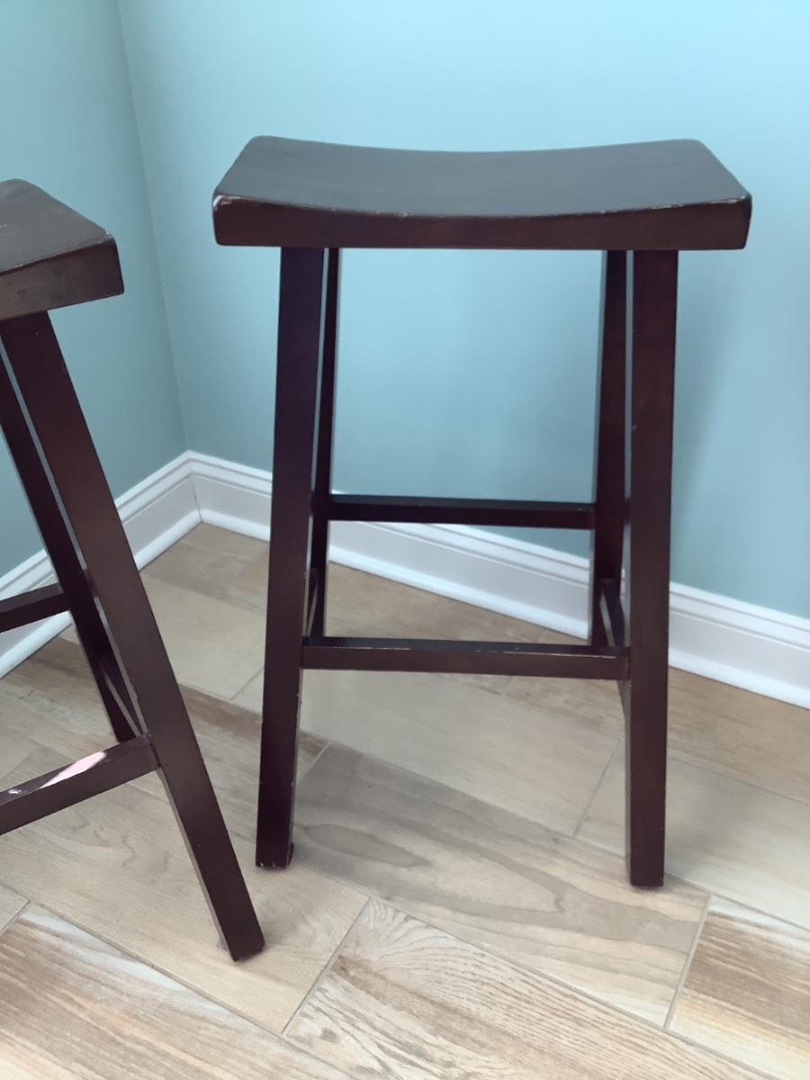 2 wooden bar stools, darker brown, 1 rung, 29”H, 17 1/2”x9”seat, base 16”x18”