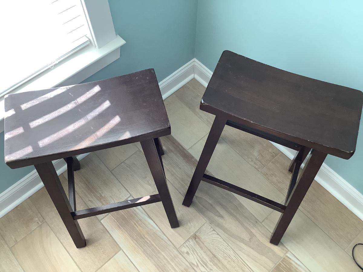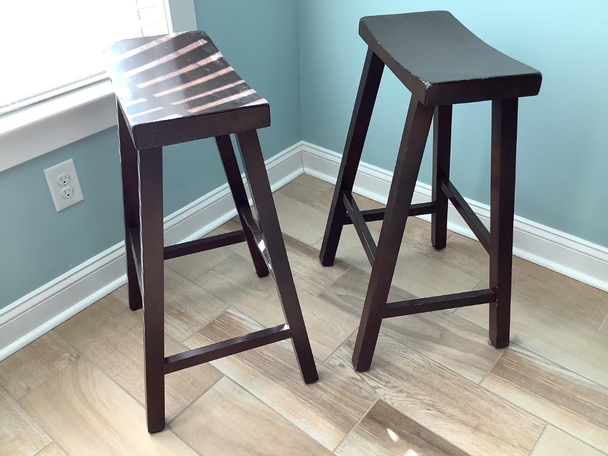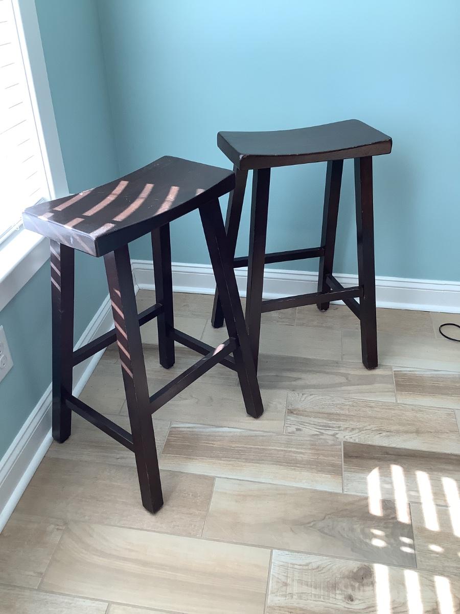 2 wooden bar stools, darker brown, 1 rung, 29”H, 17 1/2”x9”seat, base 16”x18”
