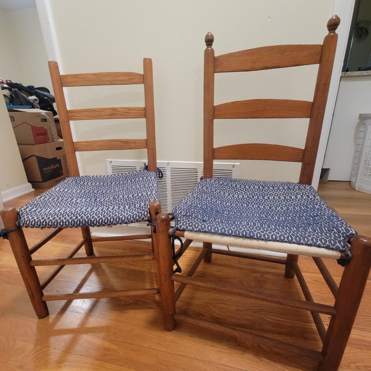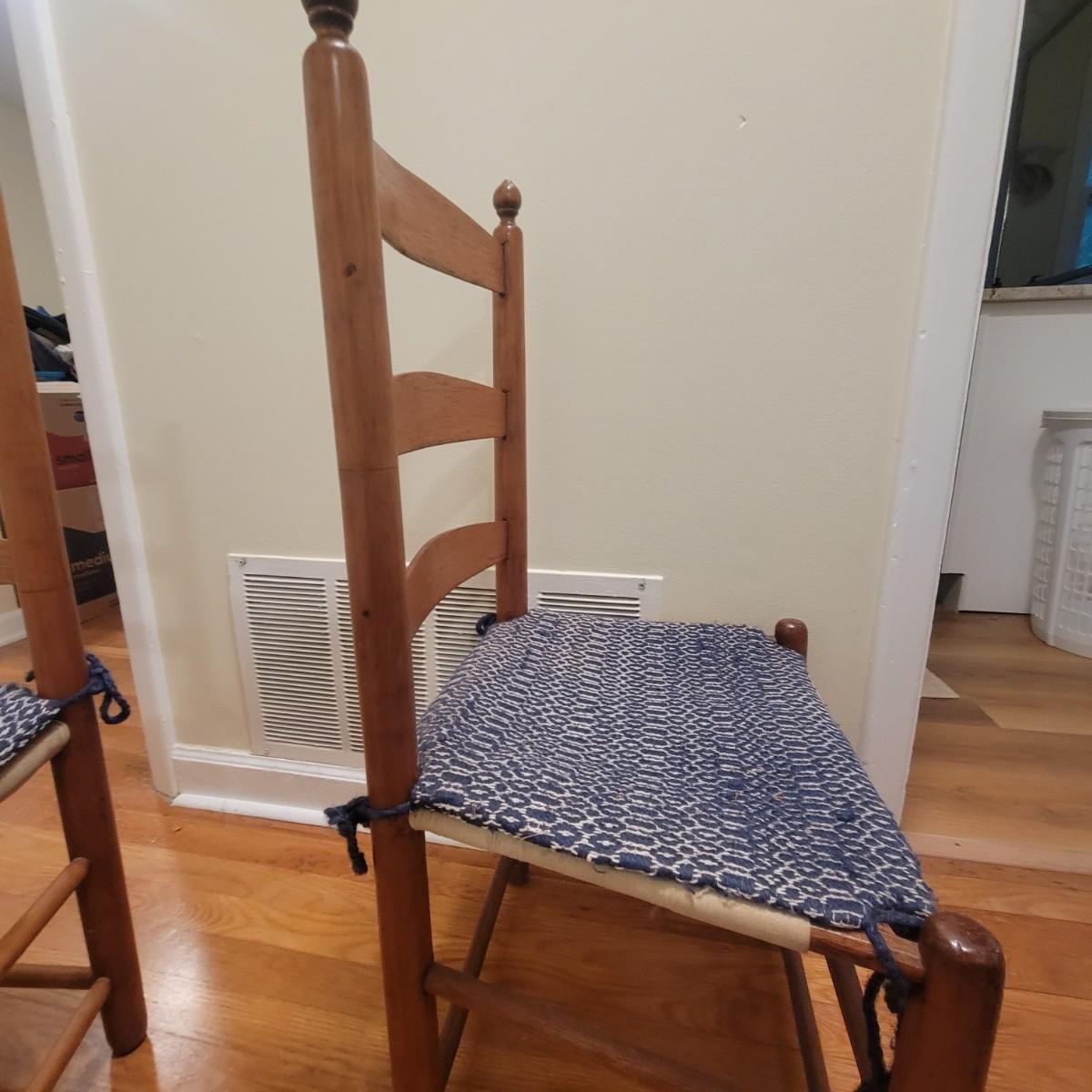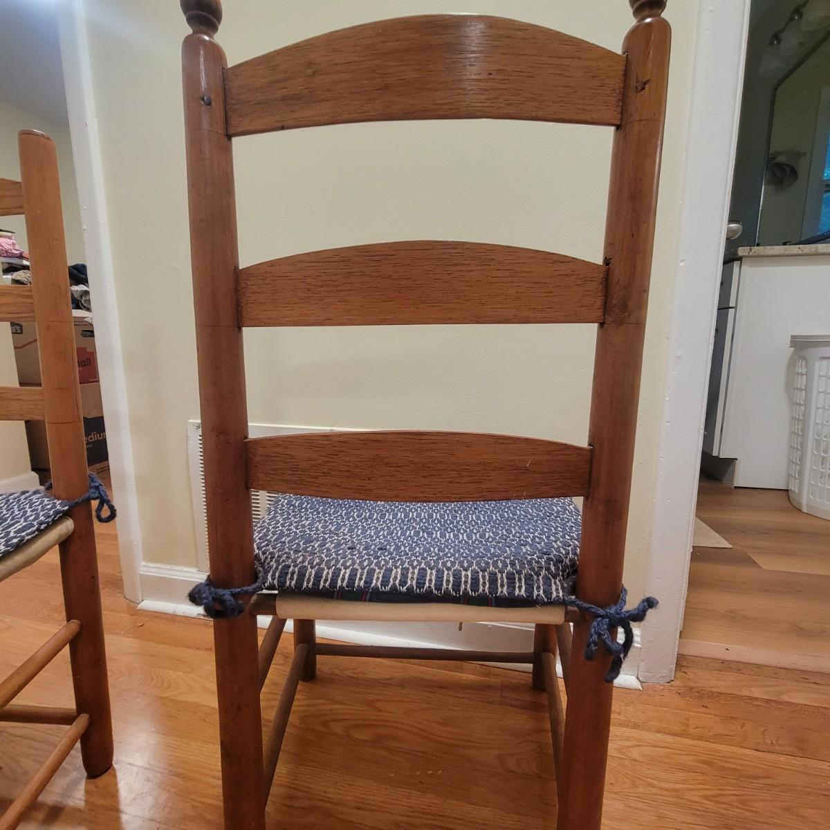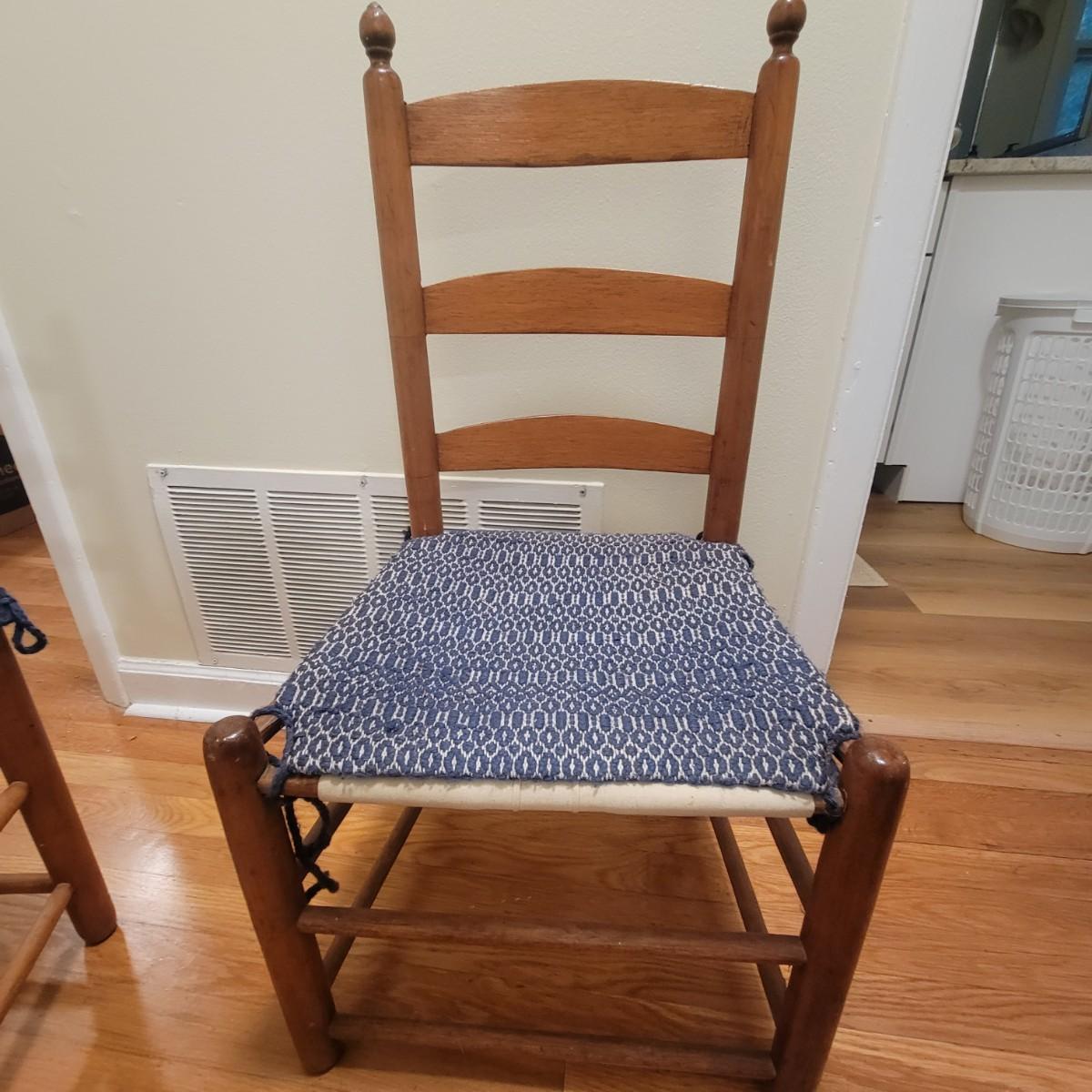 Two very similar wooden chairs with laced linen seat support and fabric seat cushions. Chairs are the similar except one has an extra detail on the top of the rear legs and a slightly different size of the back braces. Both chairs have same seat height of 14.5". Tallest chair measures approximately 18" x 15" x 34.5" Local pickup only