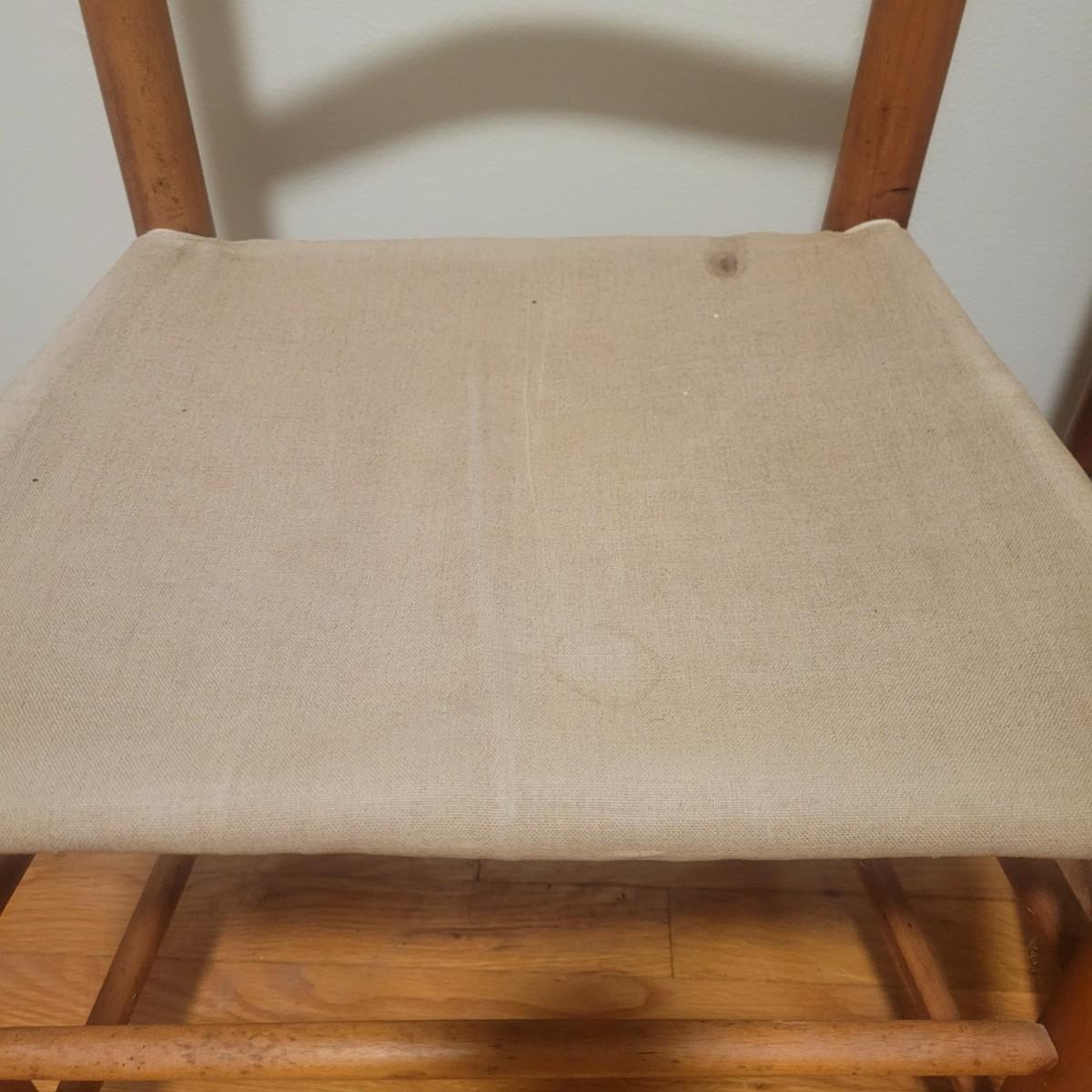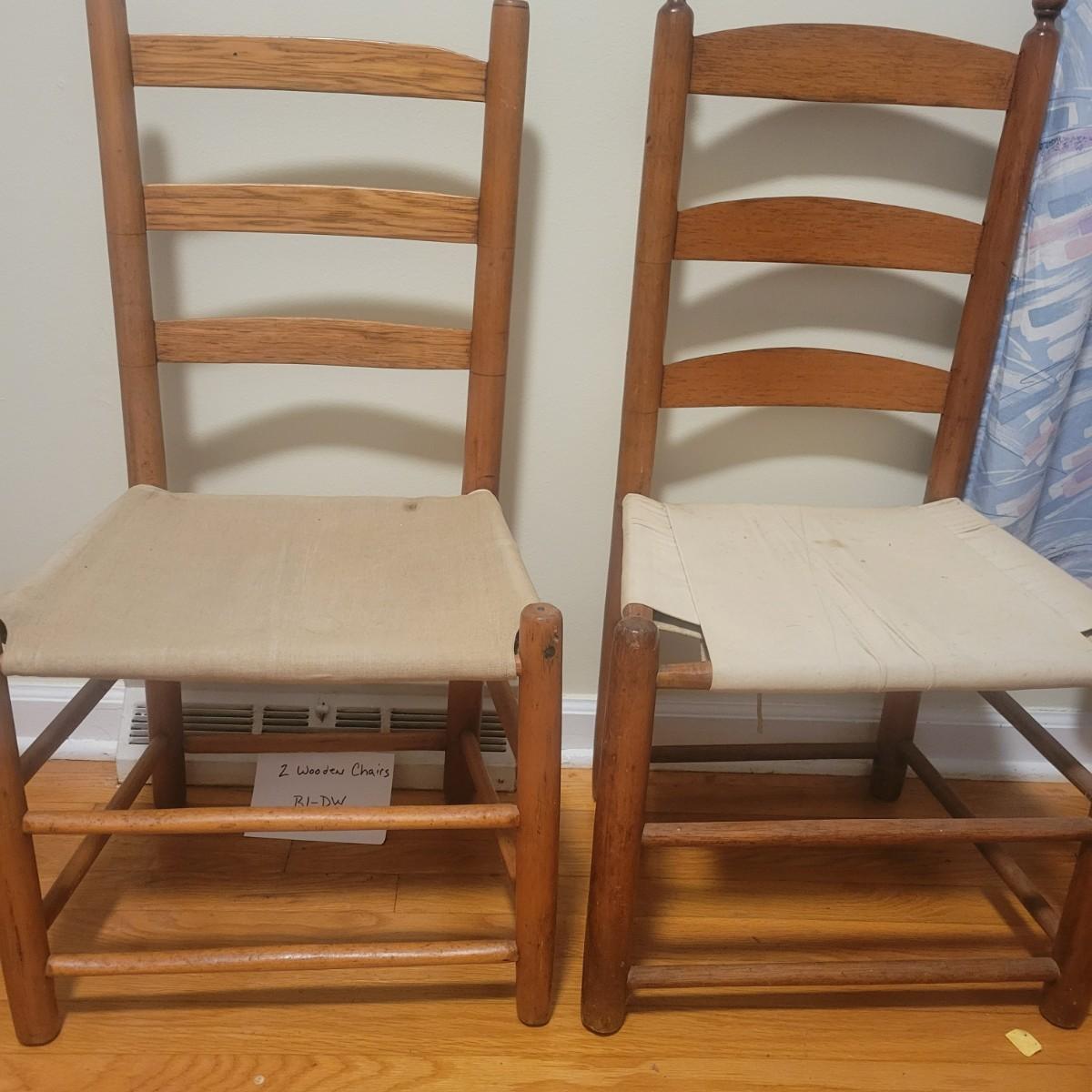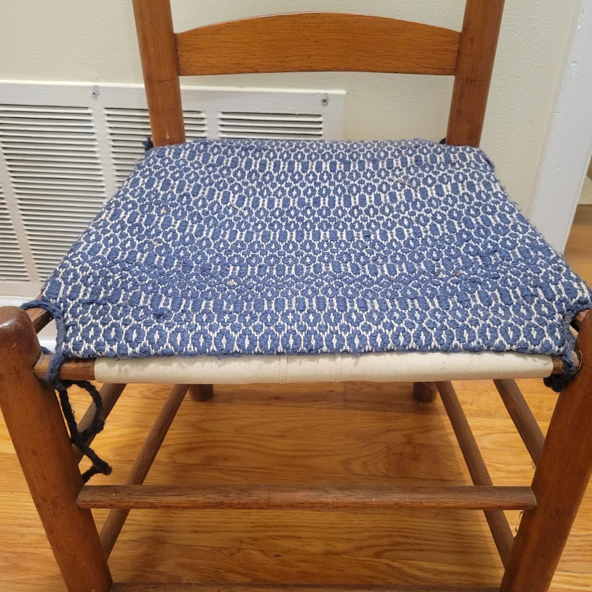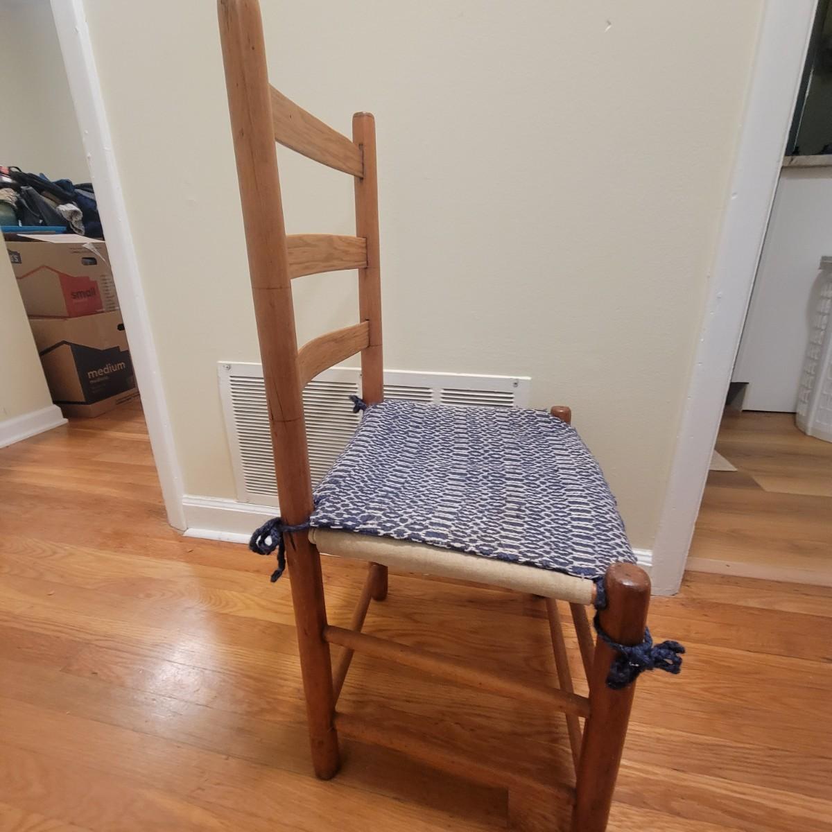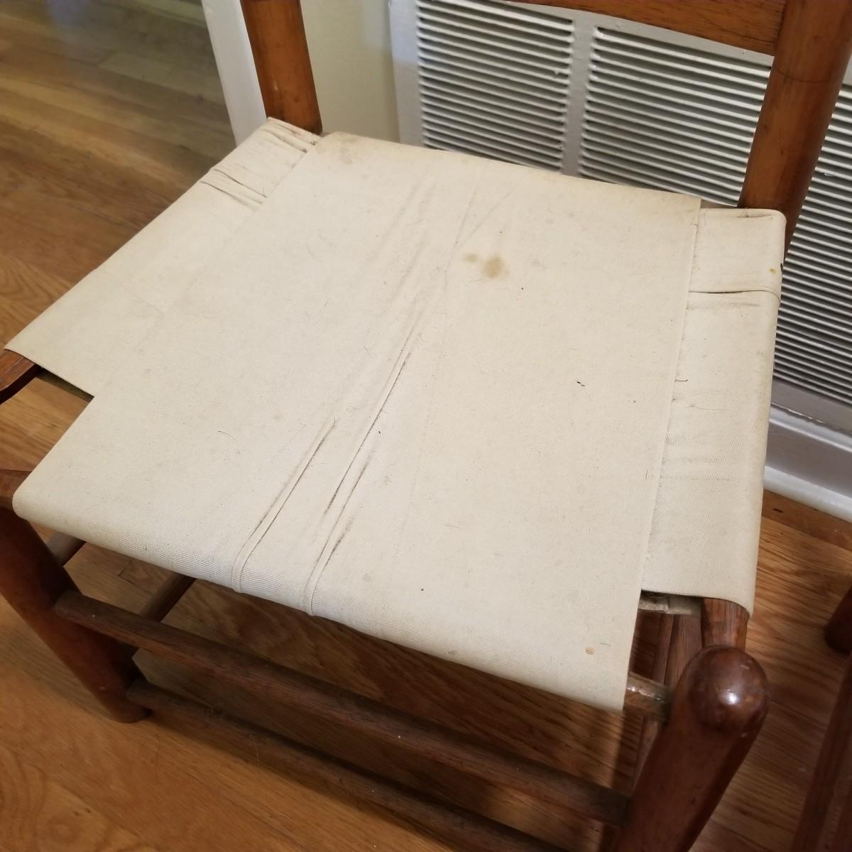 Two very similar wooden chairs with laced linen seat support and fabric seat cushions. Chairs are the similar except one has an extra detail on the top of the rear legs and a slightly different size of the back braces. Both chairs have same seat height of 14.5". Tallest chair measures approximately 18" x 15" x 34.5" Local pickup only