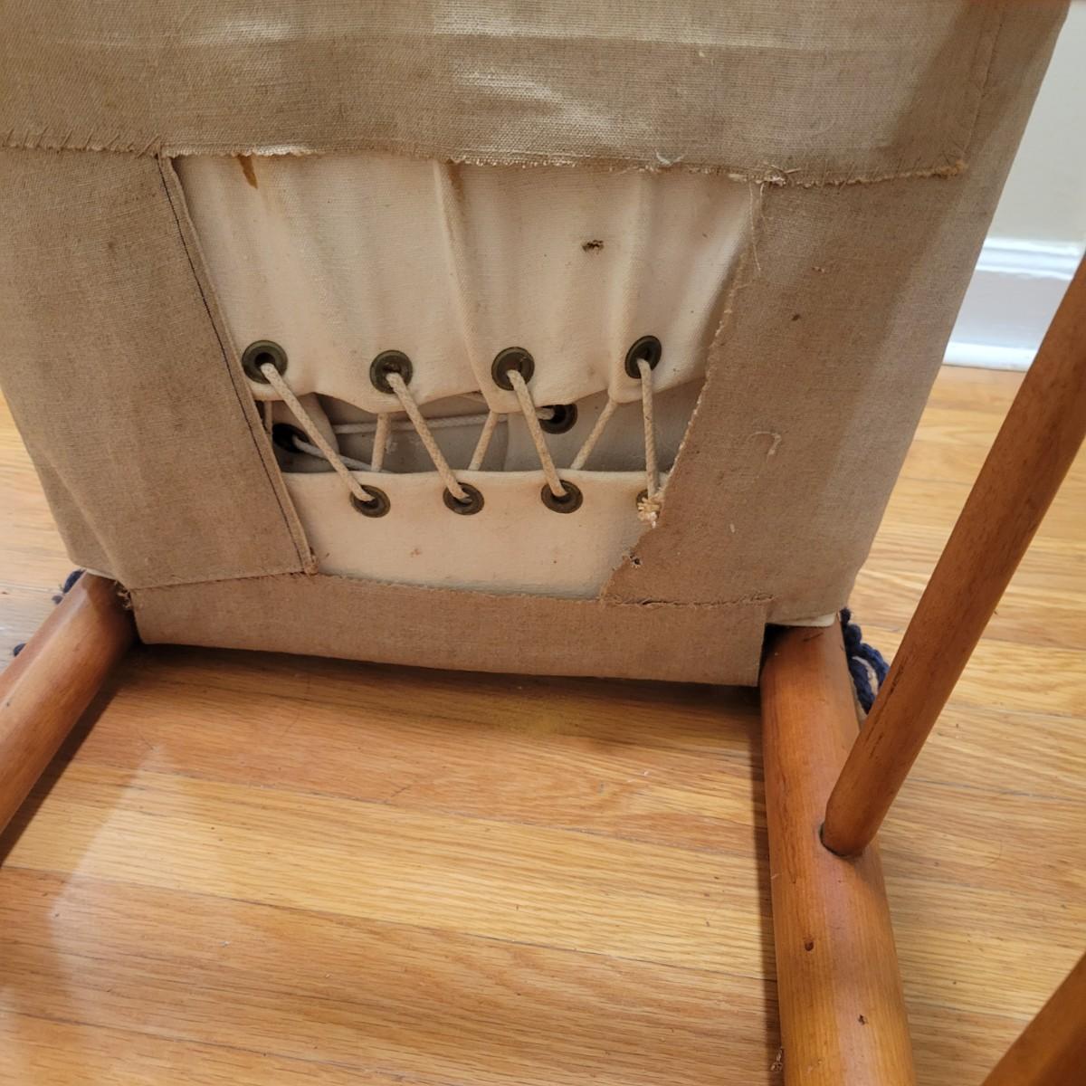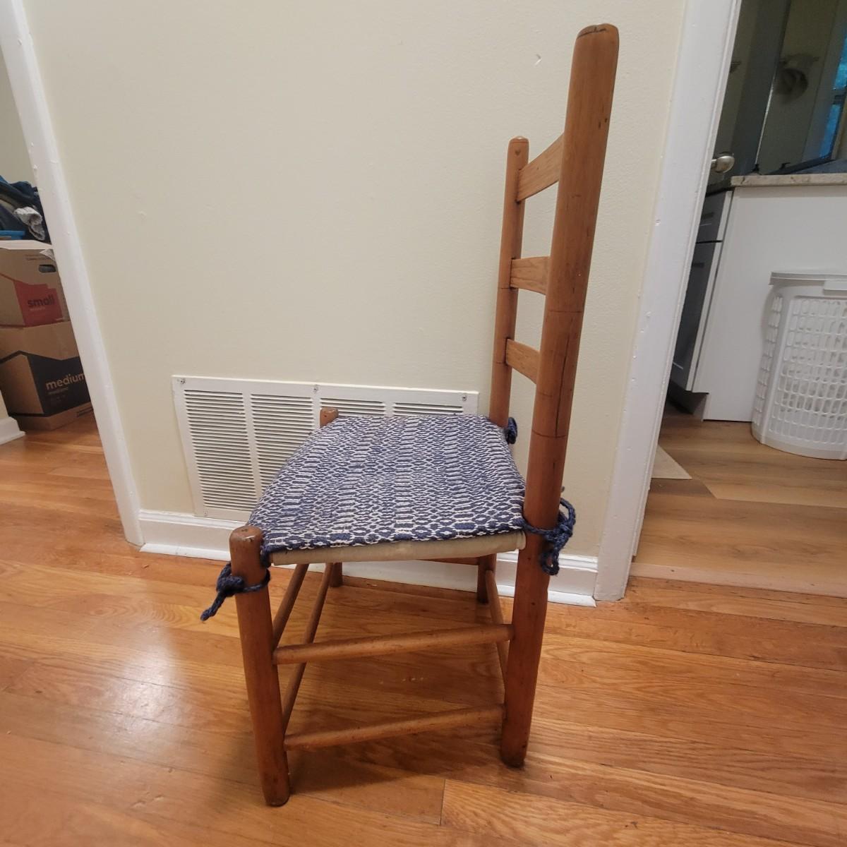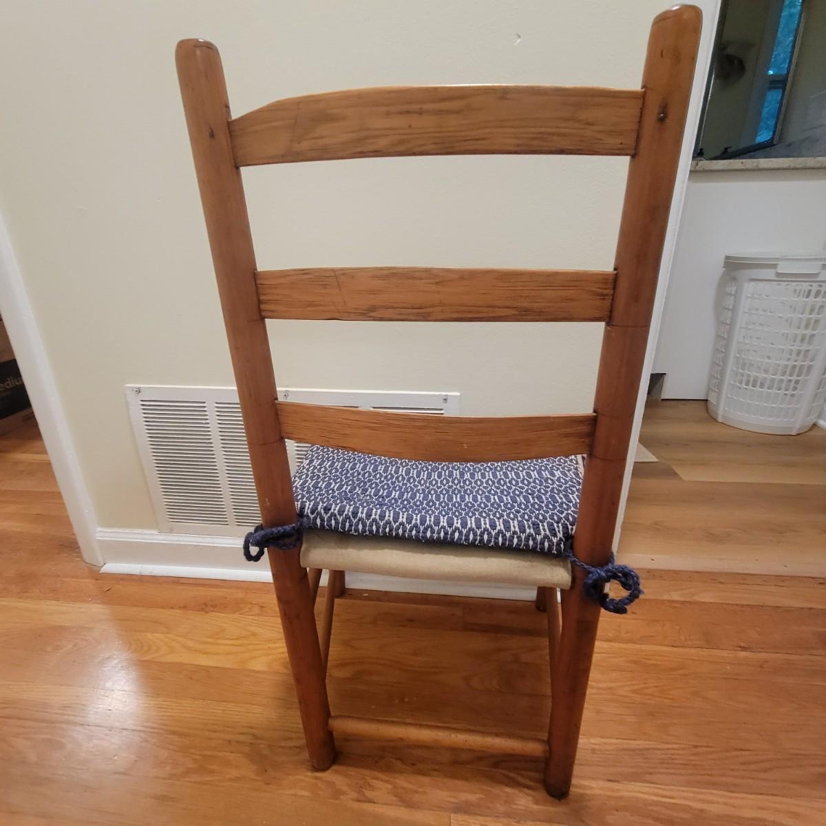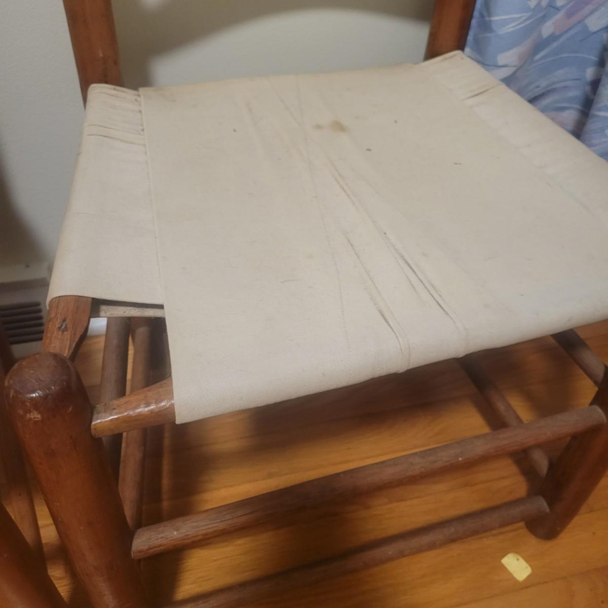 Two very similar wooden chairs with laced linen seat support and fabric seat cushions. Chairs are the similar except one has an extra detail on the top of the rear legs and a slightly different size of the back braces. Both chairs have same seat height of 14.5". Tallest chair measures approximately 18" x 15" x 34.5" Local pickup only