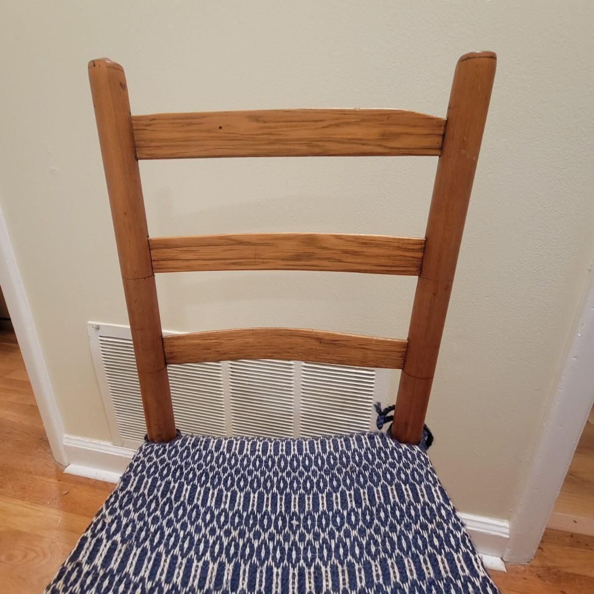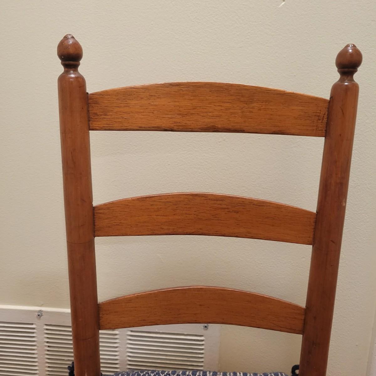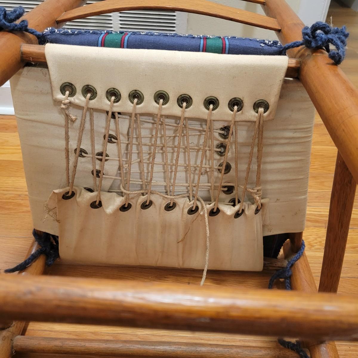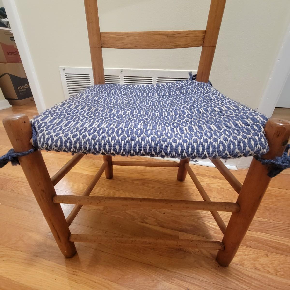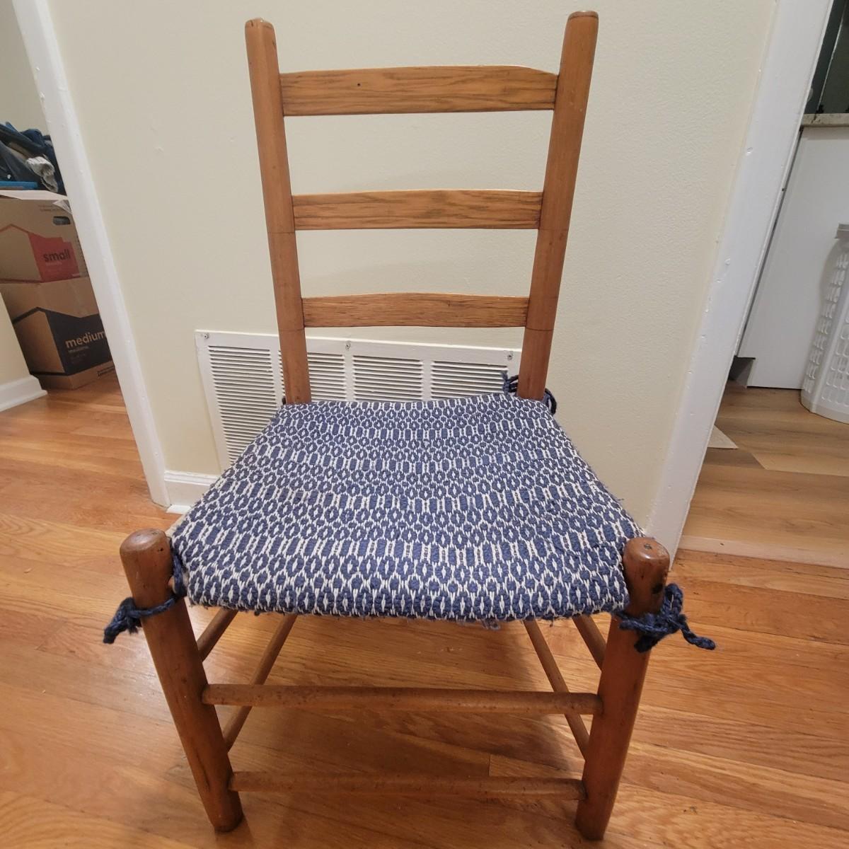 Two very similar wooden chairs with laced linen seat support and fabric seat cushions. Chairs are the similar except one has an extra detail on the top of the rear legs and a slightly different size of the back braces. Both chairs have same seat height of 14.5". Tallest chair measures approximately 18" x 15" x 34.5" Local pickup only