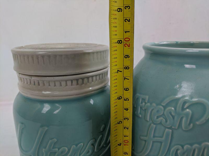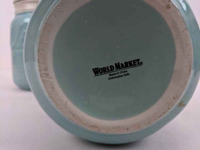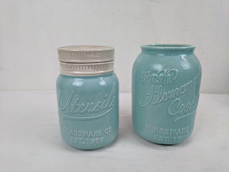 2 World Market Glass Utensil Holder & Cookie Jar, Light Blue