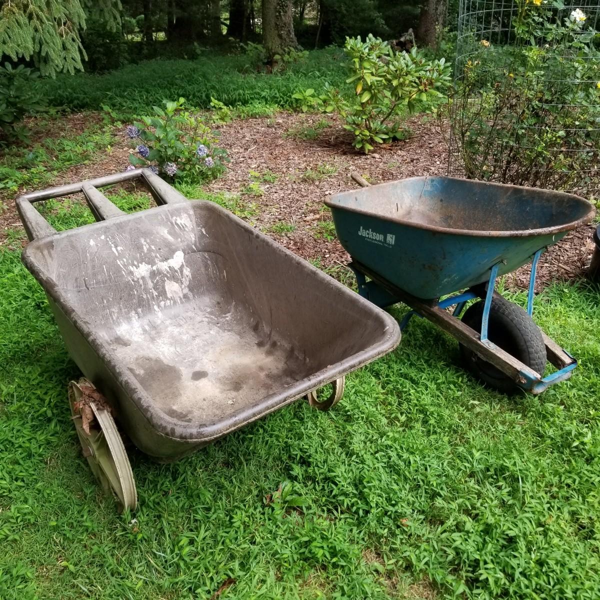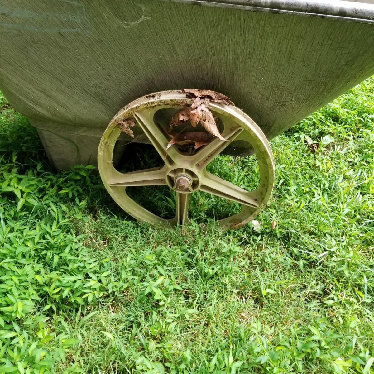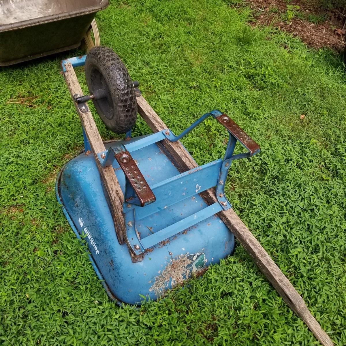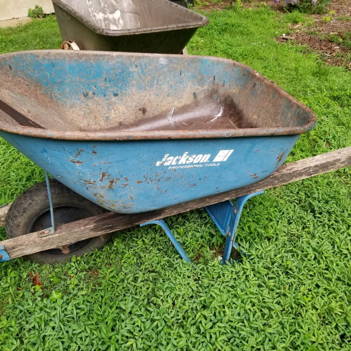 One Rubbermaid rolling yard cart and one Jackson wheelbarrow. The cart is composite resin, measures 28" x 58" x 25" and is missing its rubber tires, has rims only. The blue wheelbarrow is 25" x60" x26, has some rust and is missing one wooden handle. See photos for detail. Local pickup only.